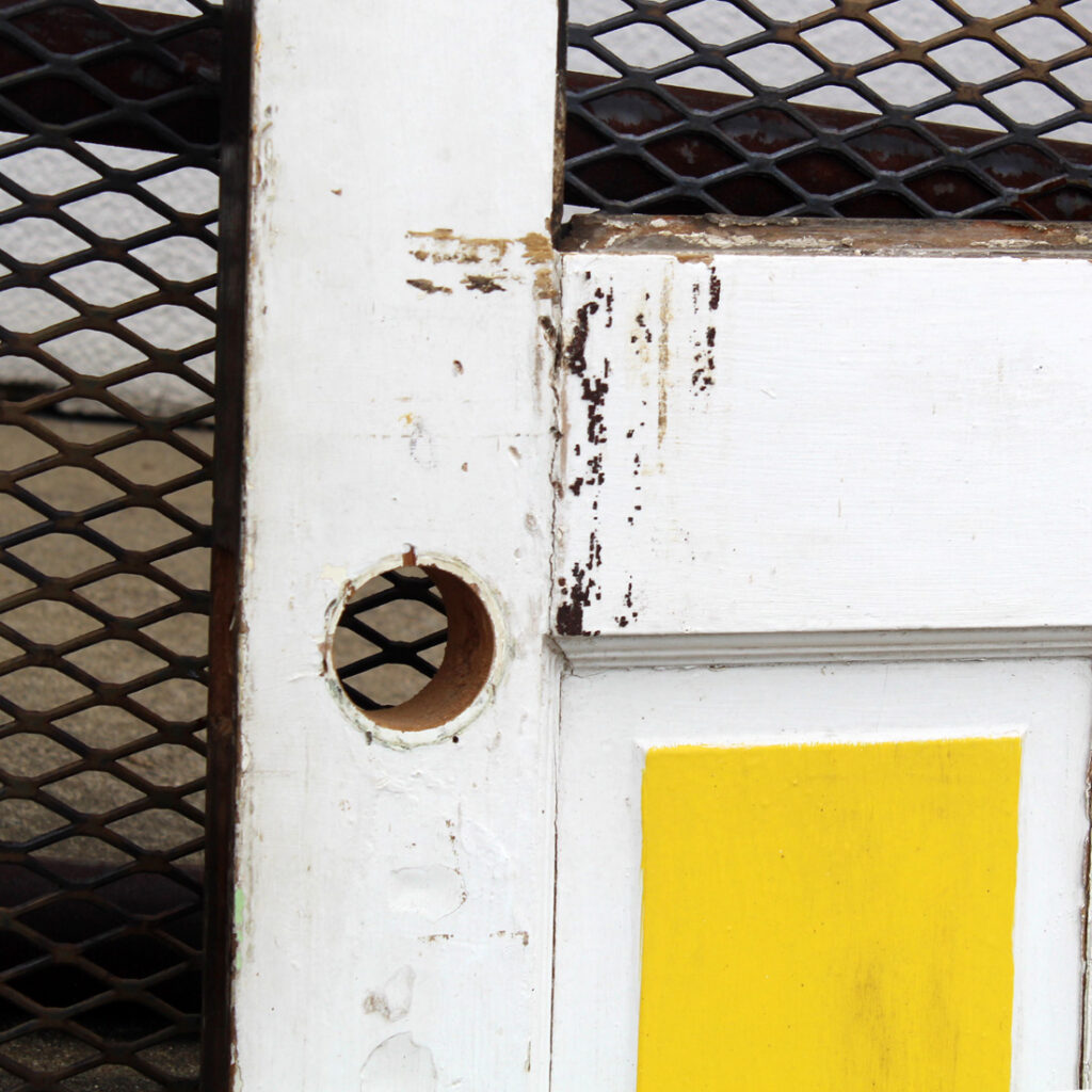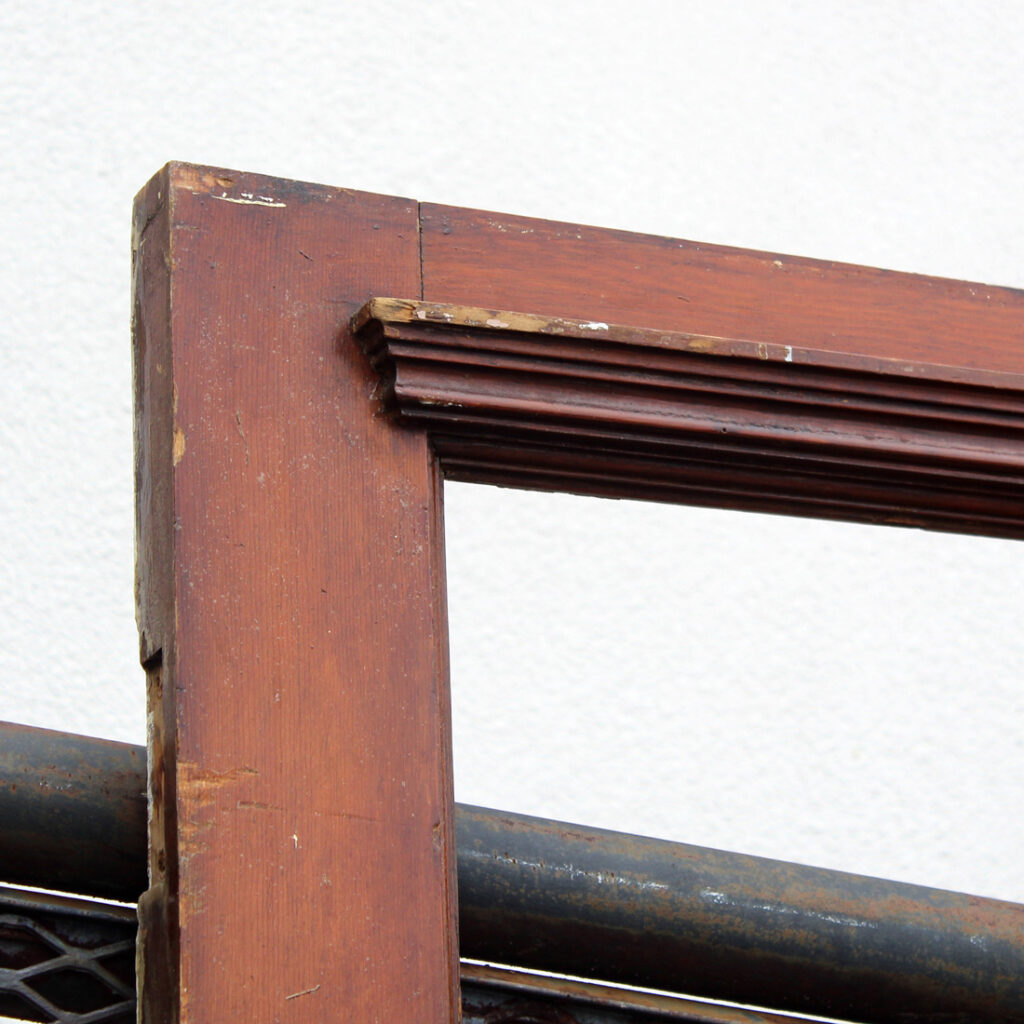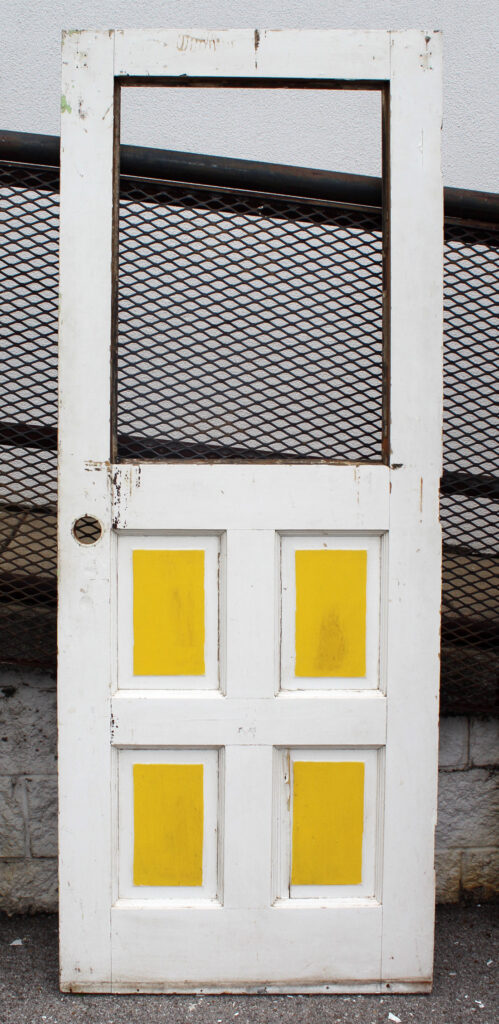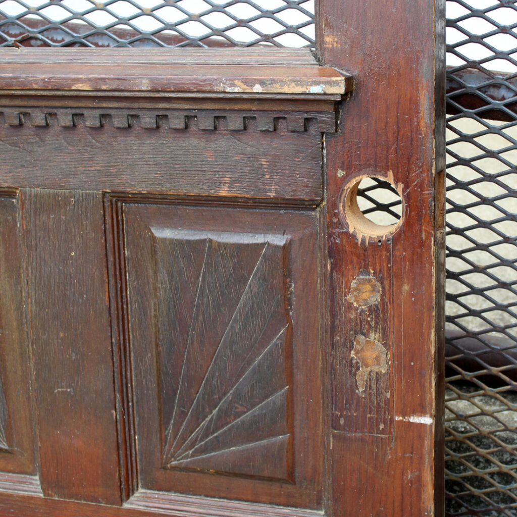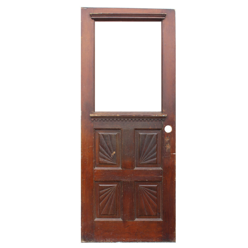 A whimsical antique door, dating from the early 1900s and salvaged from a home in Indiana. The door features a half view window and an unusual panel configuration of carved starburst wood panels. The door has the various scratches, chips, and dings typical of an old door, and the glass is missing (as pictured). The door measures 30-1/4″ wide, 77″ tall, and 1-3/4” thick. This door requires a custom shipping quote; please contact us if you have any questions.
