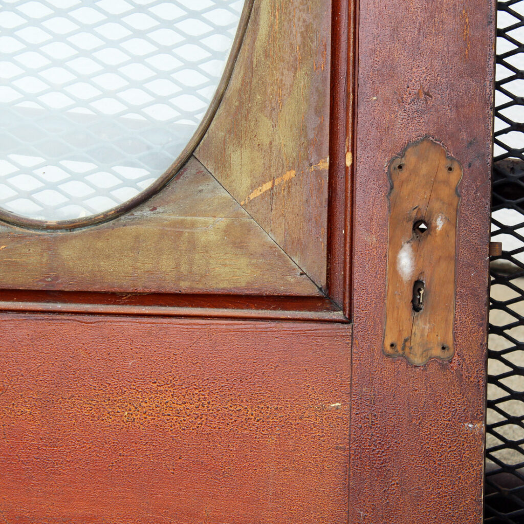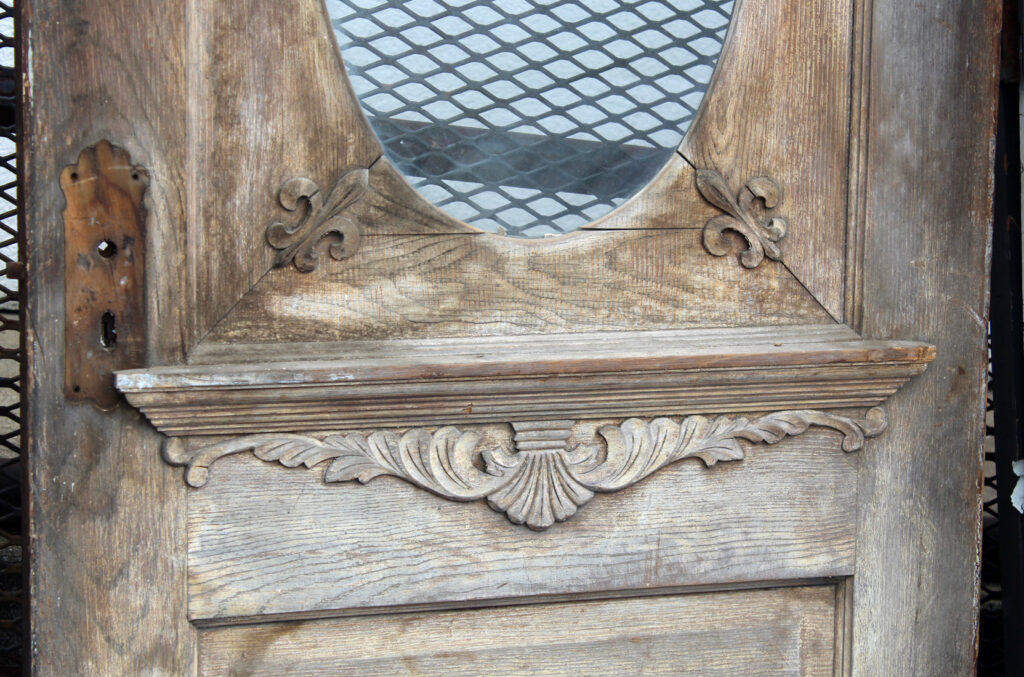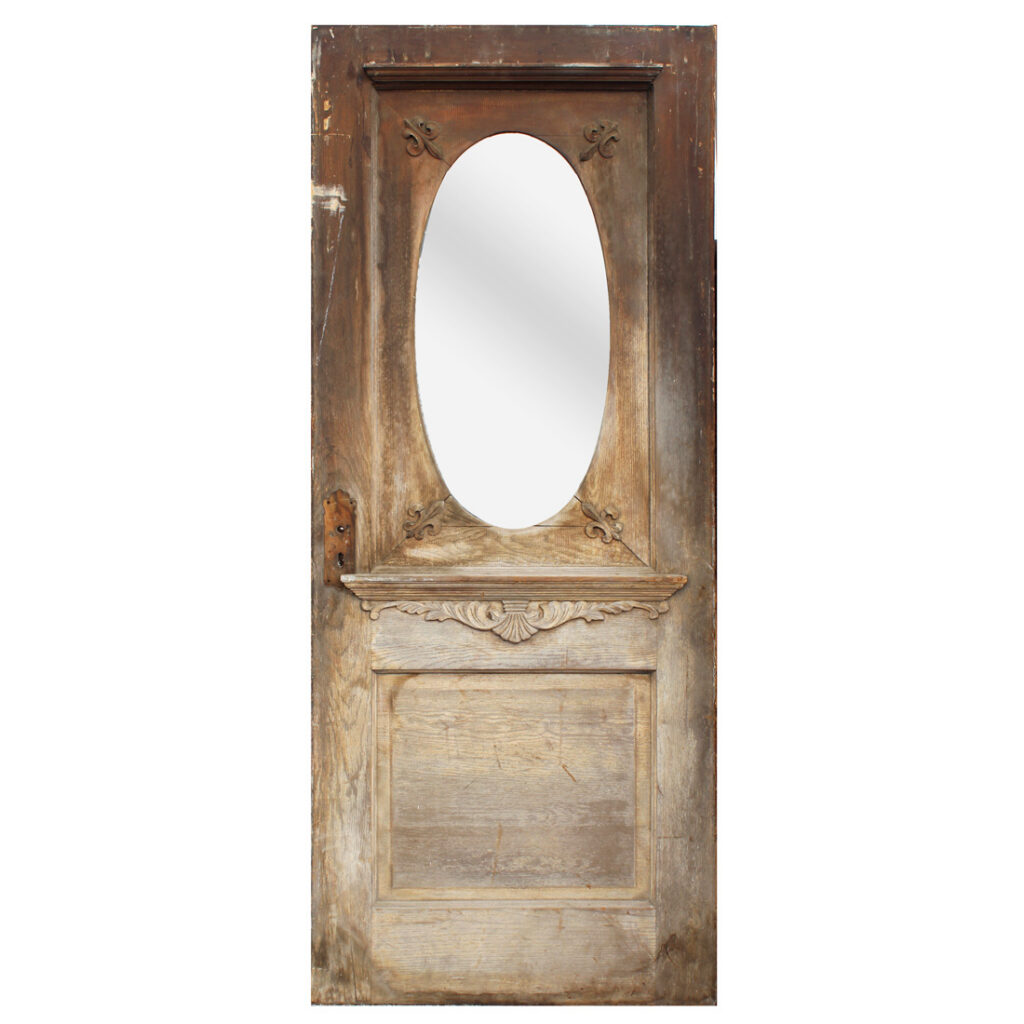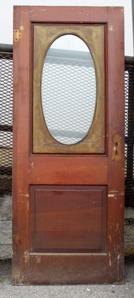 A charming antique wood door with an oval window, salvaged out of a home in Louisville, KY. This old door features a half view oval glass window, surrounded by splendid wood appliques and detailing. The door is in good antique condition with the scratches, chips, and holes typical of an old door (as pictured). The door measures 31-1/2” wide, 79″ tall, and 1-3/8” thick. Due to its size, this door requires a custom shipping quote; Please contact us if you have any questions.