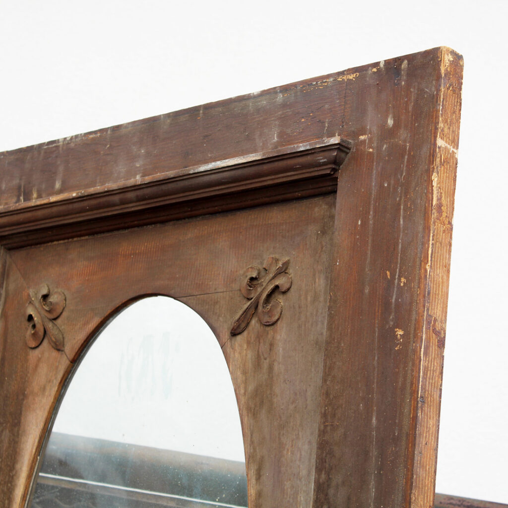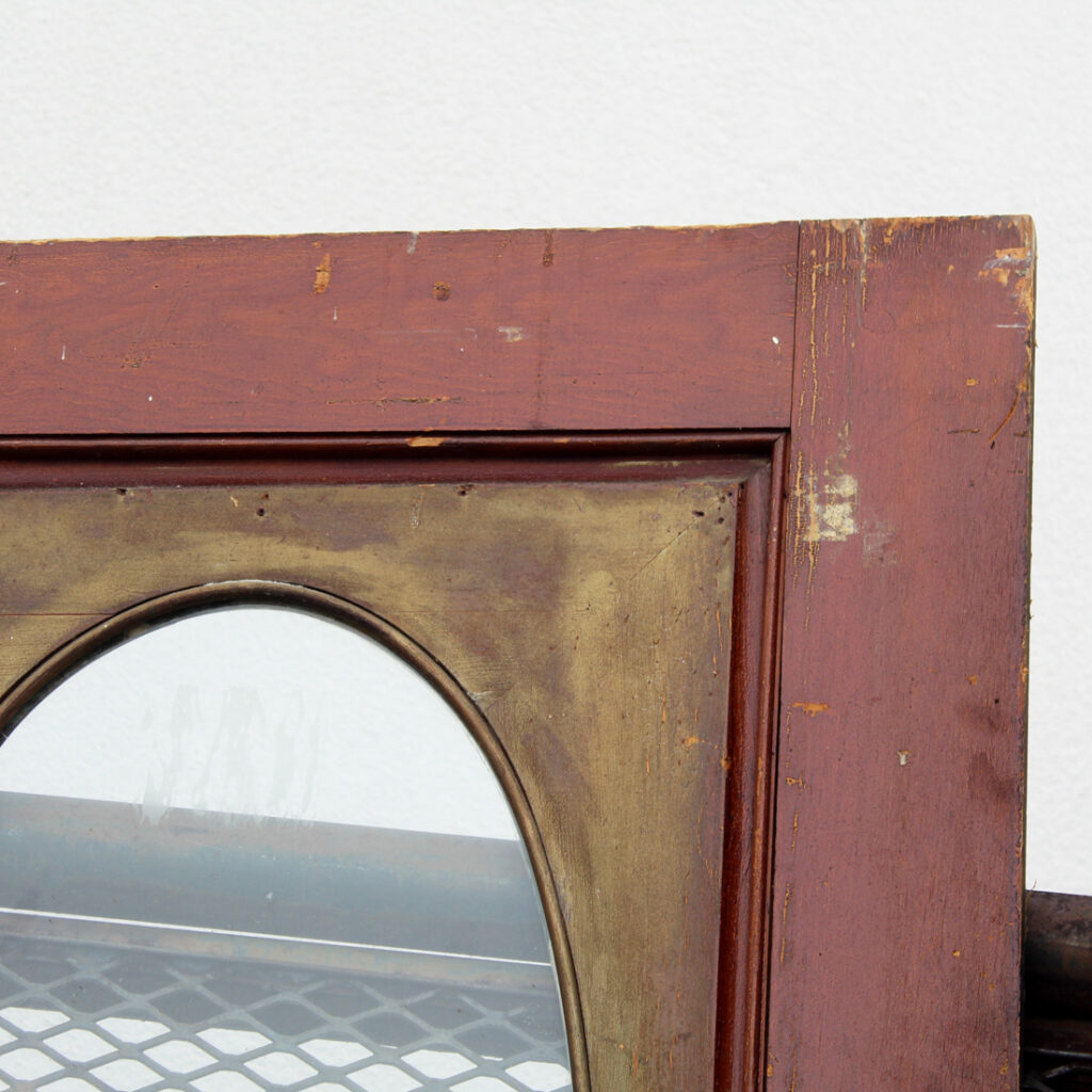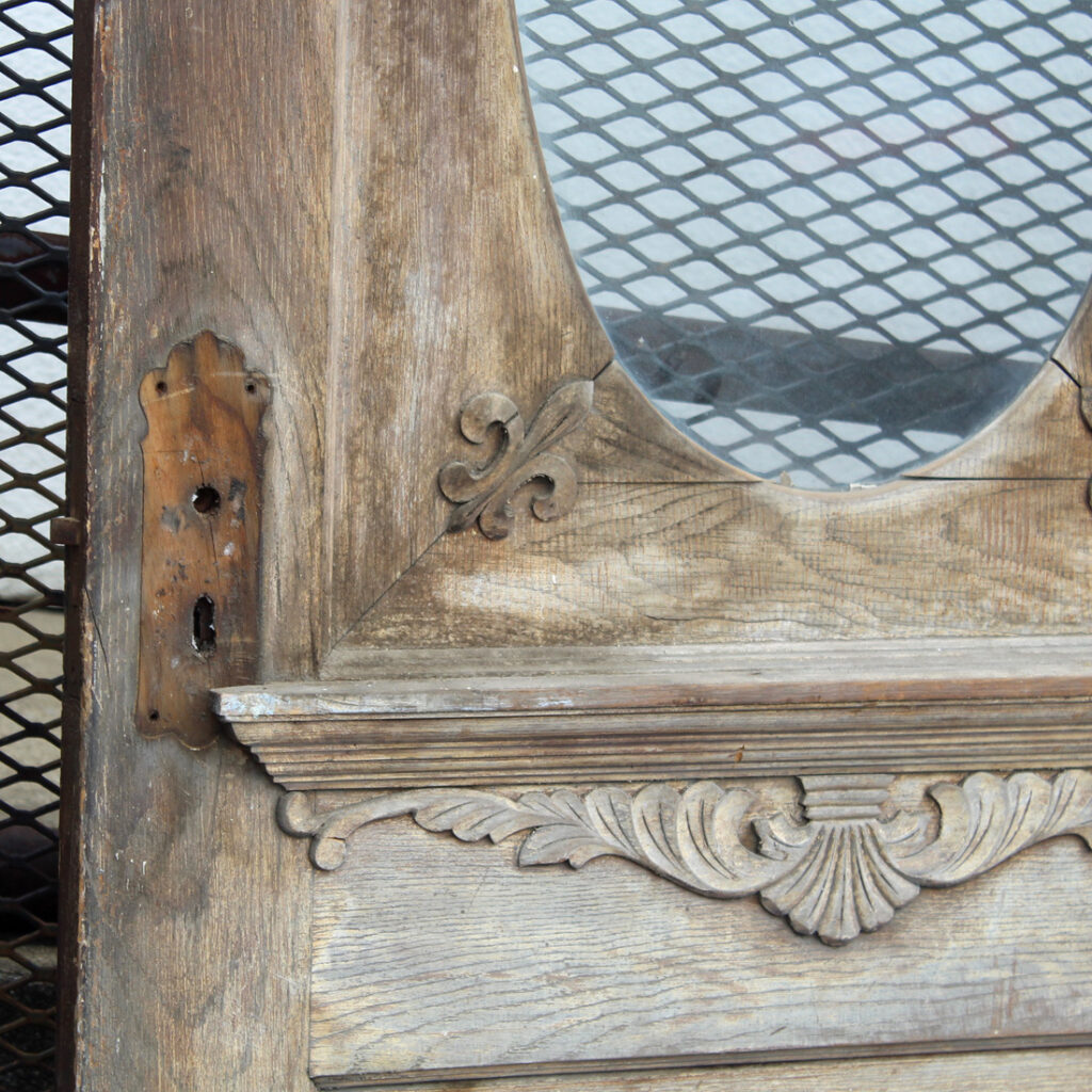 A charming antique wood door with an oval window, salvaged out of a home in Louisville, KY. This old door features a half view oval glass window, surrounded by splendid wood appliques and detailing. The door is in good antique condition with the scratches, chips, and holes typical of an old door (as pictured). The door measures 31-1/2” wide, 79″ tall, and 1-3/8” thick. Due to its size, this door requires a custom shipping quote; Please contact us if you have any questions.