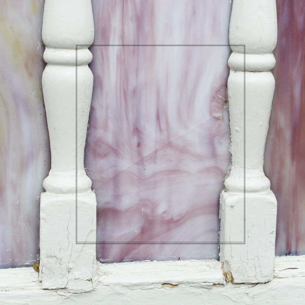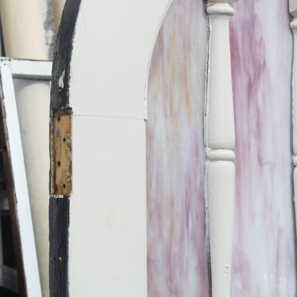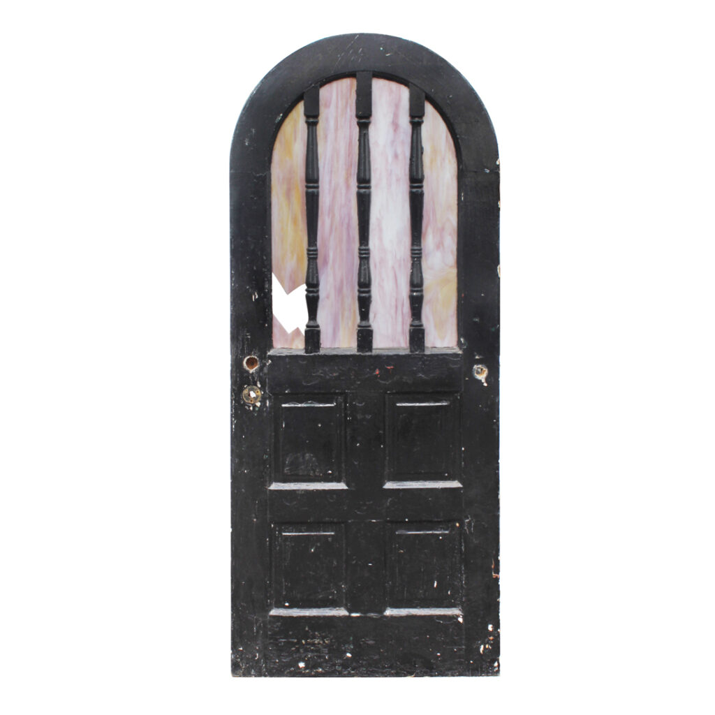 A whimsical antique arched door with a half-view window of divided slag glass panels, salvaged from the historic “Windsor” home—also known as the Castle Above the Clouds—perched atop Lookout Mountain, Tennessee. Built in the 1930s by George and Elizabeth Scholze, the residence reflects the couple’s refined taste and attention to detail. George Scholze, second-generation owner of the prominent Scholze Tannery in Chattanooga, helped earn the city its nickname, “Saddle Capital of the World.”