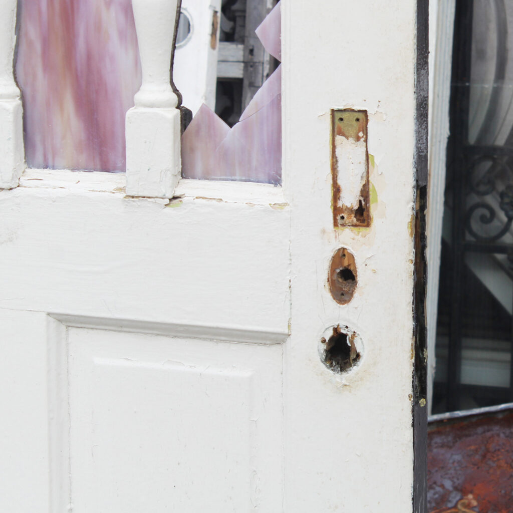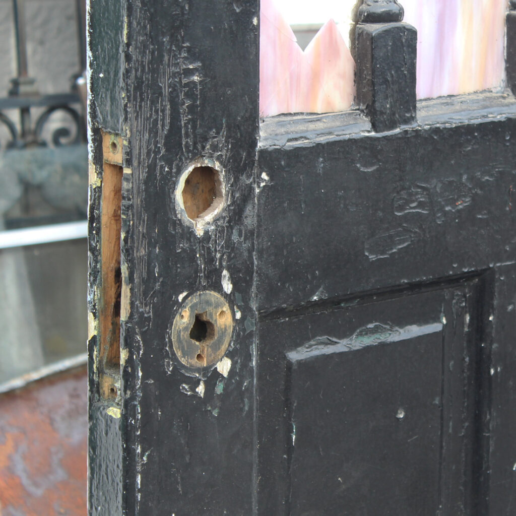 This door is in very good antique condition, and has the expected chips, scratches, and dings typical of an old door; the glass is also in good condition with one panel that is broken (as pictured.) The door measures 32″ wide, 78″ tall, and 1-3/4″ thick. This piece requires a custom shipping quote, please contact us if you have any questions.