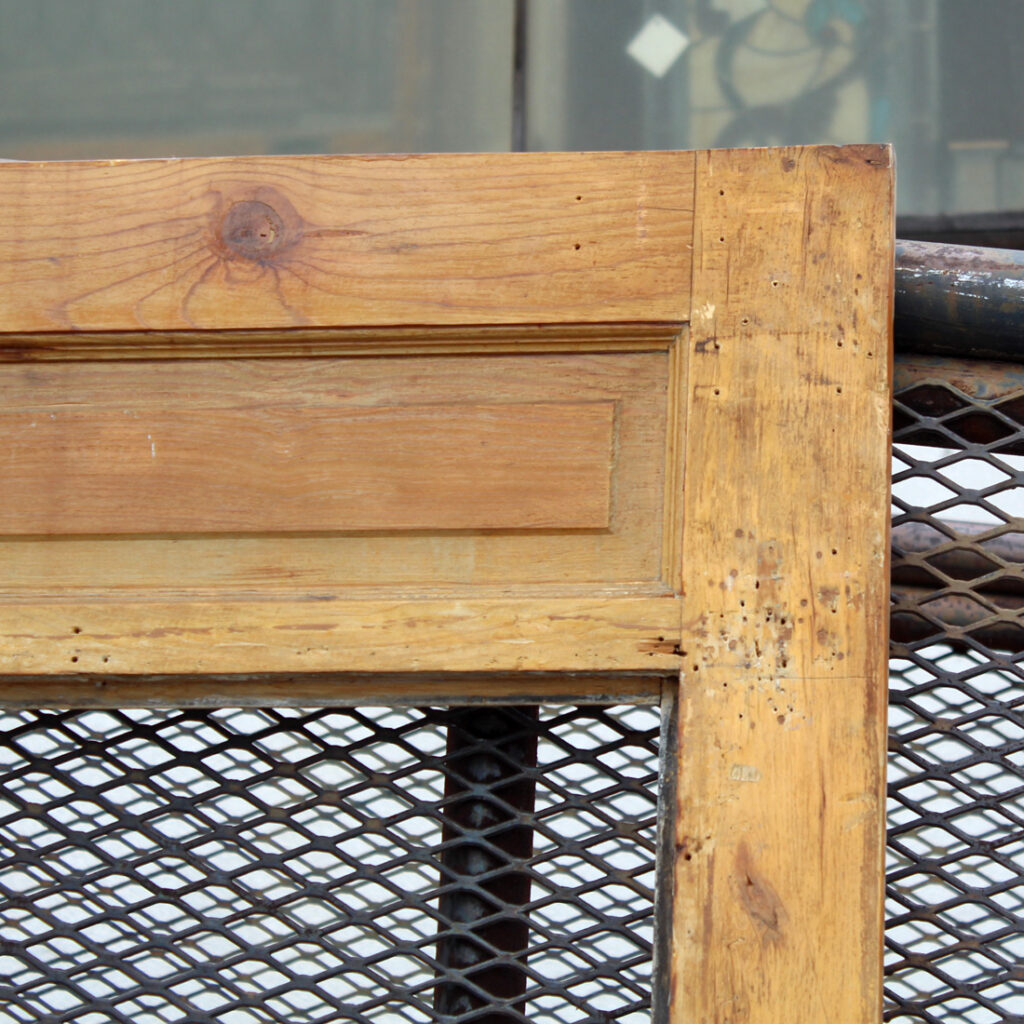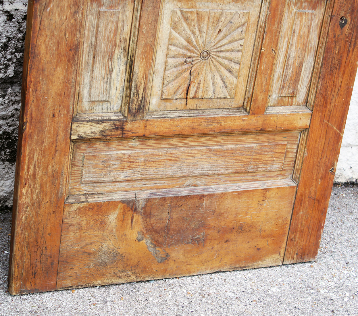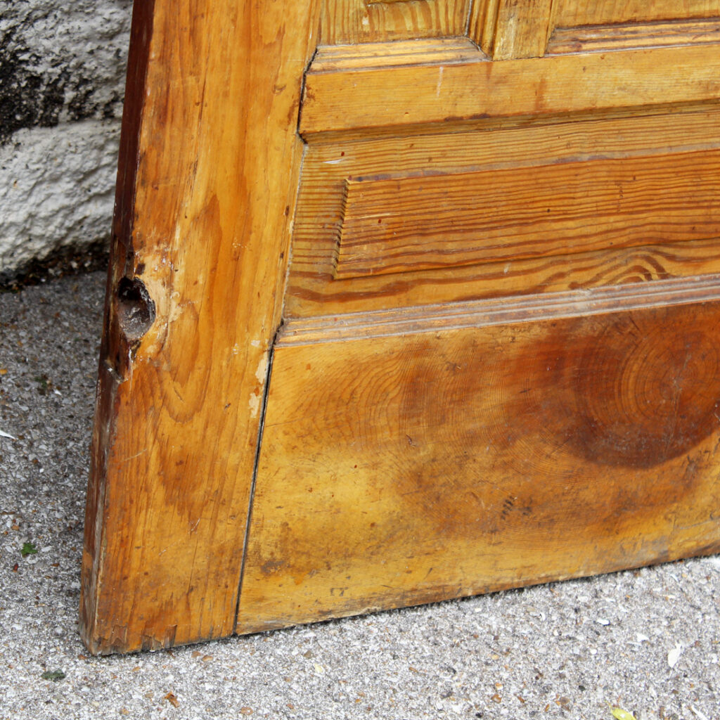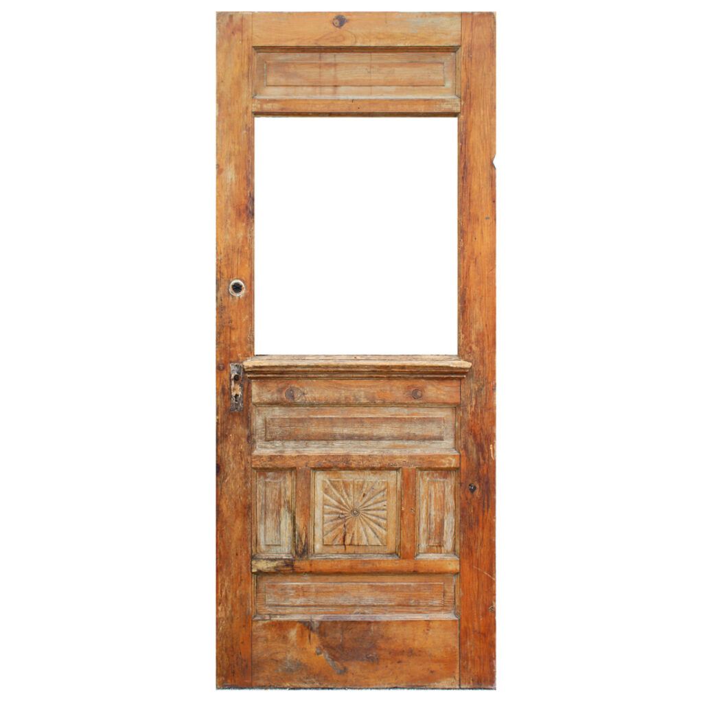 A charming antique door, dating from the early 1900s and salvaged from a home in Louisville, KY. The door features a half view window and an unusual panel configuration, with one of the panels featuring a carved starburst design. The door has the various scratches, chips, and dings typical of an old door; the glass is missing (as pictured). This door measures approx. 32″ wide, 79″ tall, and 1-3/8” thick. This door requires a custom shipping quote; please contact us if you have any questions.