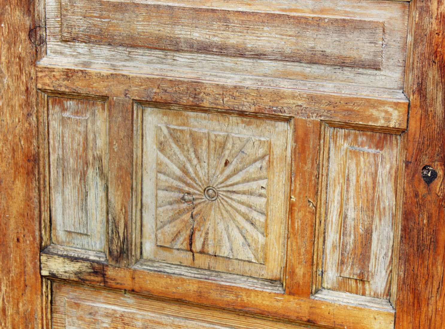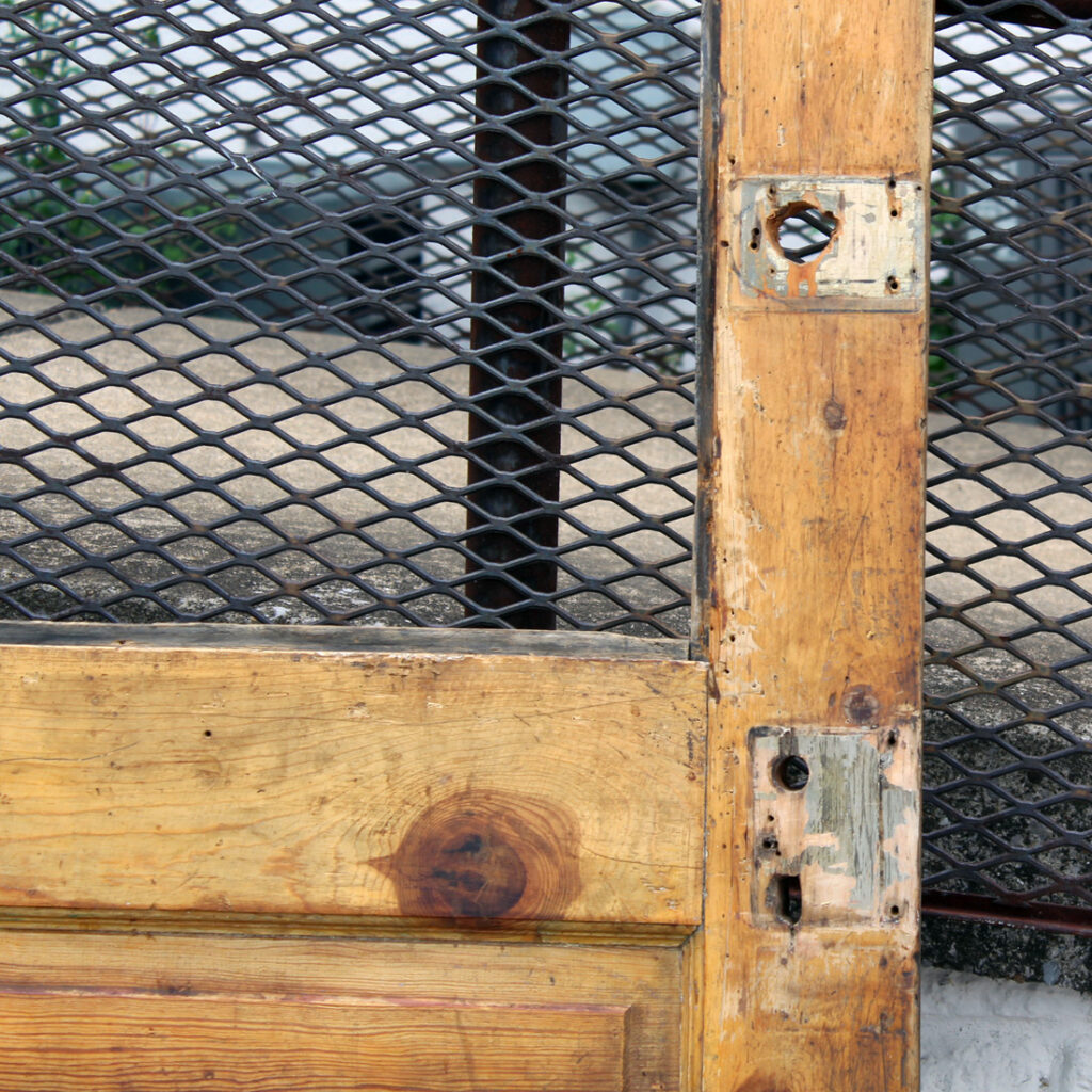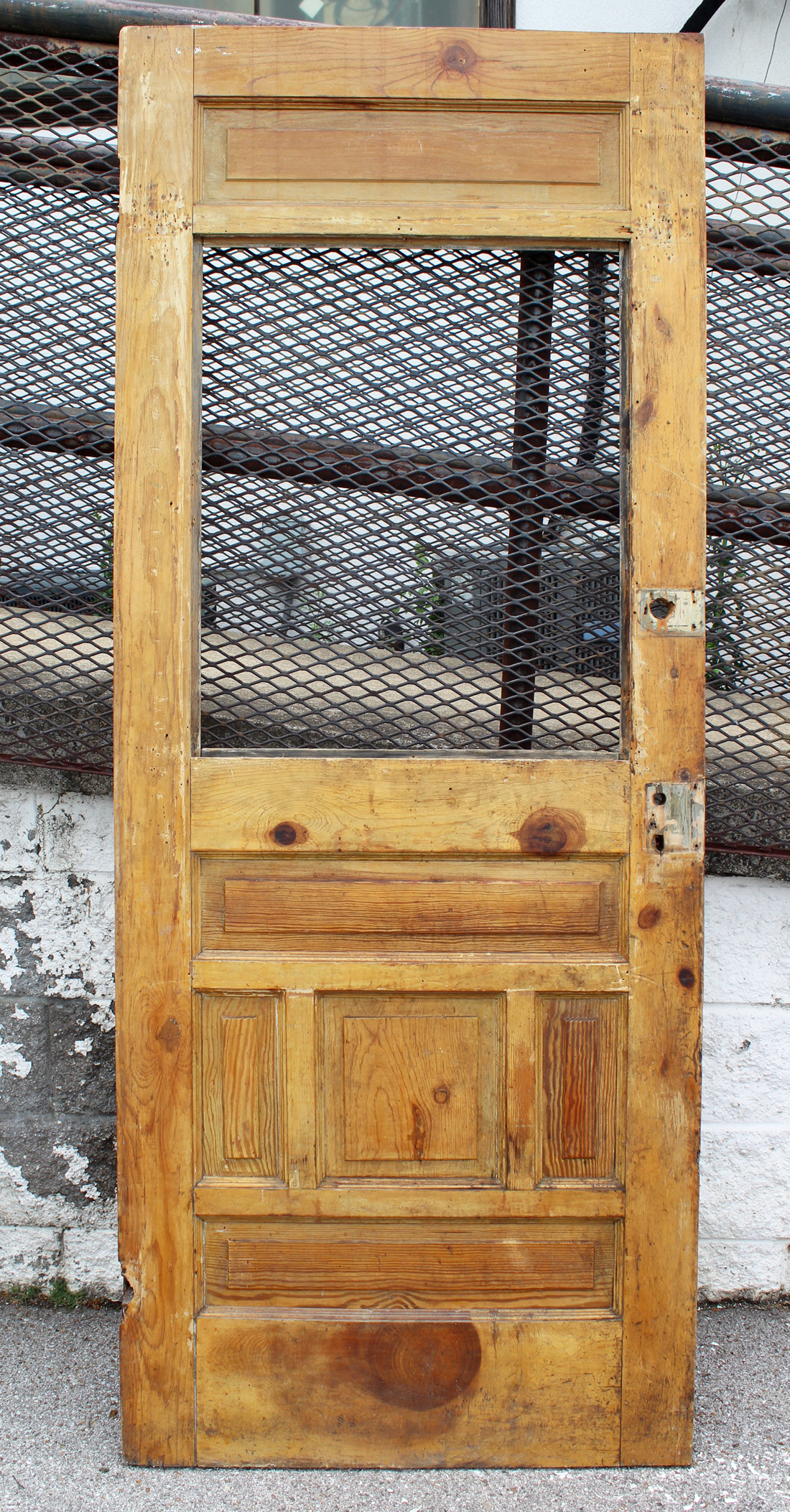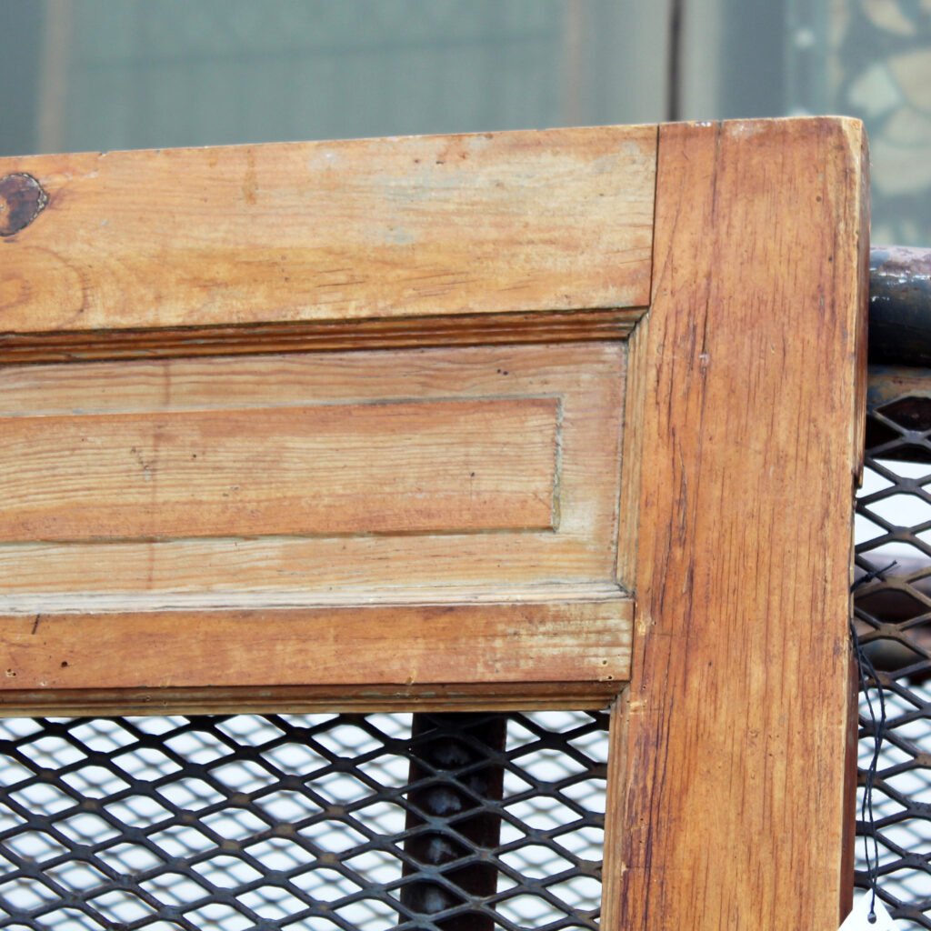 A charming antique door, dating from the early 1900s and salvaged from a home in Louisville, KY. The door features a half view window and an unusual panel configuration, with one of the panels featuring a carved starburst design. The door has the various scratches, chips, and dings typical of an old door; the glass is missing (as pictured). This door measures approx. 32″ wide, 79″ tall, and 1-3/8” thick. This door requires a custom shipping quote; please contact us if you have any questions.