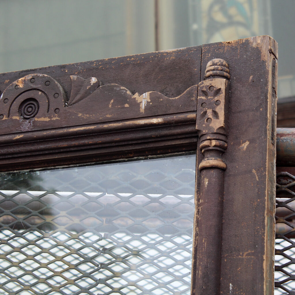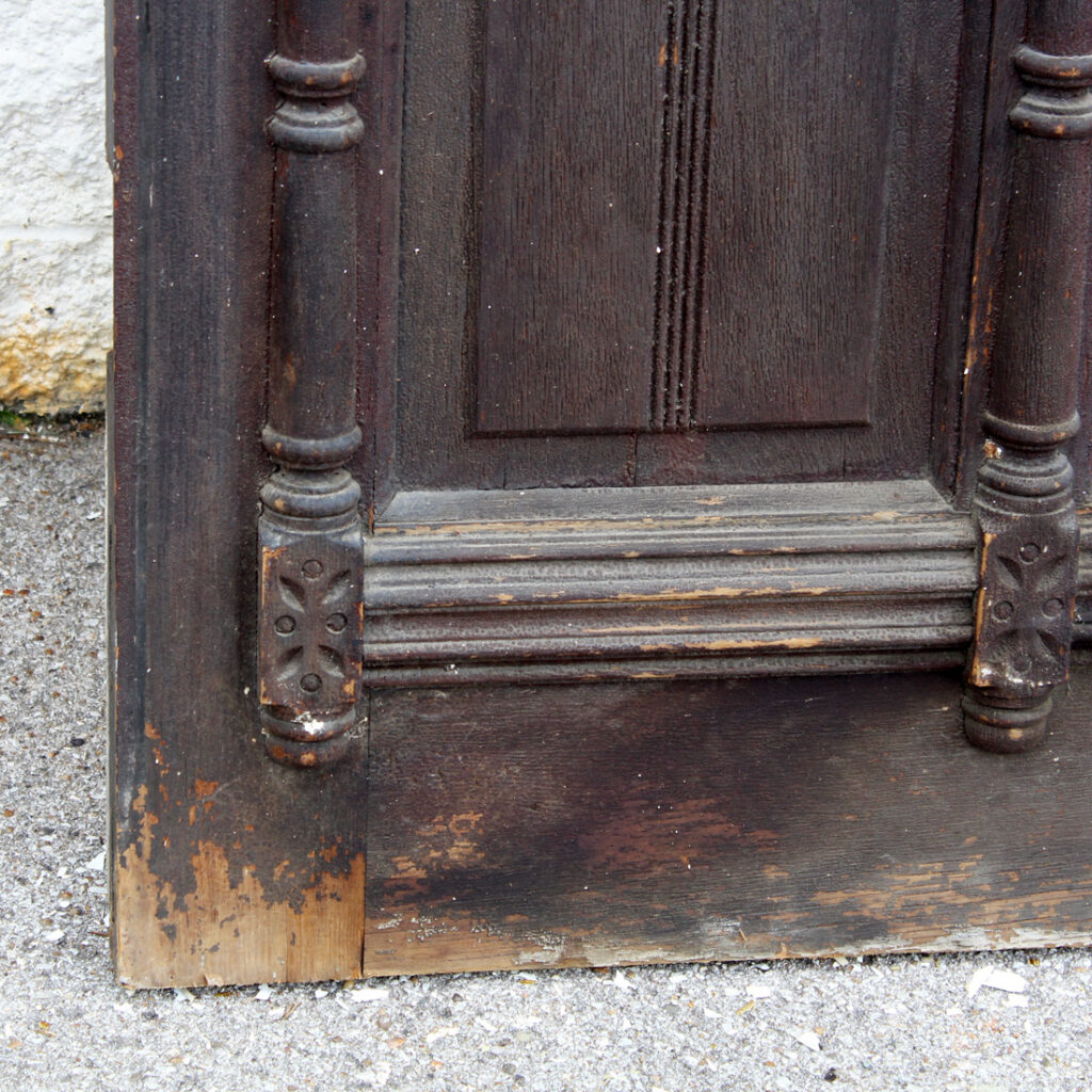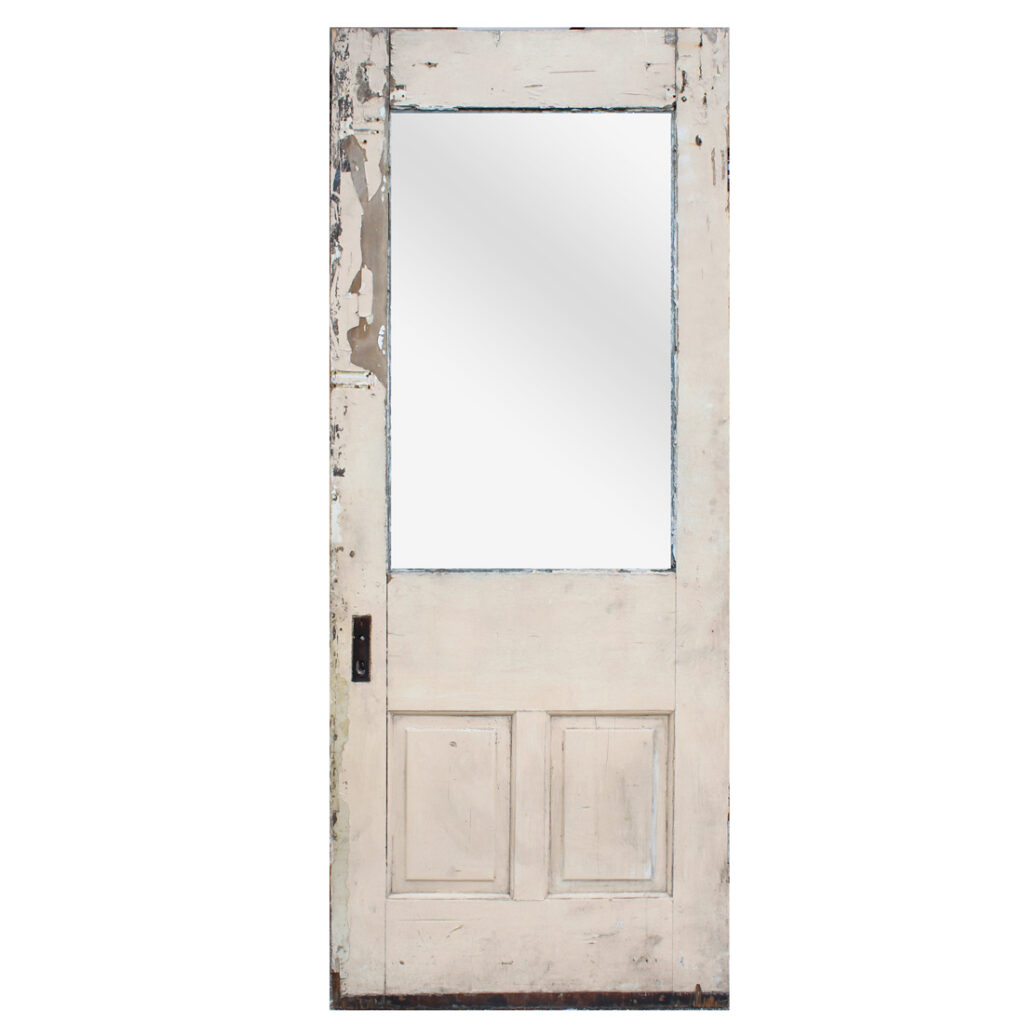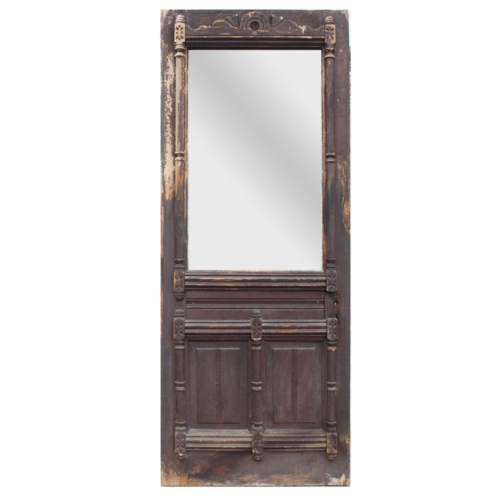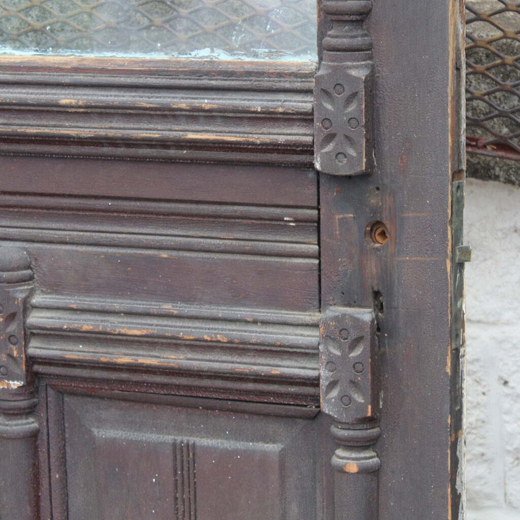 A wonderful antique Eastlake door, dating from the 1890’s and salvaged from a home in Kentucky. This door features a half view window surrounded by decorative raised and carved trim. It is in good antique condition with the expected chips, dings, and holes typical of an old door (as pictured). This reclaimed door measures 32″ wide, 79-3/4″ tall, and 1-3/8″ thick. It requires a custom shipping quote; please contact us if you have any questions.