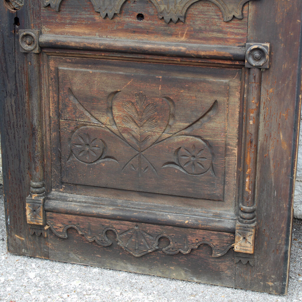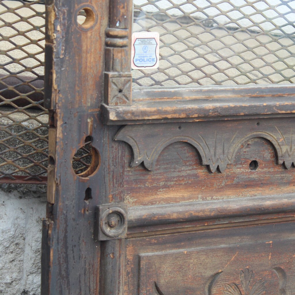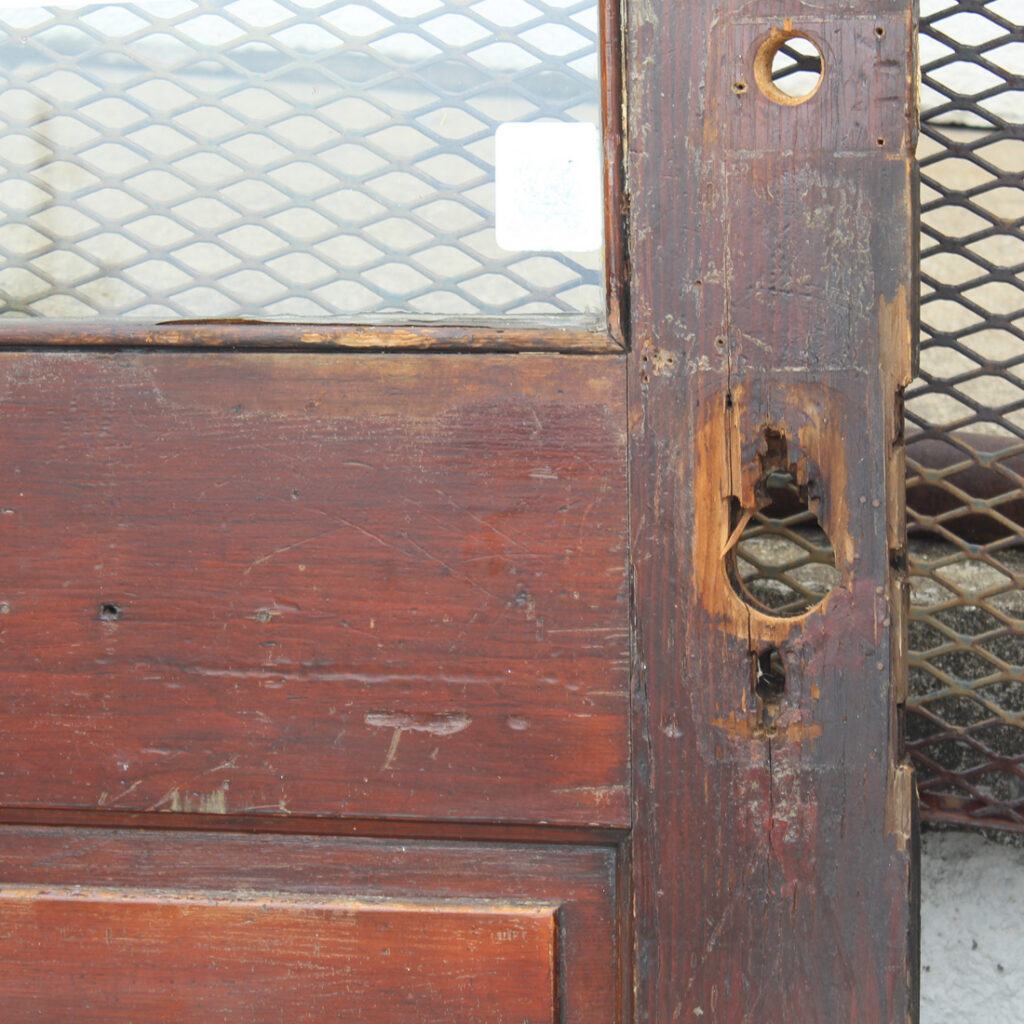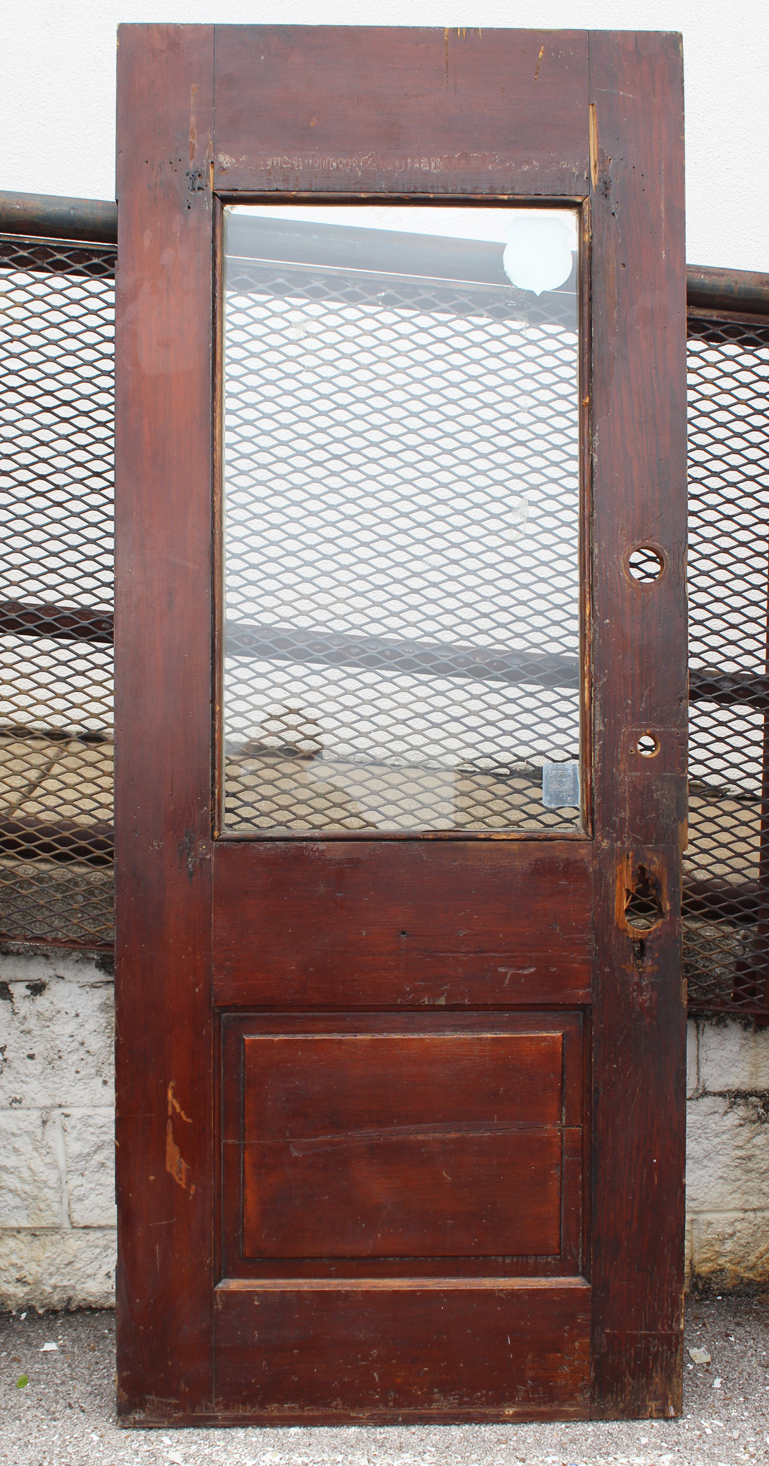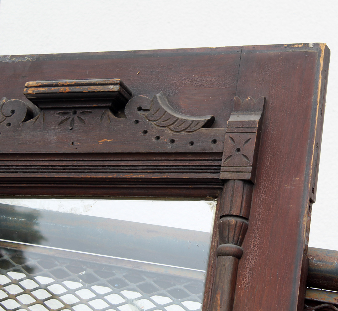A lovely antique Eastlake door, dating from the late 1800’s and salvaged from a home in Indianapolis, IN. This stained door features a half view window surrounded by decorative trim, perched above a playful carved wood panel below. It is in good antique condition with the expected chips, dings, and holes typical of an old door; the door is missing its glass (as pictured). This reclaimed door measures 31-5/8″ wide, 78-5/8″ tall, and 1-3/8″ thick. It requires a custom shipping quote; please contact us if you have any questions. A coordinating door can be found under product code NED2659-RW.