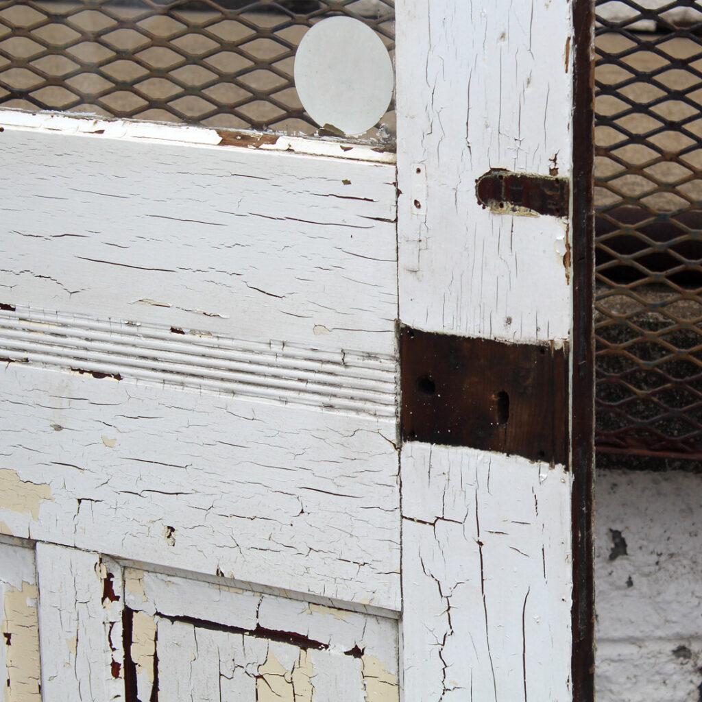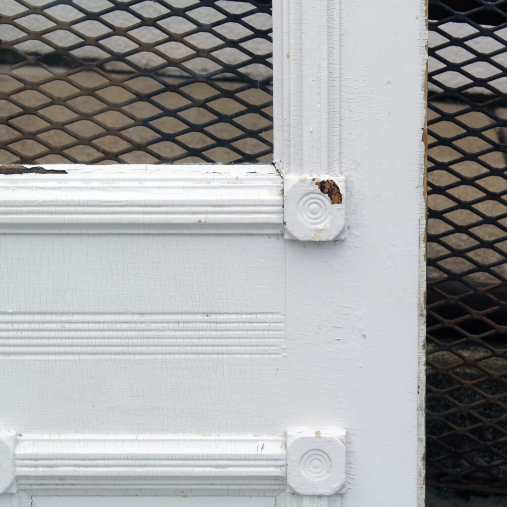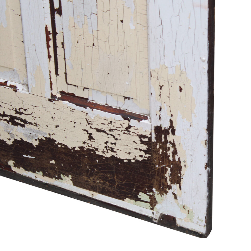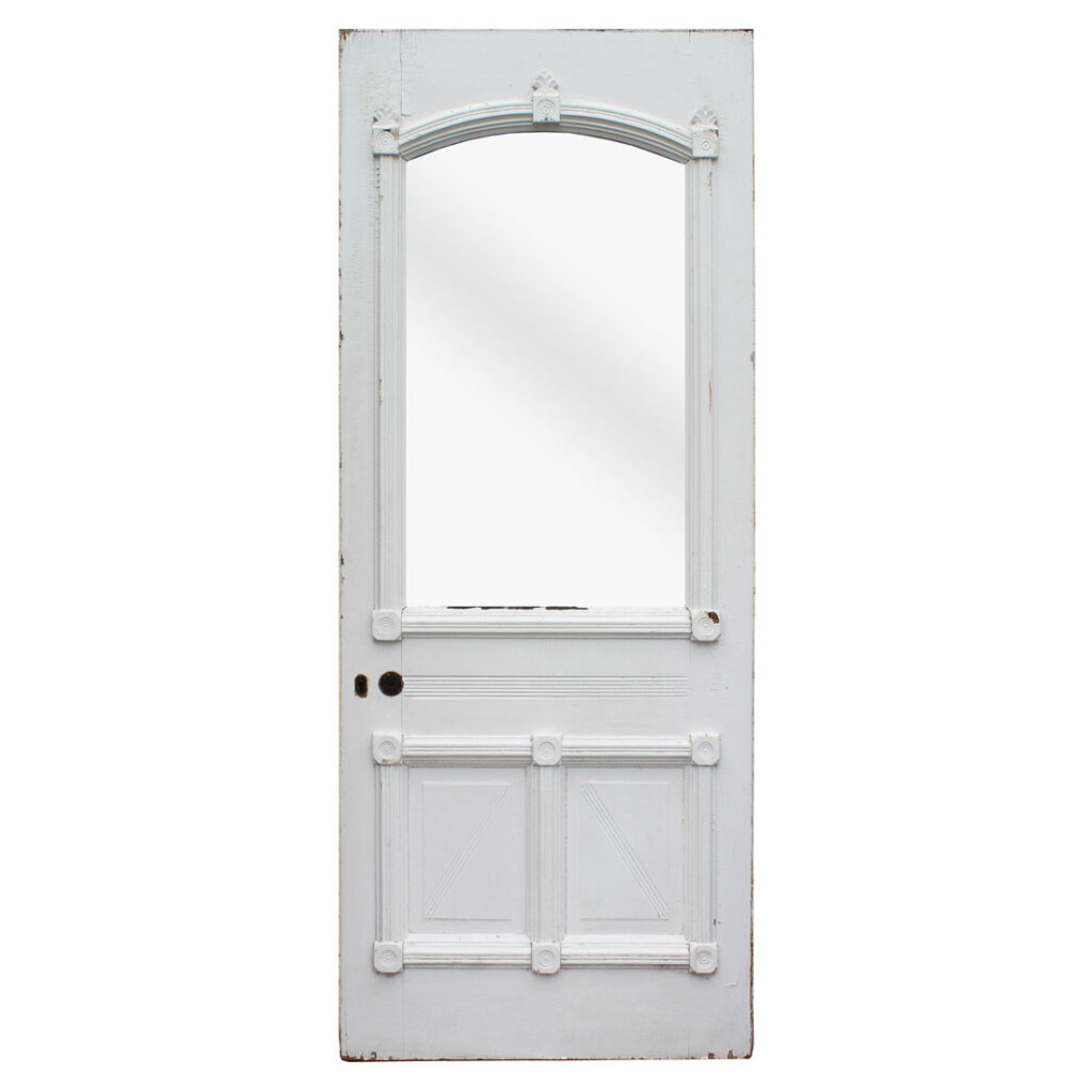 A stunning antique Eastlake door, dating from the 1880s and salvaged from a home in Indiana. This old door features a half-view arched window, chippy paint, and playful raised trim. The door is in good antique condition with the expected chips, dings, and wear typical of an old door (as pictured). It measures approx. 32″ wide, 79″ tall, and 1-3/8″ thick. This door requires a custom shipping quote; please contact us if you have any questions. Coordinating doors can be found under product codes NED2681-RW & NED2680-RW.