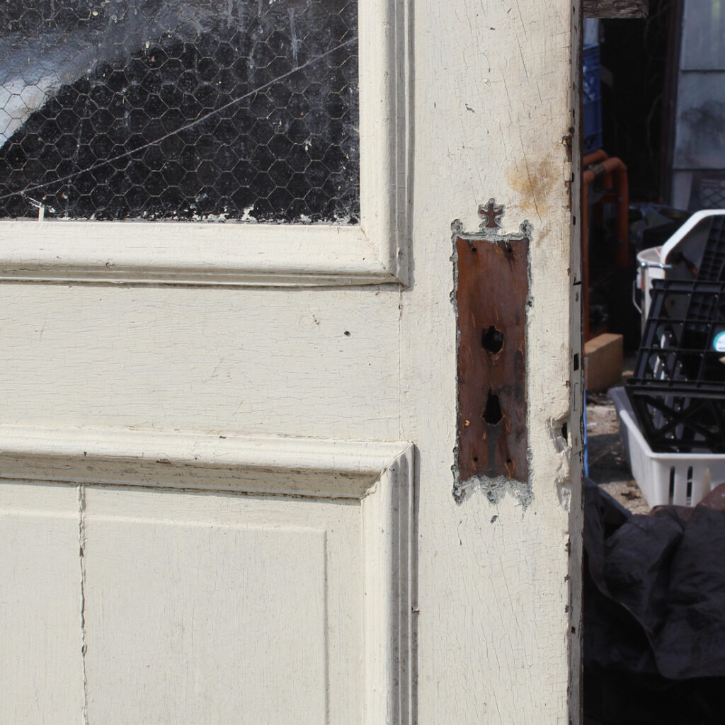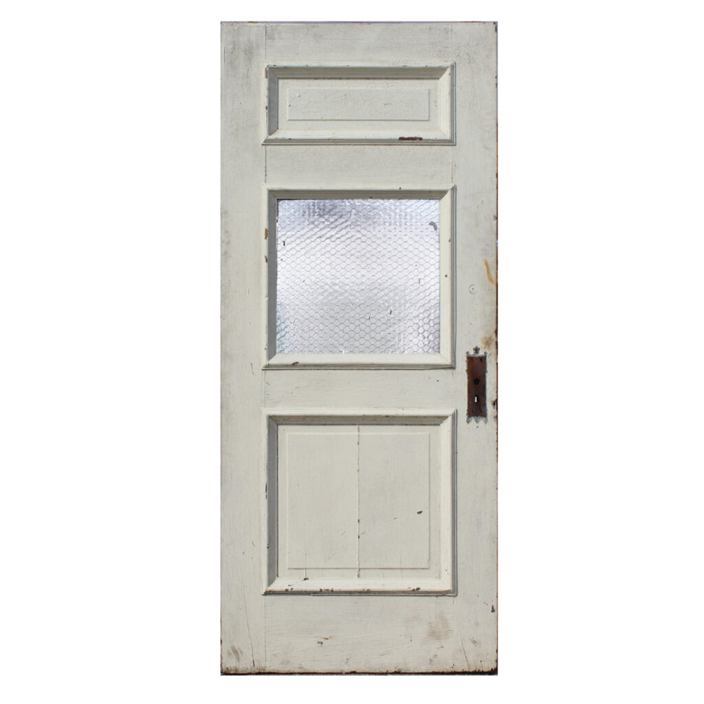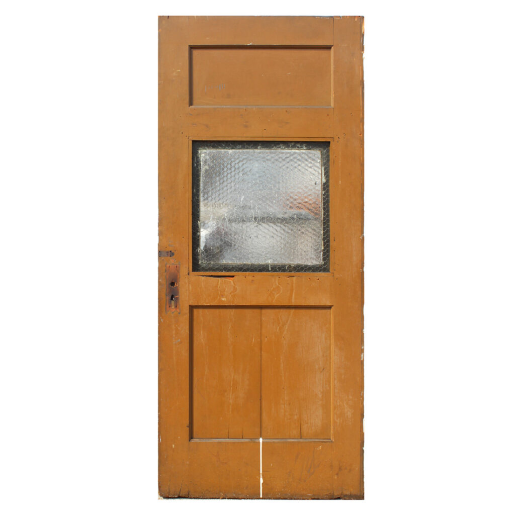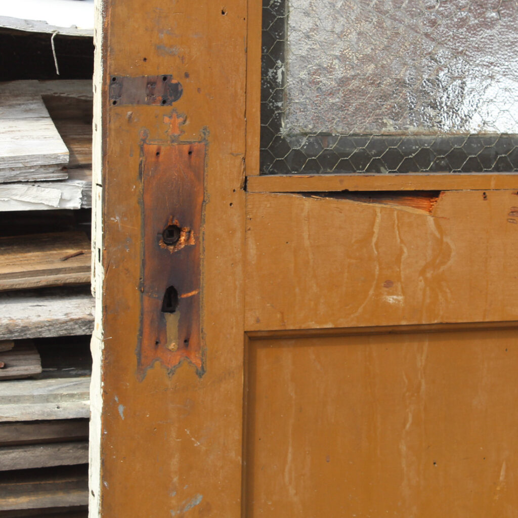 An amazing antique door with wire glass, dating from the early 1900s and salvaged from a home in Indiana. The door features a large square pane of chicken wire glass; it is in good antique condition with wear typical of an old door including a crack in the lower wood panel (as pictured). The door measures 35-7/8″ wide, 84-1/4″ tall, 1-3/4″ thick. This piece requires a custom shipping quote; please let us know if you have any questions.