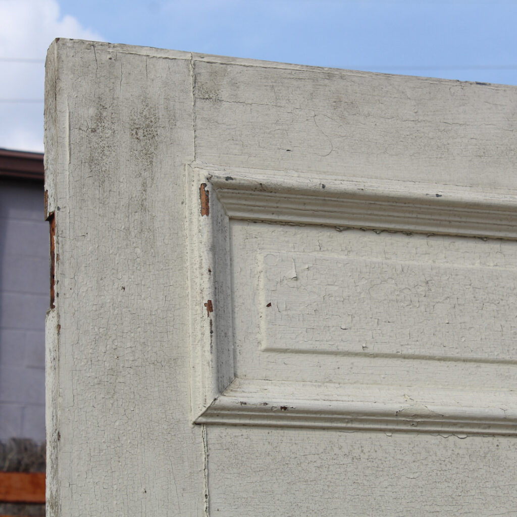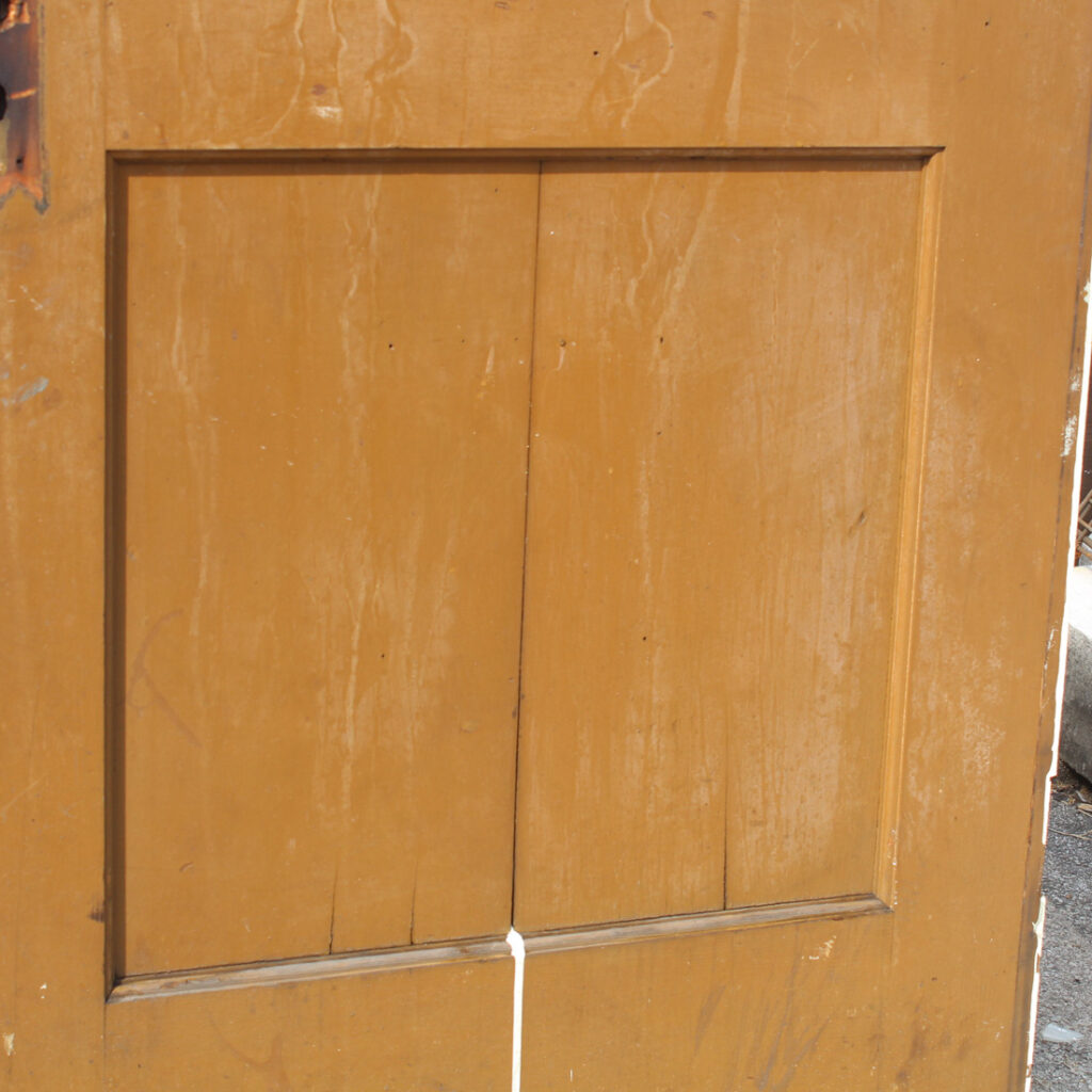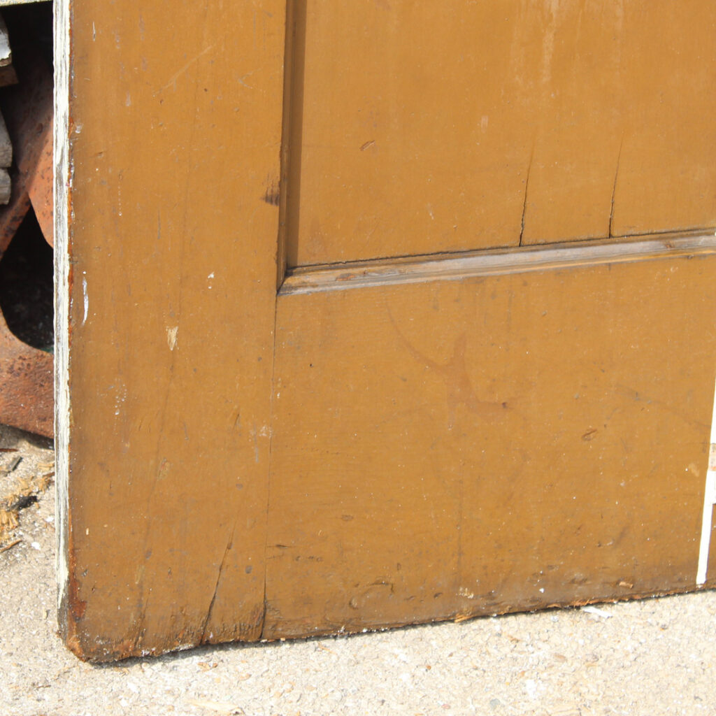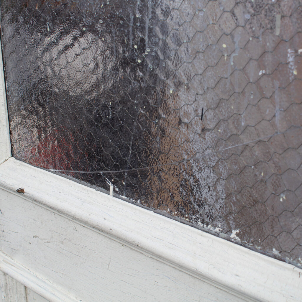 An amazing antique door with wire glass, dating from the early 1900s and salvaged from a home in Indiana. The door features a large square pane of chicken wire glass; it is in good antique condition with wear typical of an old door including a crack in the lower wood panel (as pictured). The door measures 35-7/8″ wide, 84-1/4″ tall, 1-3/4″ thick. This piece requires a custom shipping quote; please let us know if you have any questions.