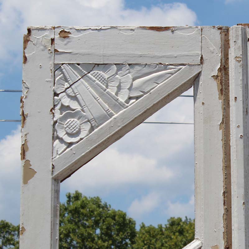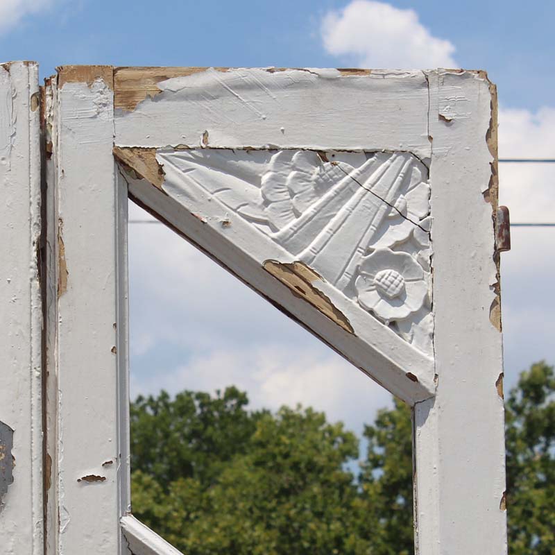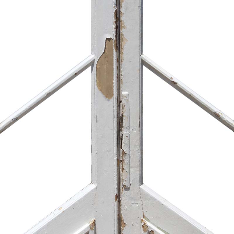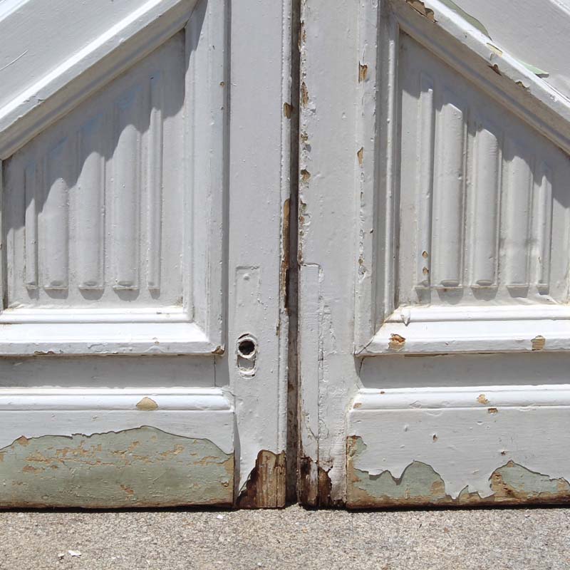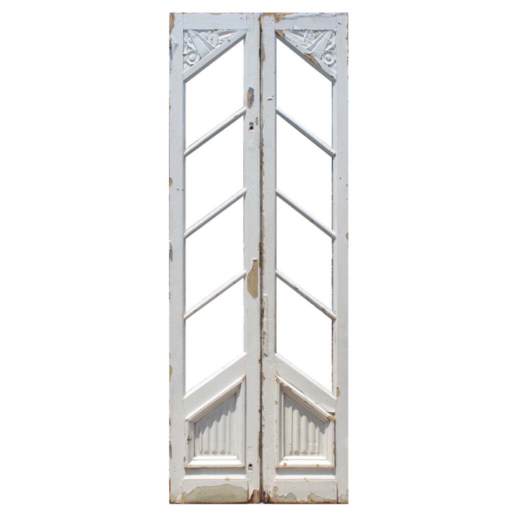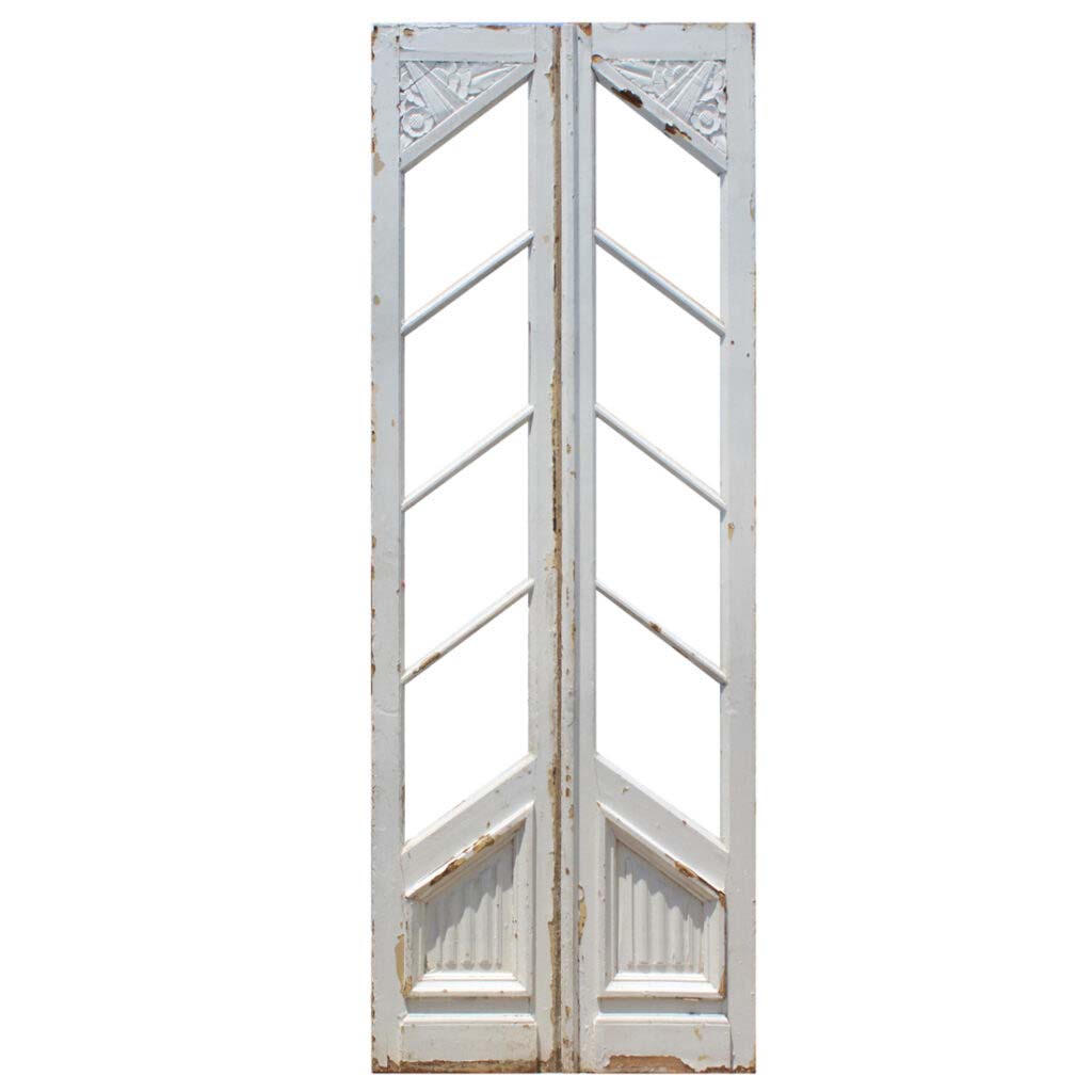 A stunning pair of antique French double doors, dating from the early 1900s. Each door features three-quarter-view divided windows perched above a single raised wood panel below. Decorative carved floral inserts adorn the top corners of each door and can be seen on the front as well as the back. These double doors are in very good antique condition with a wonderful chippy painted finish. The doors have the dings and scratches typical of an old door, and one carved panel up top has two cracks (as pictured). They measure 36-3/4” wide collectively, 100-1/4″ tall, and 2″ thick. These doors require a custom shipping quote; please contact us if you have any questions.