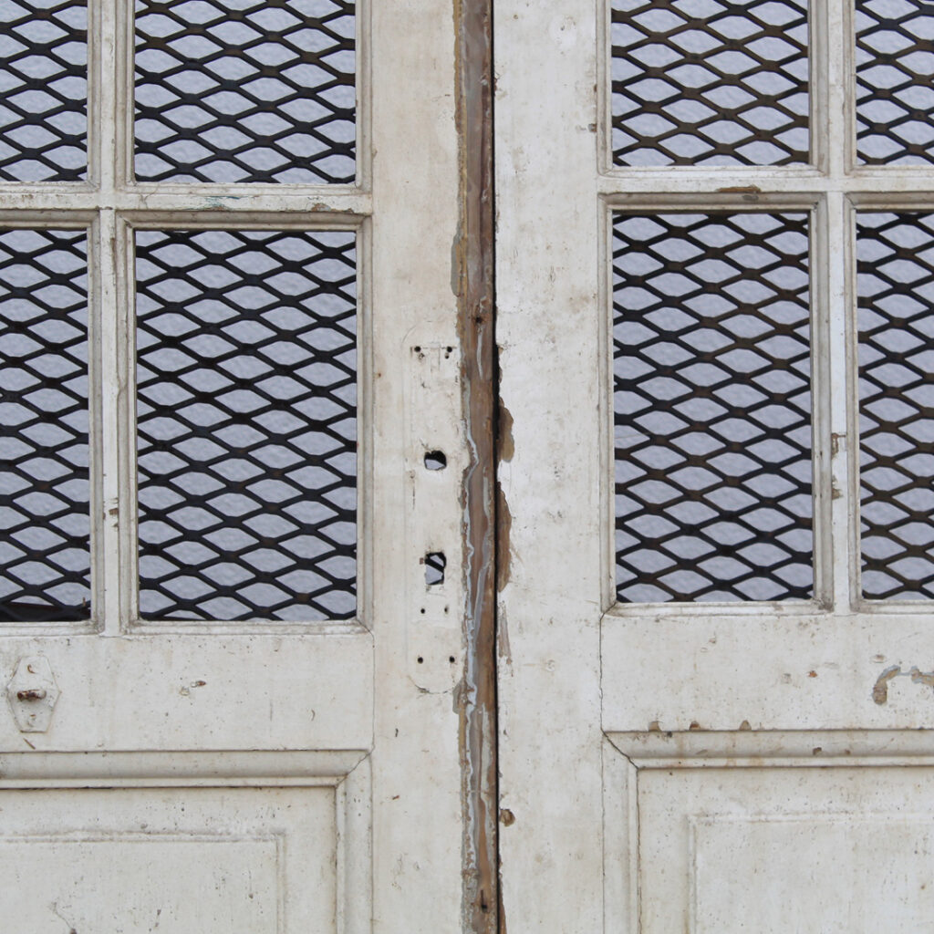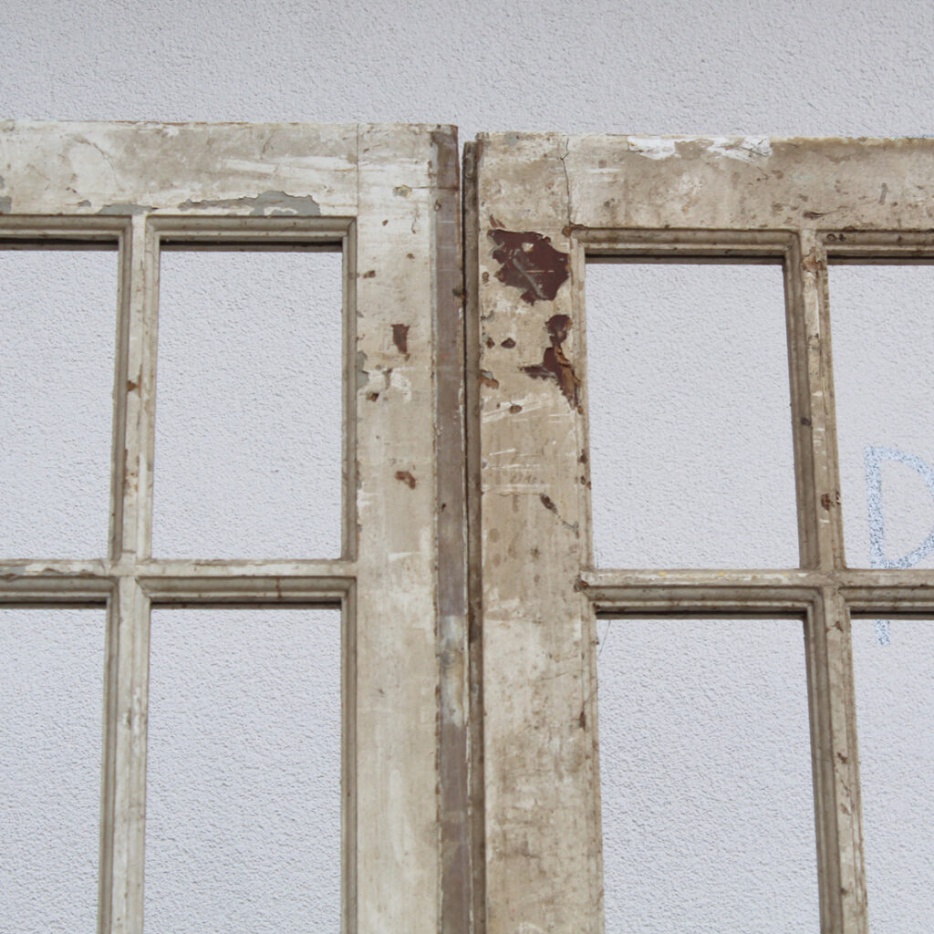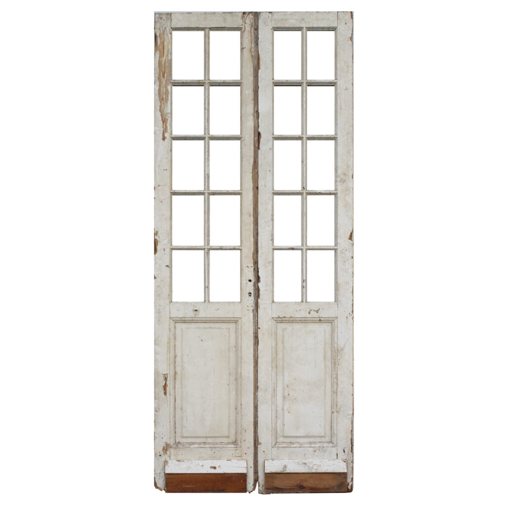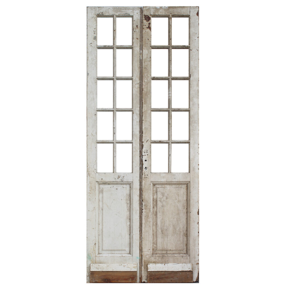 A wonderful pair of antique French double doors, dating from the early 1900s. Each door features divided light windows perched above a single raised wood panel below. These double doors are in very good antique condition with a wonderful chippy paint finish. The doors include some of their non-functional hardware, and have the dings and scratches including slight damage to on the bottom of the doors; each door is missing its glass, as pictured. They measure 38-3/4” wide collectively, 100-1/2″ tall, and 2″ thick. These doors require a custom shipping quote; please contact us if you have any questions.