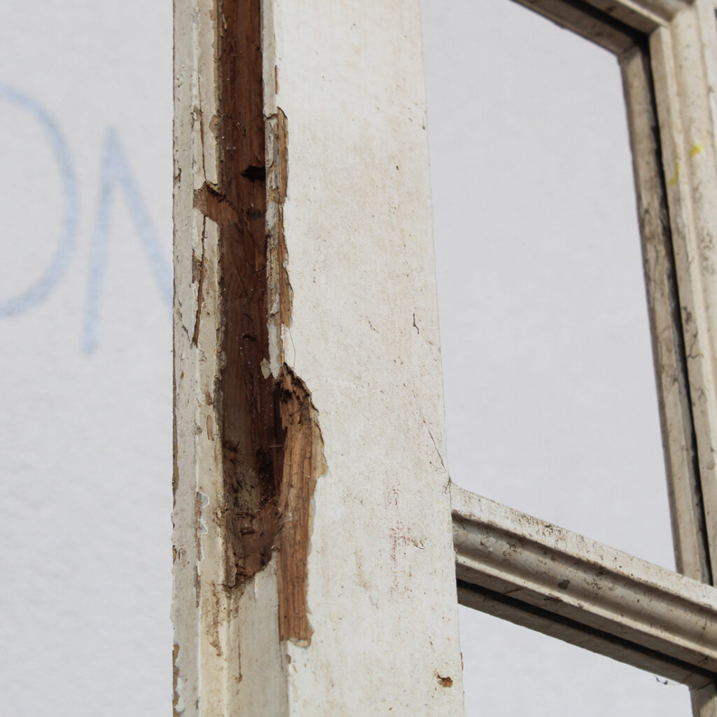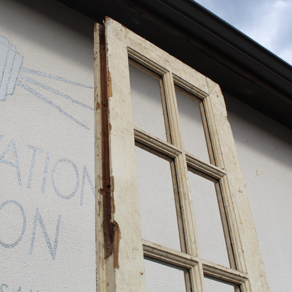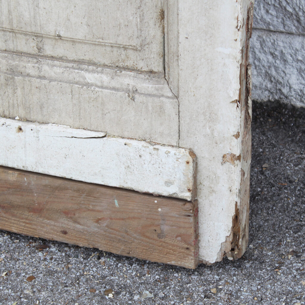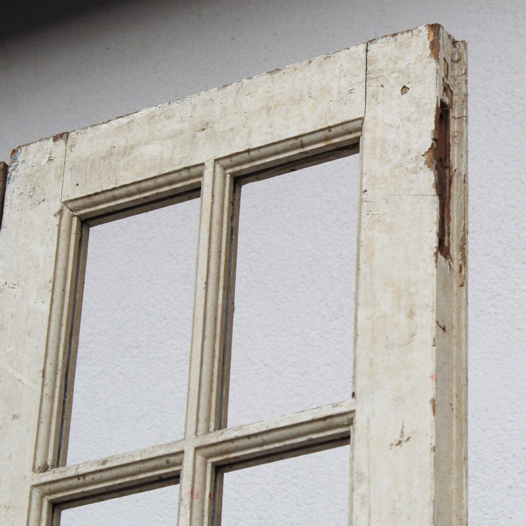 A wonderful pair of antique French double doors, dating from the early 1900s. Each door features divided light windows perched above a single raised wood panel below. These double doors are in very good antique condition with a wonderful chippy paint finish. The doors include some of their non-functional hardware, and have the dings and scratches including slight damage to on the bottom of the doors; each door is missing its glass, as pictured. They measure 38-3/4” wide collectively, 100-1/2″ tall, and 2″ thick. These doors require a custom shipping quote; please contact us if you have any questions.