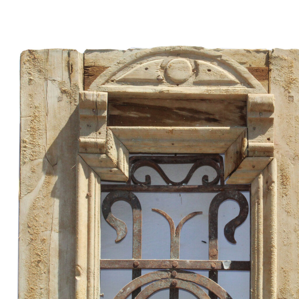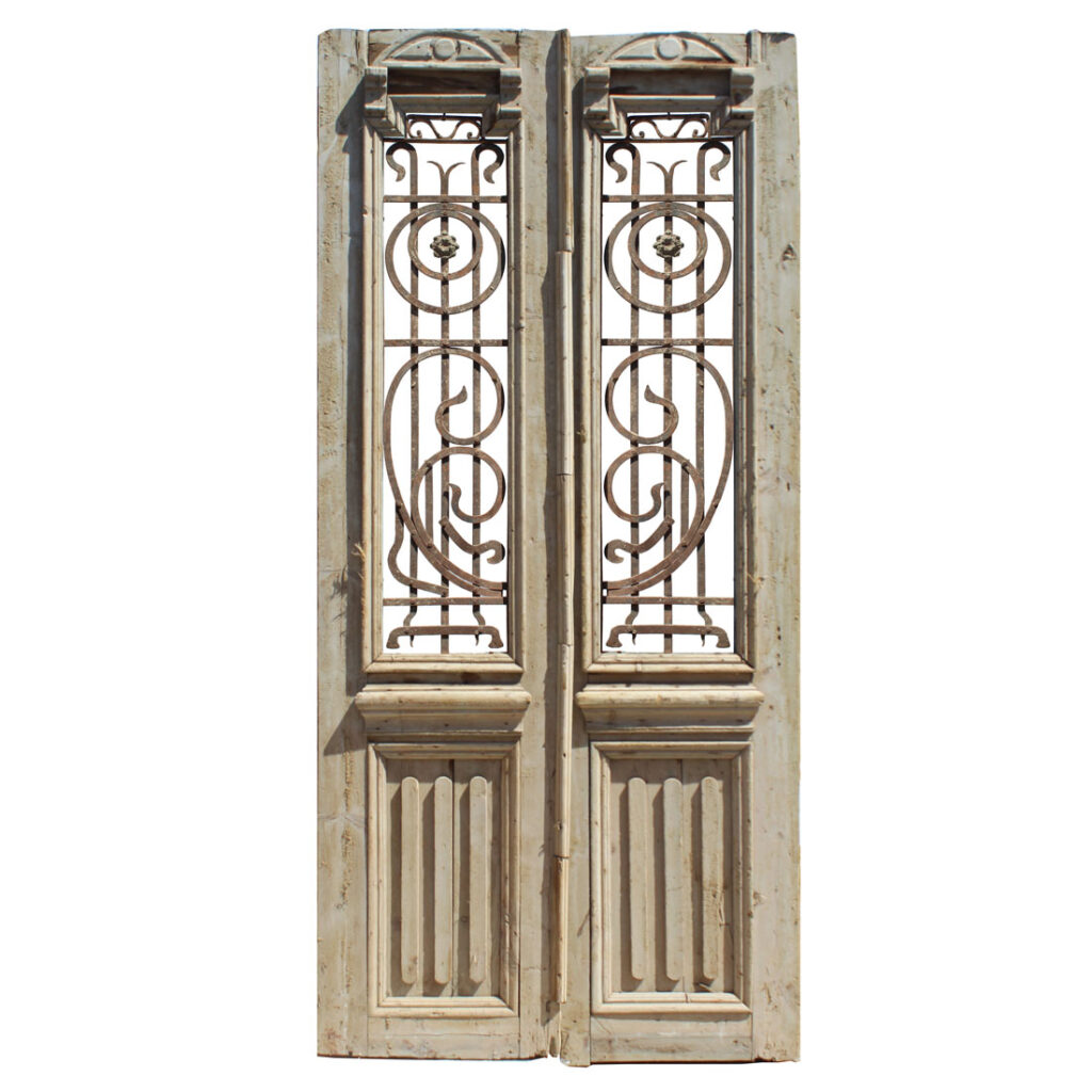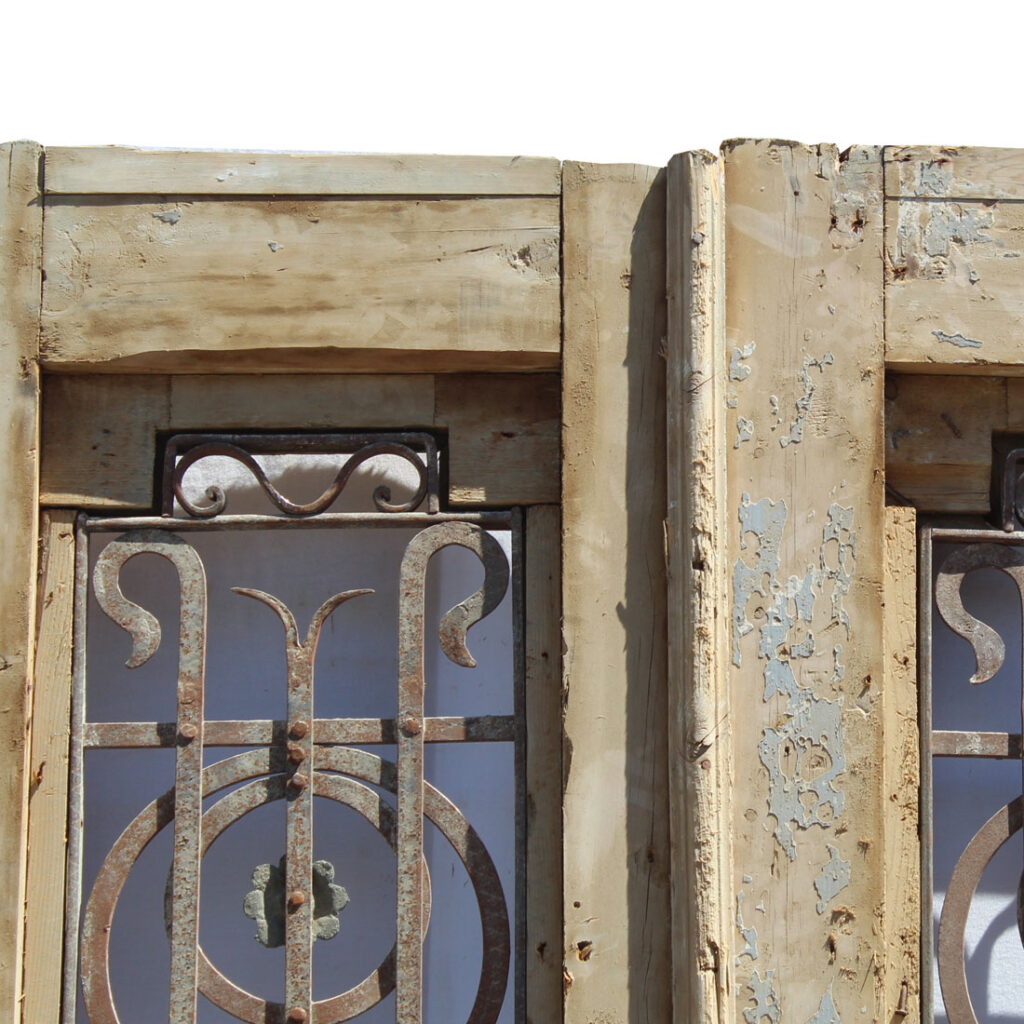 An incredible pair of antique French Colonial doors, dating from the late 19th century. Each half view door features a window ornamented with hand-forged and riveted ironwork atop heavy trimmed panels. The doors retain some of their non-functional hardware, and have the various dings, scratches, chips, and holes typical of an old door including some cracking to the panels; both doors are missing their glass (as pictured). The doors measure approximately 41-1/4″ wide overall by 90-1/4” tall and 1-7/8″ thick. They require a custom shipping quote; please contact us if you have any questions.