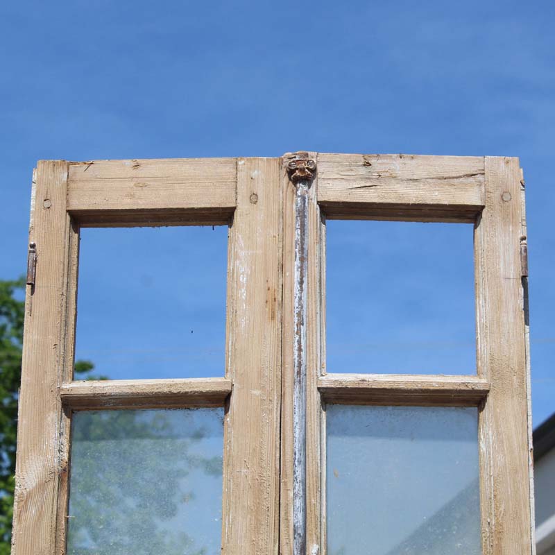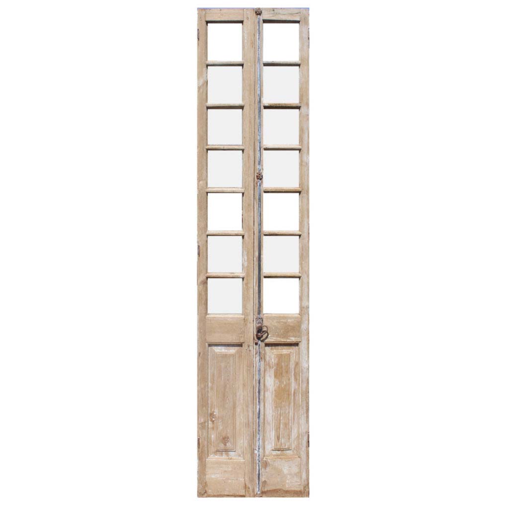 A darling pair of antique French double doors, dating from the early 1900s. Each narrow door features a row of windows perched above a raised wood panel. These double doors are in good antique condition with a wonderful stripped wood finish and the dings and scratches typical of an old door. They retain some of their non-functioning hardware, and the glass is missing, as pictured. They measure 21-3/4” wide collectively, 97-1/4″ tall, and 2″ thick. These doors require a custom shipping quote; please contact us if you have any questions.