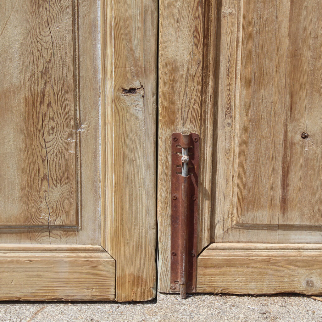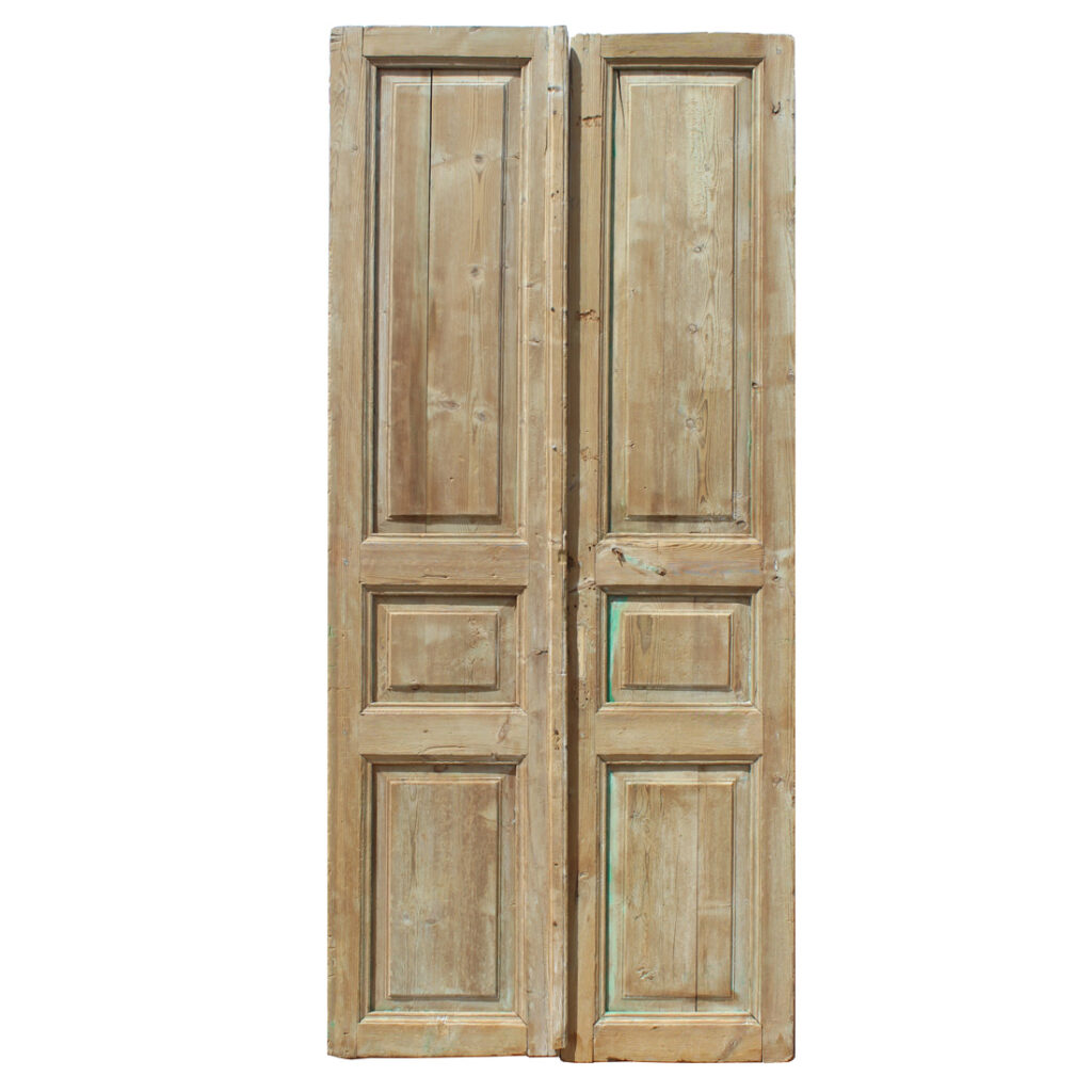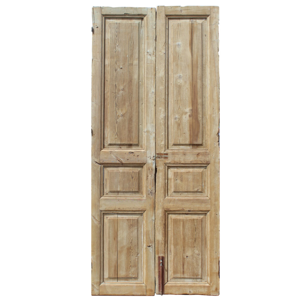 A fabulous pair of antique solid wood doors dating from the 19th century and salvaged from a French Colonial home. Each door features a three-panel configuration framed with raised panels. The doors have some of their original non-functioning hardware, and have various dings, scratches, chips, and holes typical of an old door; there is slight cracking in the door panels (as pictured). The doors collectively measure 42-5/8″ wide, 97-1/2” tall and 1-7/8” thick. These doors require a custom shipping quote; please contact us if you have any questions.