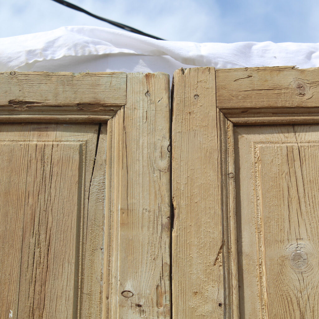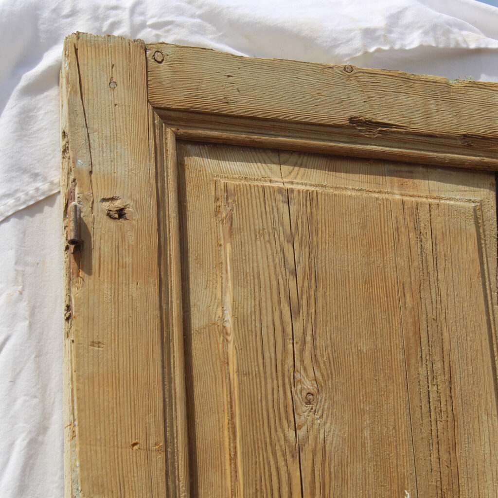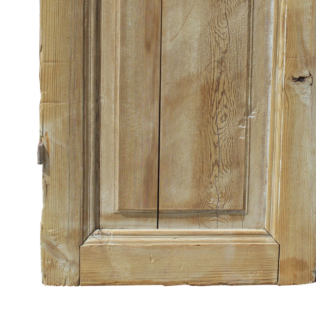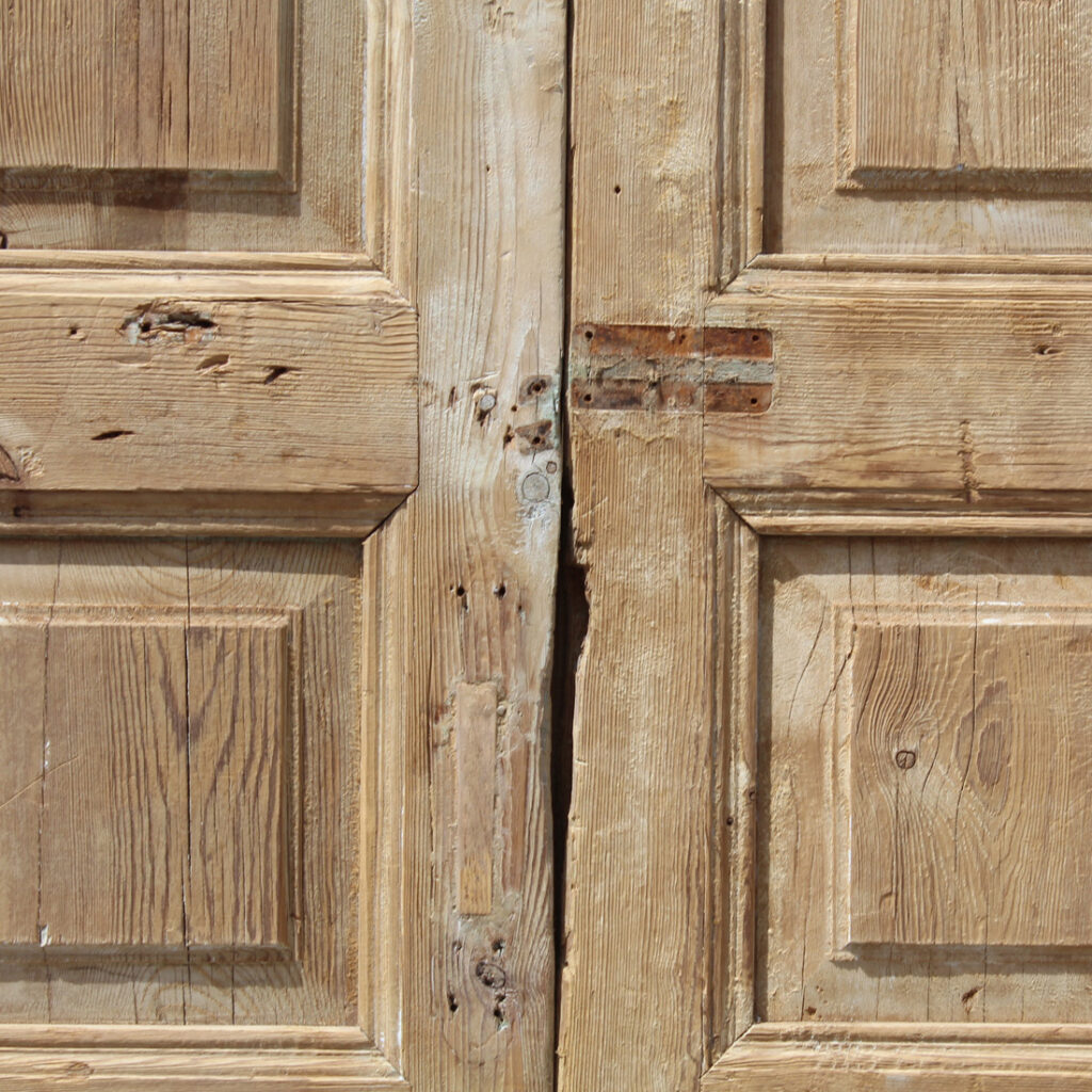 A fabulous pair of antique solid wood doors dating from the 19th century and salvaged from a French Colonial home. Each door features a three-panel configuration framed with raised panels. The doors have some of their original non-functioning hardware, and have various dings, scratches, chips, and holes typical of an old door; there is slight cracking in the door panels (as pictured). The doors collectively measure 42-5/8″ wide, 97-1/2” tall and 1-7/8” thick. These doors require a custom shipping quote; please contact us if you have any questions.