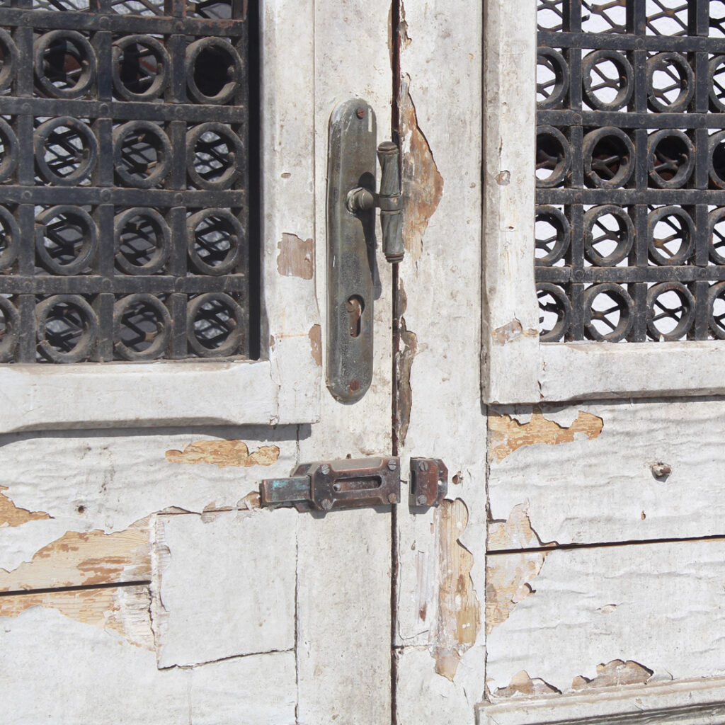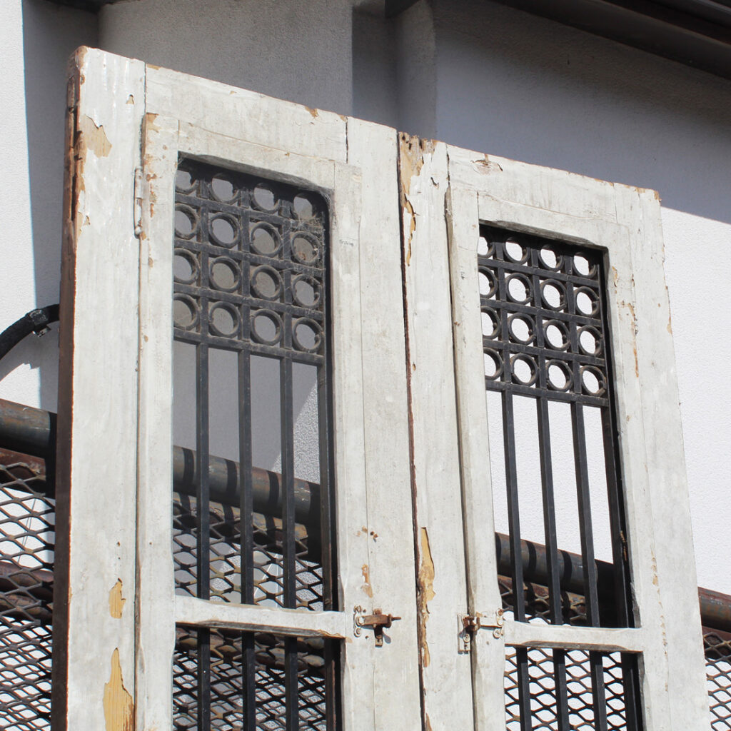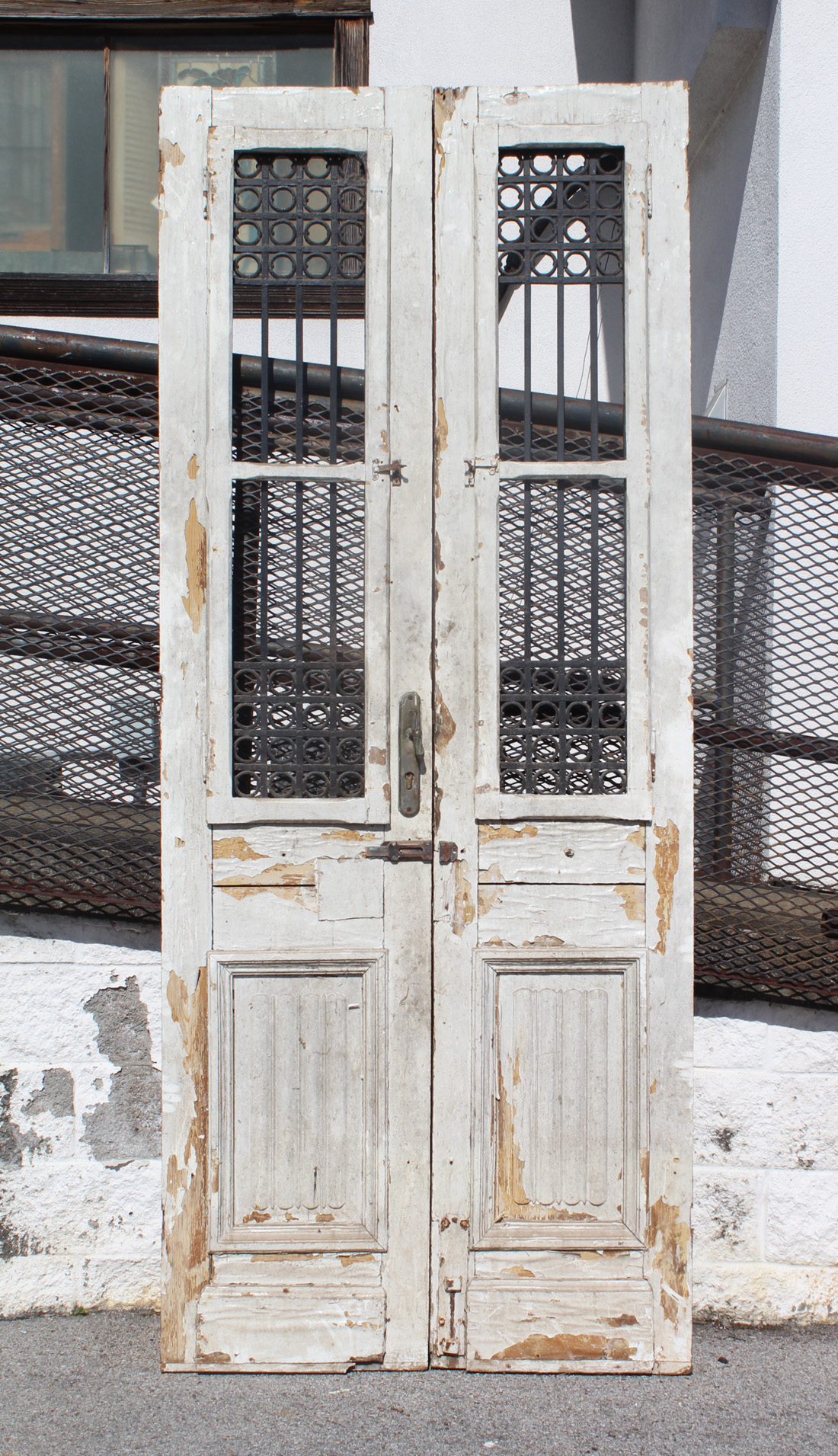 A fabulous pair of antique French Colonial doors, dating from the late 19th century. Each half view door features a window ornamented with hand-forged and riveted ironwork atop heavy trimmed panels. The doors retain some of their non-functional hardware, and have the various dings, scratches, chips, and holes typical of an old door including some cracking to the rails; both doors are missing their glass (as pictured). The doors measure approximately 40-1/4″ wide overall by 98-1/4” tall and 1-7/8″ thick. They require a custom shipping quote; please contact us if you have any questions.