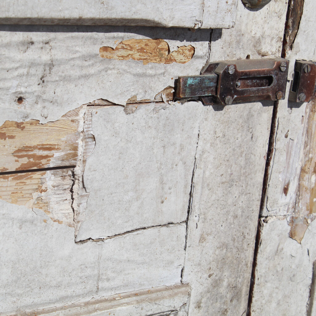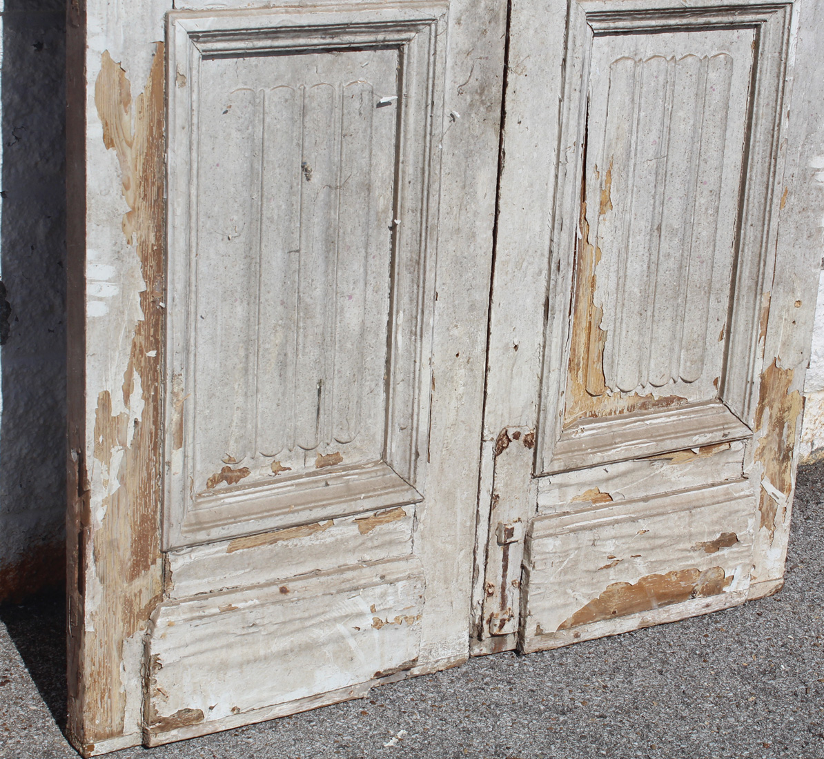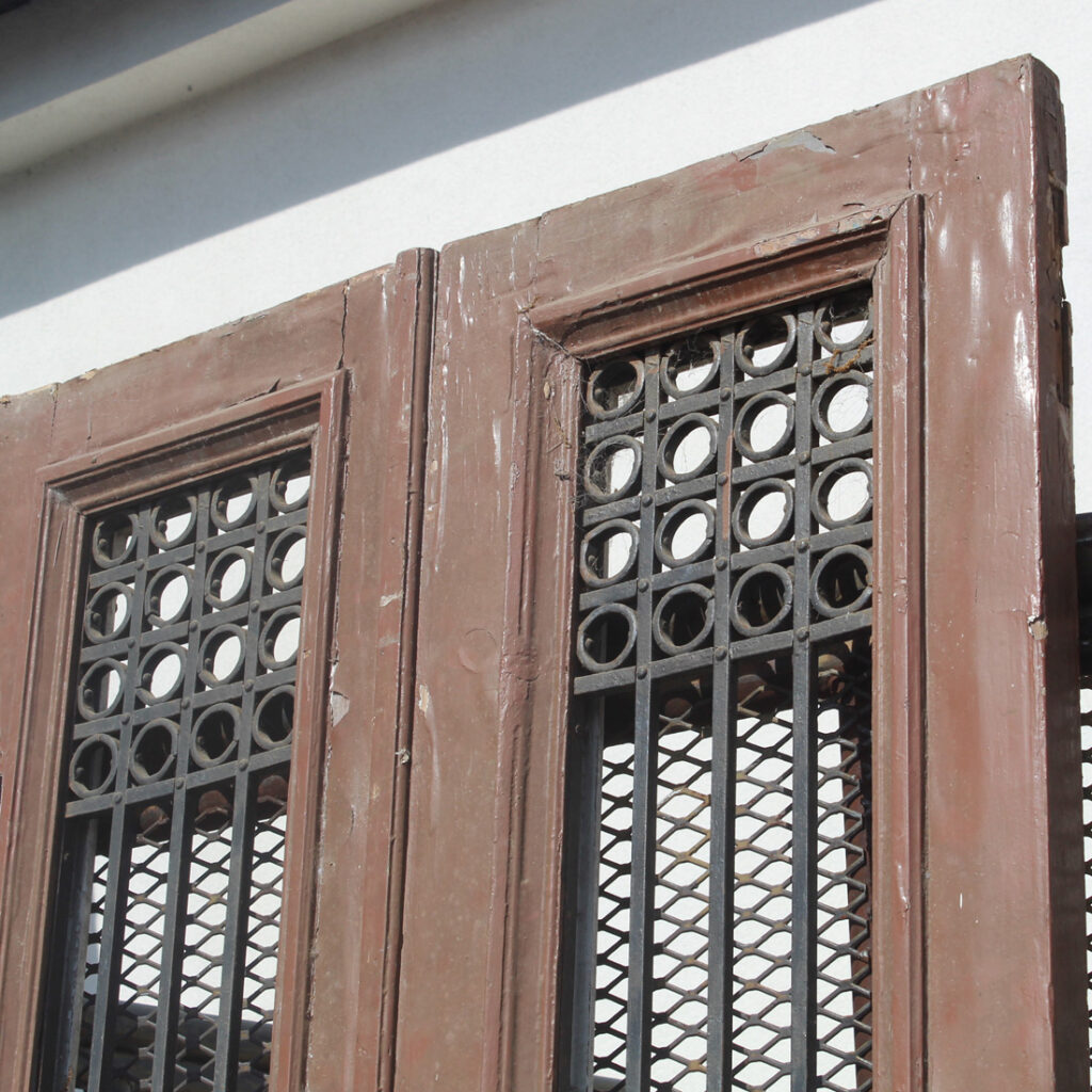 A fabulous pair of antique French Colonial doors, dating from the late 19th century. Each half view door features a window ornamented with hand-forged and riveted ironwork atop heavy trimmed panels. The doors retain some of their non-functional hardware, and have the various dings, scratches, chips, and holes typical of an old door including some cracking to the rails; both doors are missing their glass (as pictured). The doors measure approximately 40-1/4″ wide overall by 98-1/4” tall and 1-7/8″ thick. They require a custom shipping quote; please contact us if you have any questions.