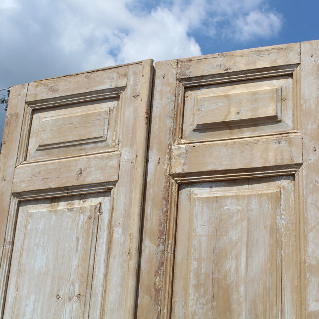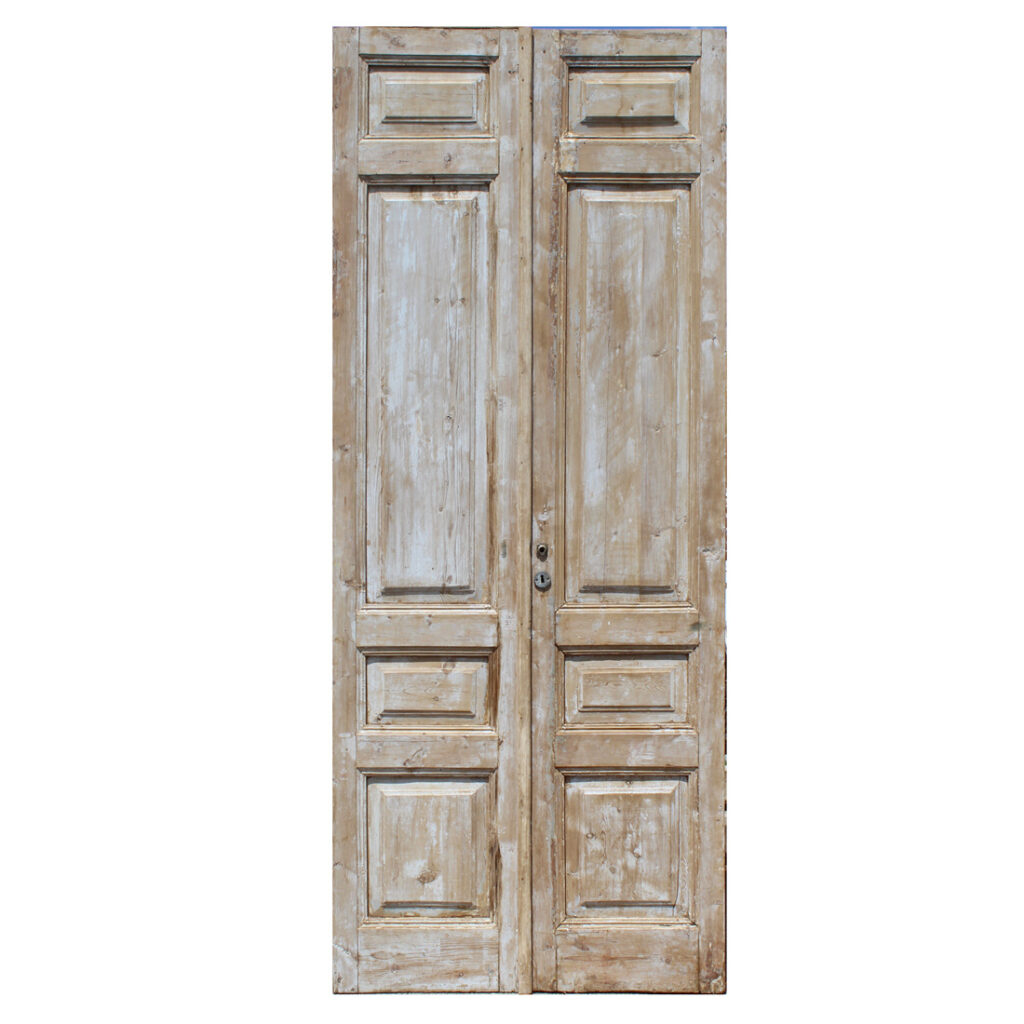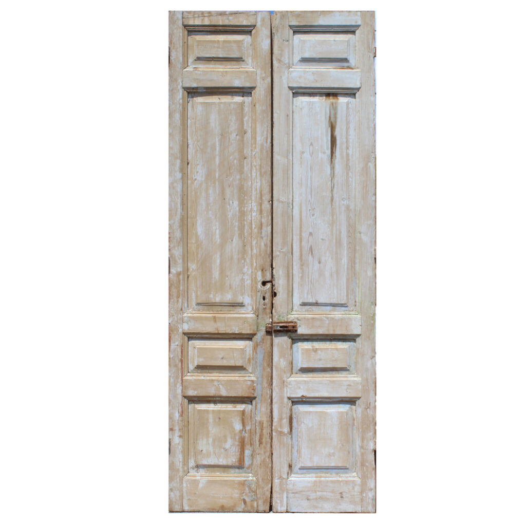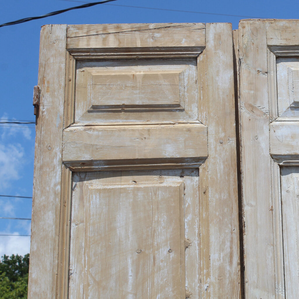 An incredible pair of antique solid doors, dating from the late 19th century and salvaged from a French Colonial home. Each door features a four-panel configuration with and raised panels. The doors have the various dings, scratches, chips, and holes typical of an old door (as pictured). The doors collectively measure 43-1/4″ wide, 106” tall and 1-7/8” thick. These doors require a custom shipping quote; please contact us if you have any questions.