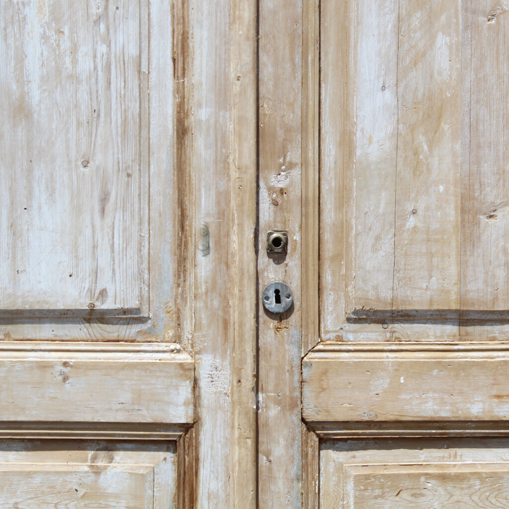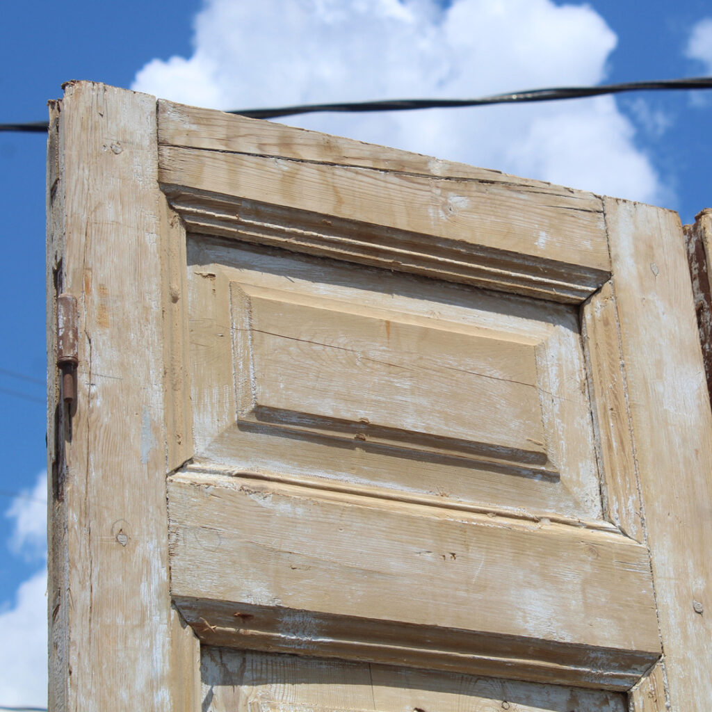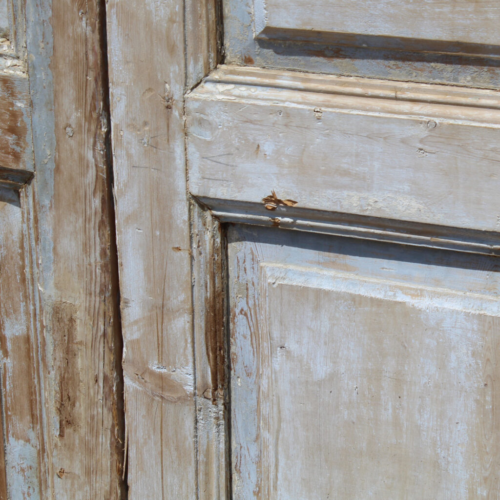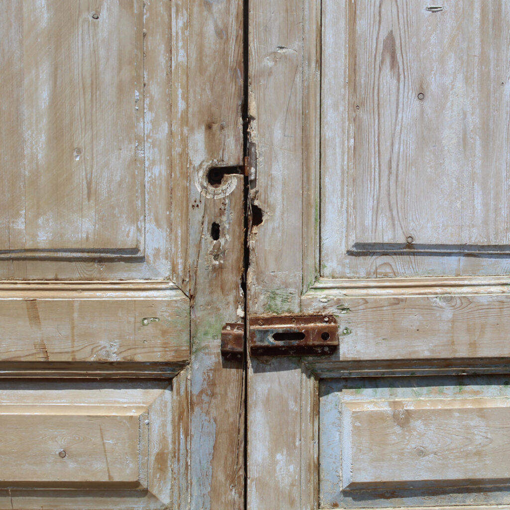 An incredible pair of antique solid doors, dating from the late 19th century and salvaged from a French Colonial home. Each door features a four-panel configuration with and raised panels. The doors have the various dings, scratches, chips, and holes typical of an old door (as pictured). The doors collectively measure 43-1/4″ wide, 106” tall and 1-7/8” thick. These doors require a custom shipping quote; please contact us if you have any questions.
