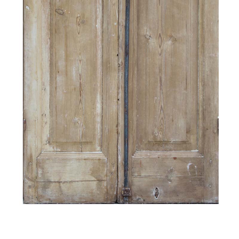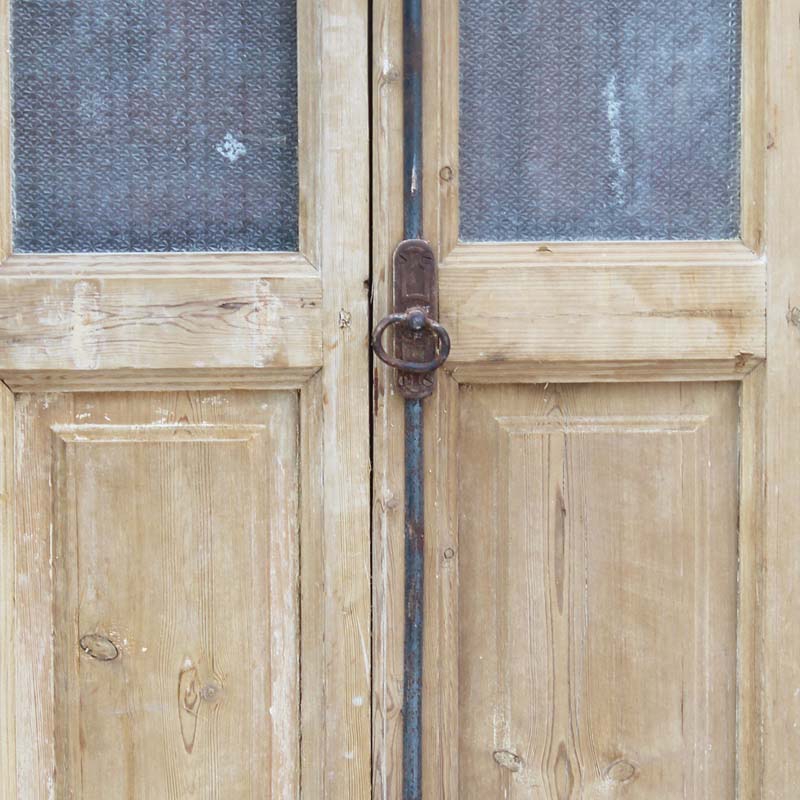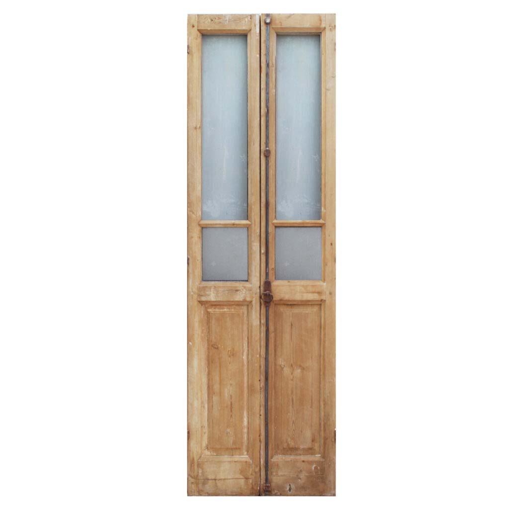 A darling pair of antique French double doors, dating from the early 1900s. Each narrow door features divided light windows perched above a raised wood panel. These double doors are in very good antique condition with a wonderful stripped wood finish and the dings and scratches typical of an old door. They retain some of their non-functioning hardware, and the glass is miss-matched, as pictured. They measure 28” wide collectively, 92-3/4″ tall, and 1-7/8″ thick. These doors require a custom shipping quote; please contact us if you have any questions.