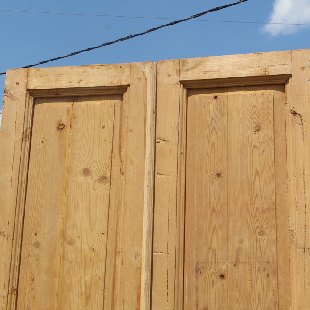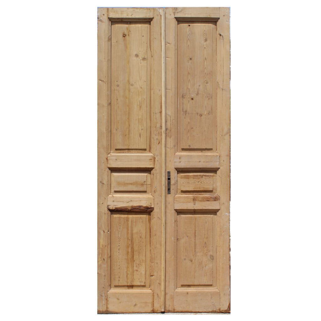 A beautiful pair of antique solid doors dating from the late 19th century and salvaged from a French Colonial home. Each door features a three-panel configuration with raised panels. They are in good antique condition with some of its original chippy paint, and have the various dings, scratches, chips, and holes typical of an old door; one of the rails has slight damage, as pictured. The doors collectively measure 43-1/4″ wide, 100” tall and 2” thick. These doors require a custom shipping quote; please contact us if you have any questions.