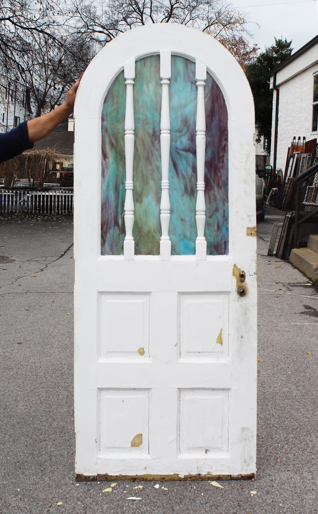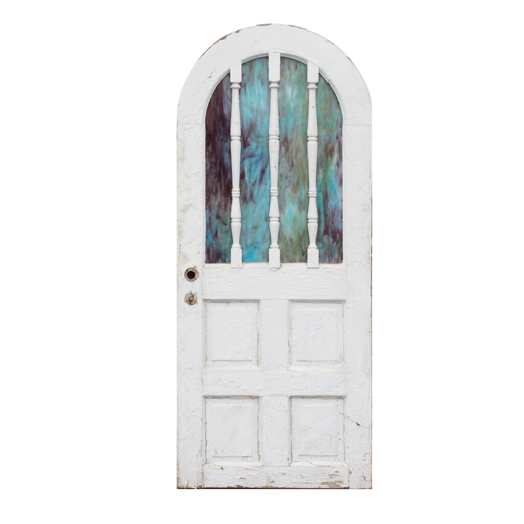 A charming antique arched door with a half-view window of divided slag glass panels, salvaged from the historic “Windsor” home—also known as the Castle Above the Clouds—perched atop Lookout Mountain, Tennessee. Built in the 1930s by George and Elizabeth Scholze, the residence reflects the couple’s refined taste and attention to detail. George Scholze, second-generation owner of the prominent Scholze Tannery in Chattanooga, helped earn the city its nickname, “Saddle Capital of the World.”