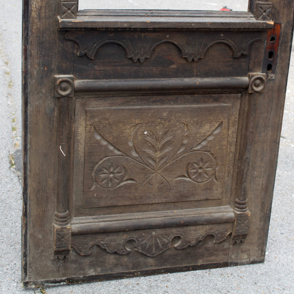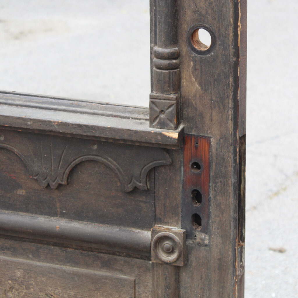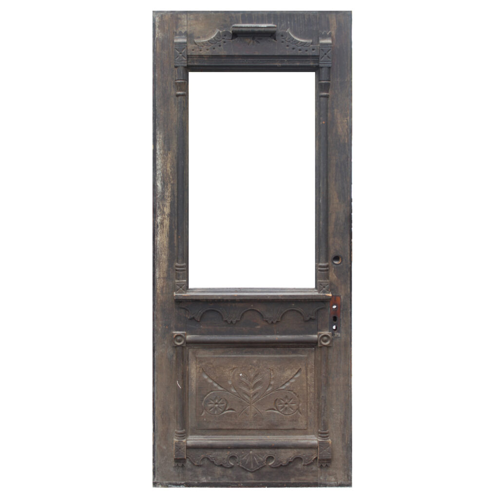 A stunning antique Eastlake door, dating from the late 1800’s and salvaged from a home in Indianapolis, IN. This stained door features a half view window surrounded by decorative trim, perched above a playful carved wood panel below. It is in good antique condition with the expected chips, dings, and holes typical of an old door; the door is missing its glass (as pictured). This reclaimed door measures 32″ wide, 78-1/2″ tall, and 1-3/8″ thick. It requires a custom shipping quote; please contact us if you have any questions. A coordinating door can be found under product code NED2670-RW.