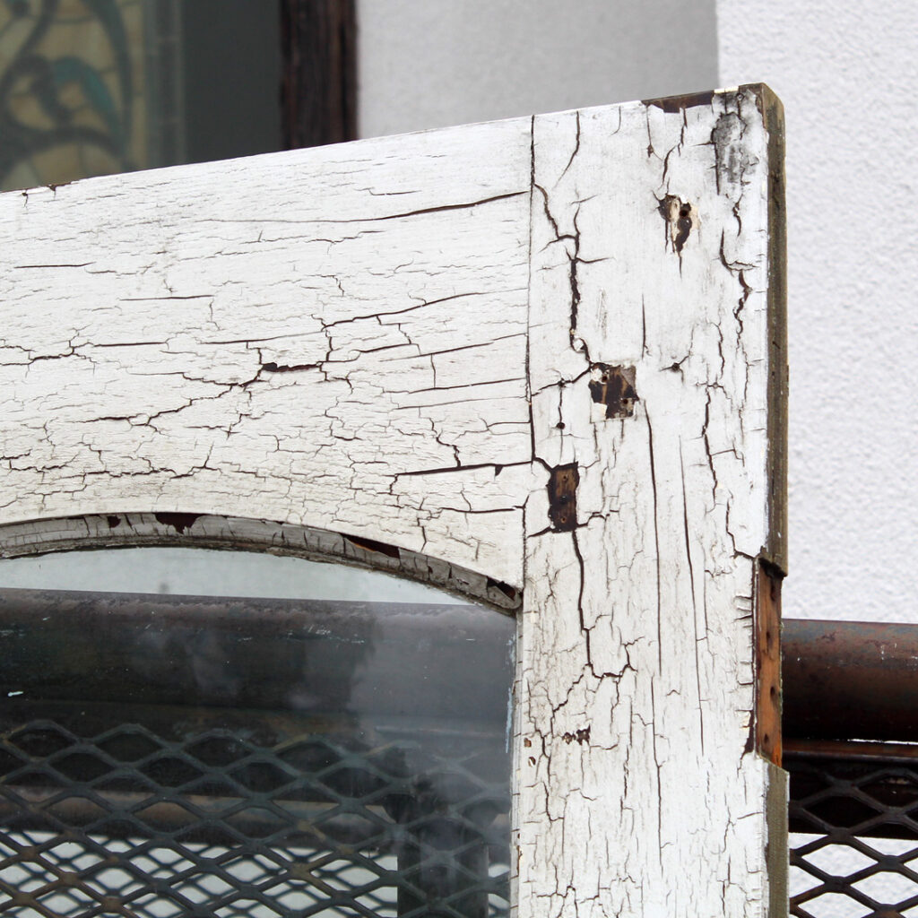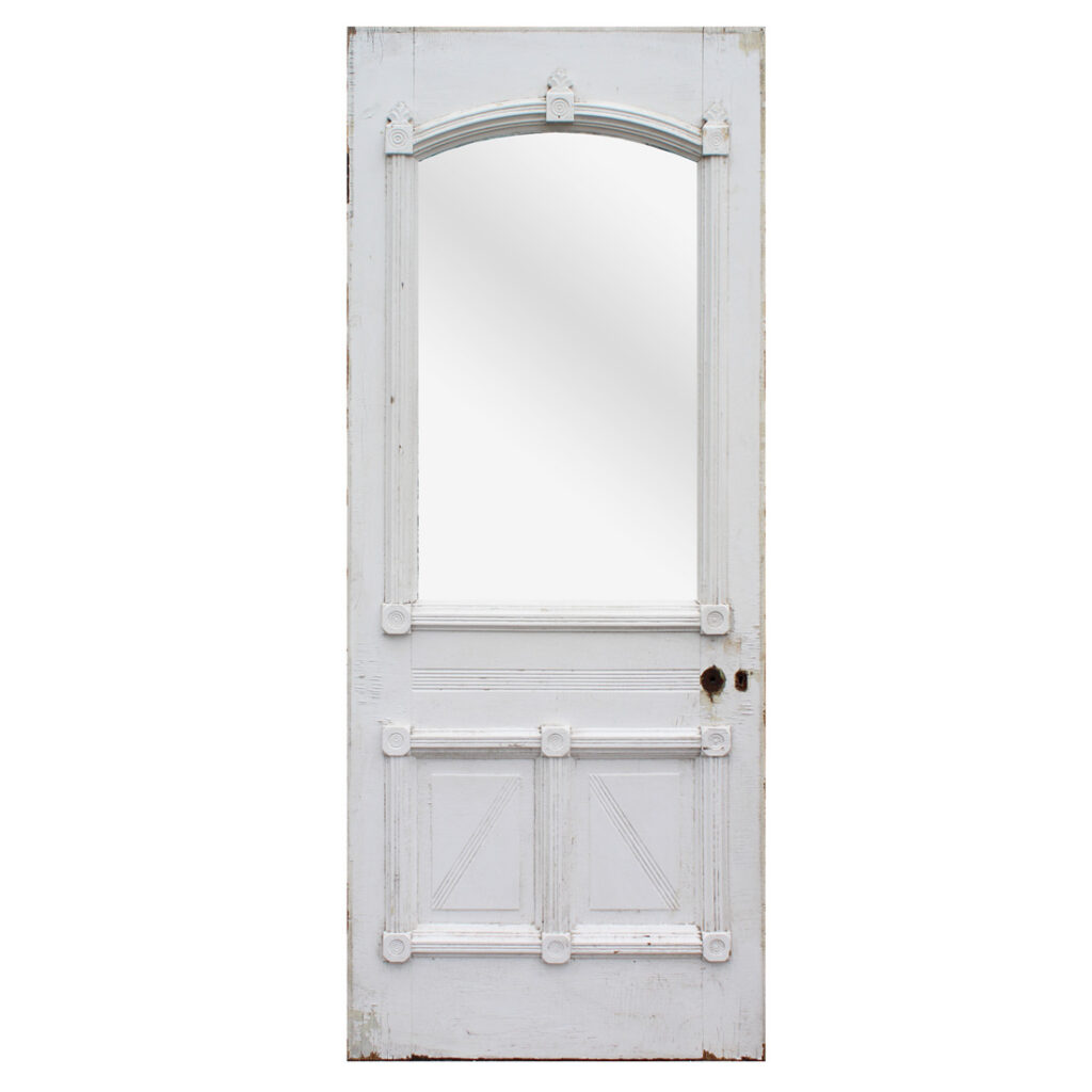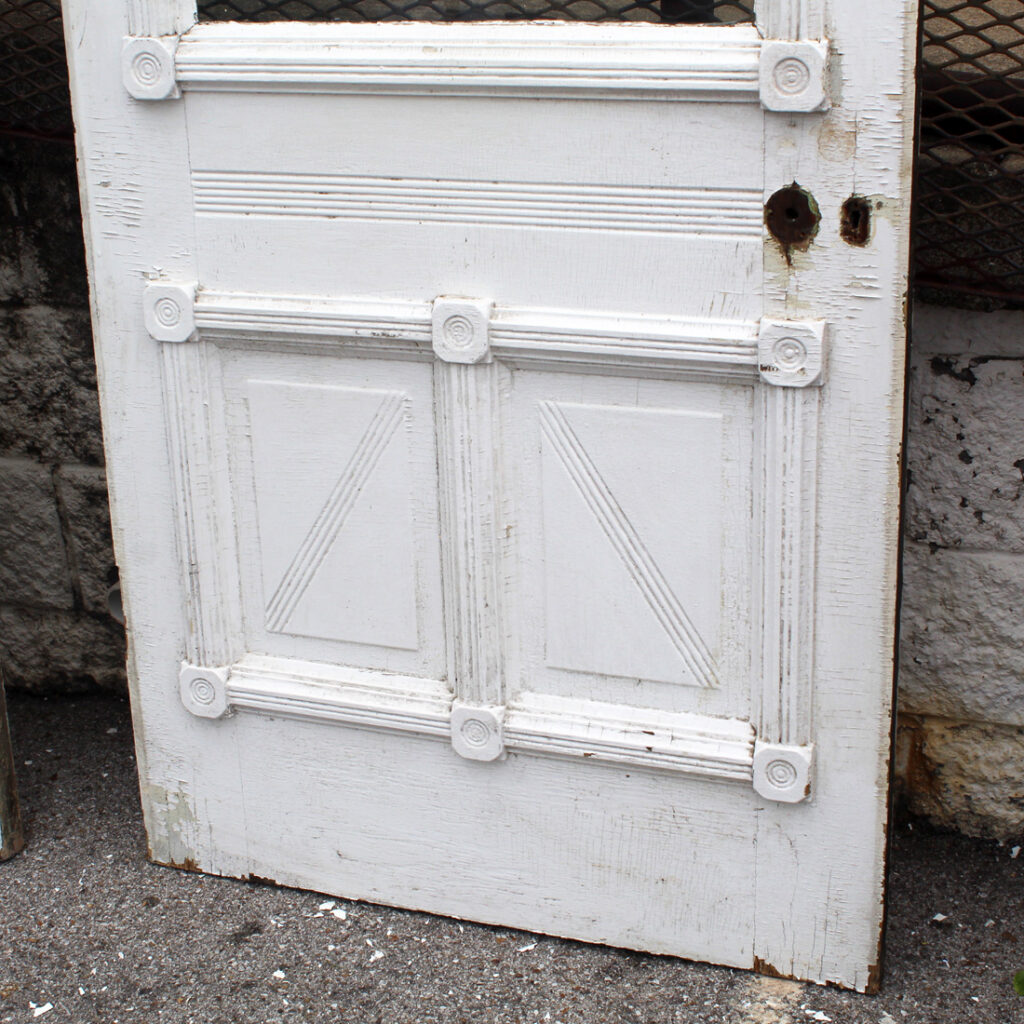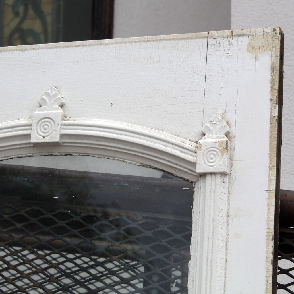 A gorgeous antique Eastlake door, dating from the 1880s and salvaged from a home in Indiana. This old door features a half-view arched window, chippy paint, and playful raised trim. The door is in good antique condition with the expected chips, dings, and wear typical of an old door (as pictured). It measures approx. 32″ wide, 80″ tall, and 1-3/8″ thick. This door requires a custom shipping quote; please contact us if you have any questions. Coordinating doors can be found under product codes NED2681-RW & NED2669-RW.