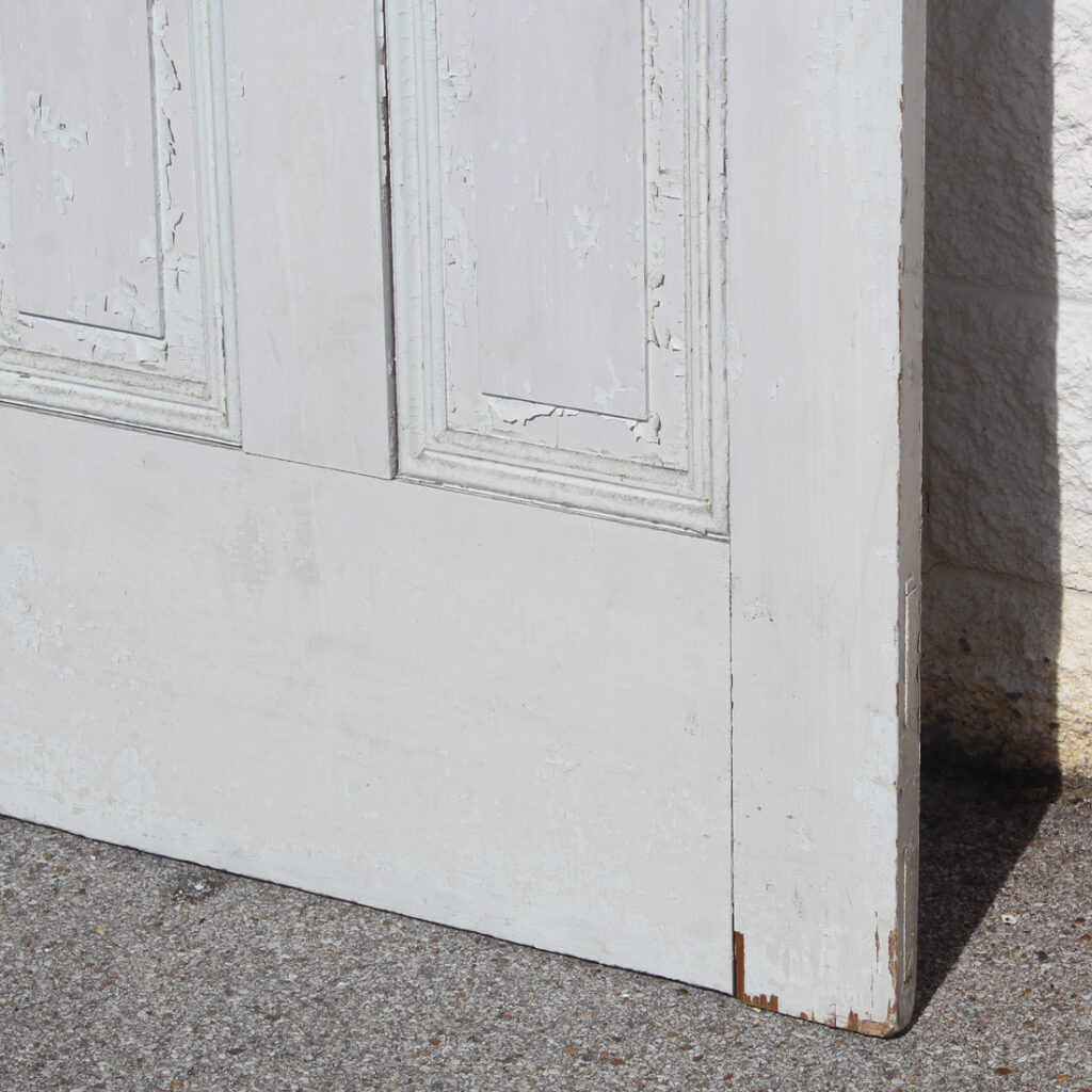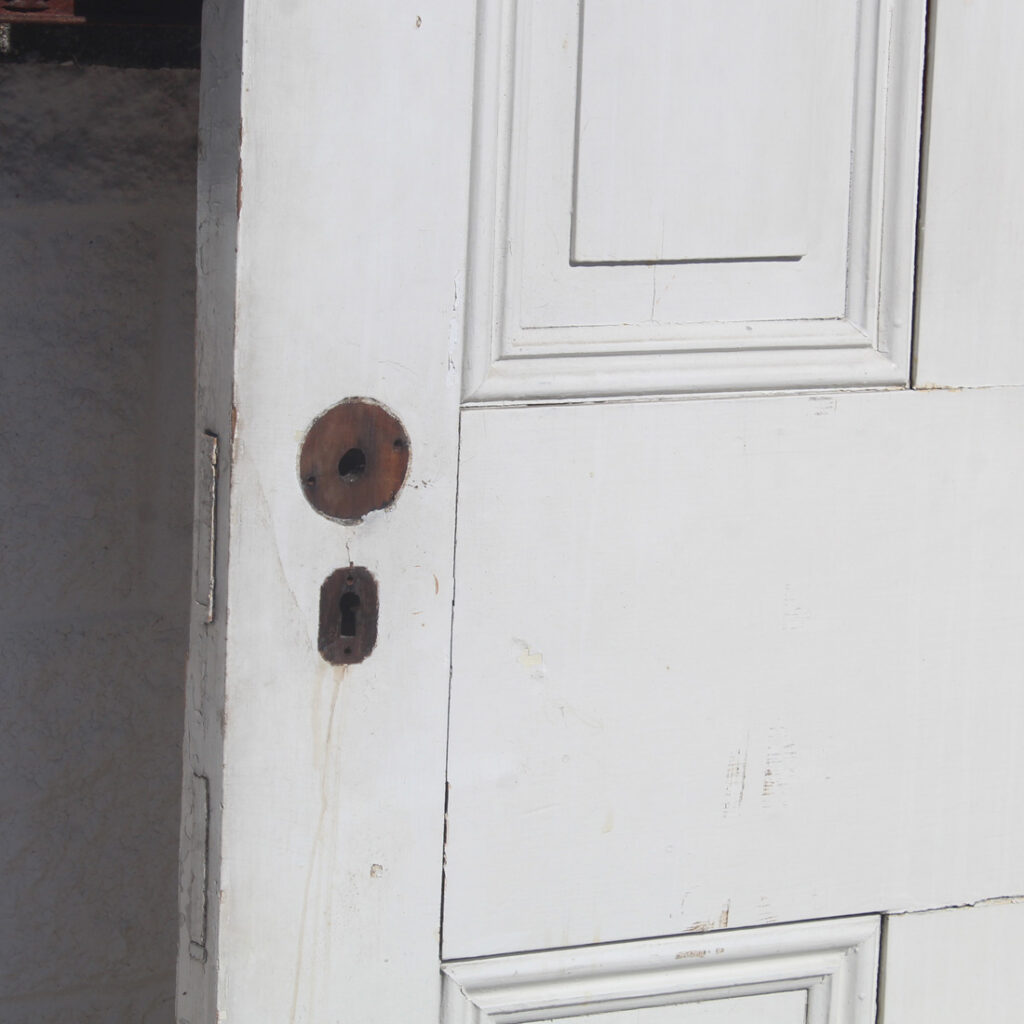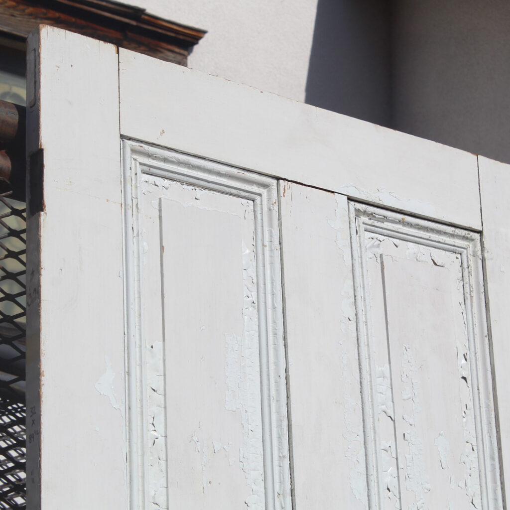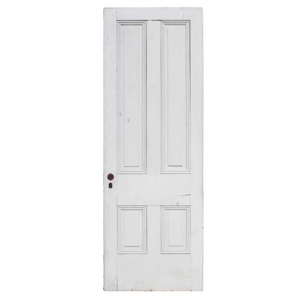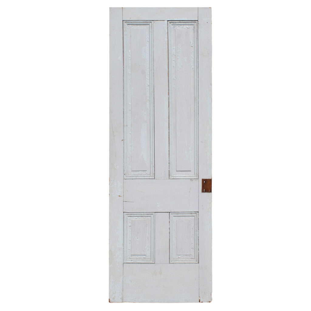 A charming antique wood door, dating from the late 1800’s. This door features an understated four-panel configuration framed with beveled trim. The door has a splendid chippy paint finish, and is in good antique condition with the various dings, scratches, and chips typical of an old door (as pictured). It measures approximately 32″ wide, 89-1/2” tall and 1-3/8” thick. Due to the size, this door requires a custom shipping quote; please contact us if you have any questions.