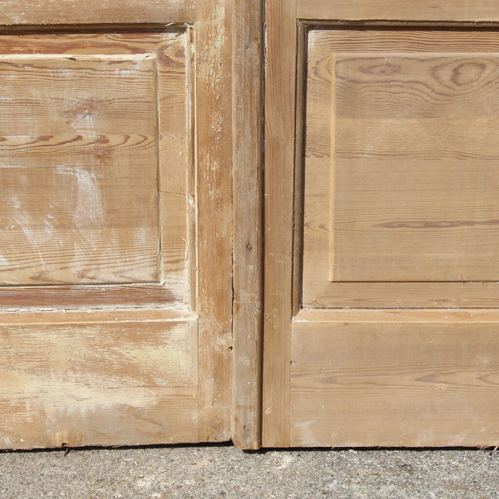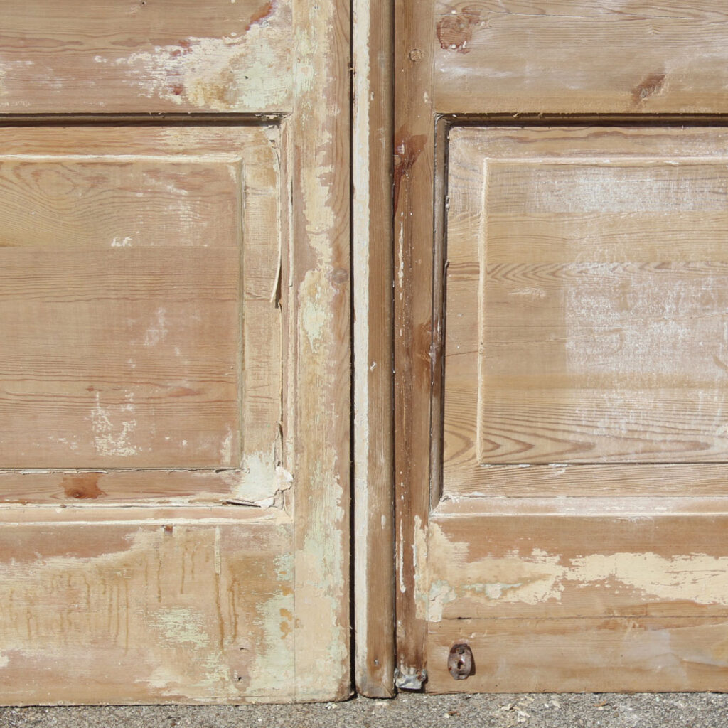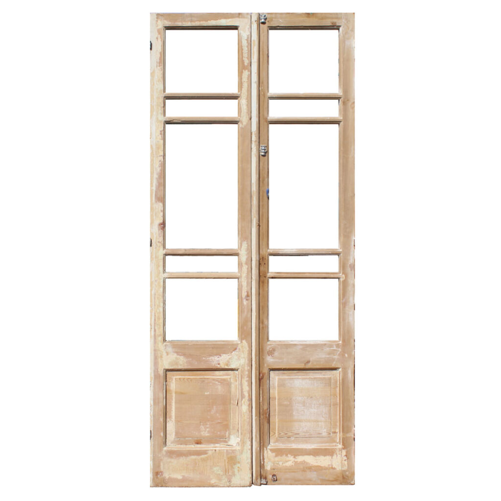 A marvelous pair of antique French double doors, dating from the turn of the century. Each door features half-view divided-light windows perched above an inset wood panel below. These double doors are in good antique condition with a wonderful stripped wood finish. The doors retain some of their original non-functioning hardware, and have the dings and scratches typical of an old door; the doors are each missing their glass (as pictured). They measure 36-3/8” wide collectively, 86-3/8″ tall, and 1-3/4″ thick. These doors require a custom shipping quote; please contact us if you have any questions.