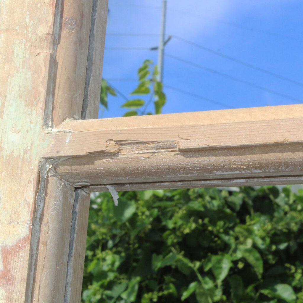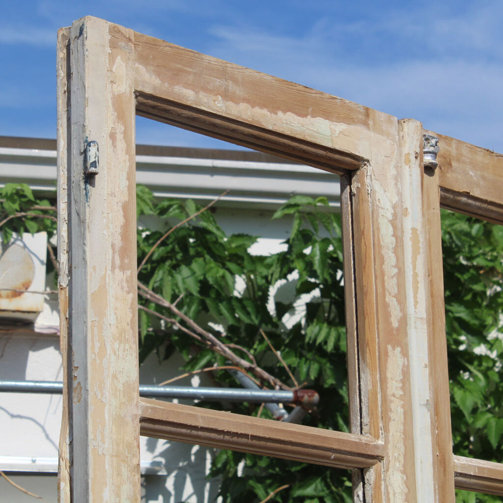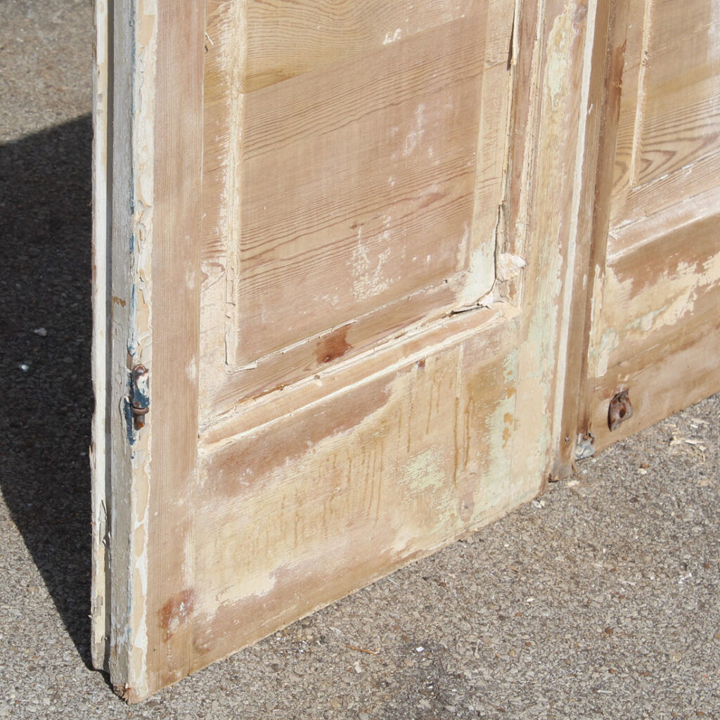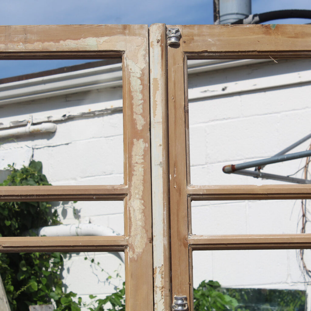 A marvelous pair of antique French double doors, dating from the turn of the century. Each door features half-view divided-light windows perched above an inset wood panel below. These double doors are in good antique condition with a wonderful stripped wood finish. The doors retain some of their original non-functioning hardware, and have the dings and scratches typical of an old door; the doors are each missing their glass (as pictured). They measure 36-3/8” wide collectively, 86-3/8″ tall, and 1-3/4″ thick. These doors require a custom shipping quote; please contact us if you have any questions.