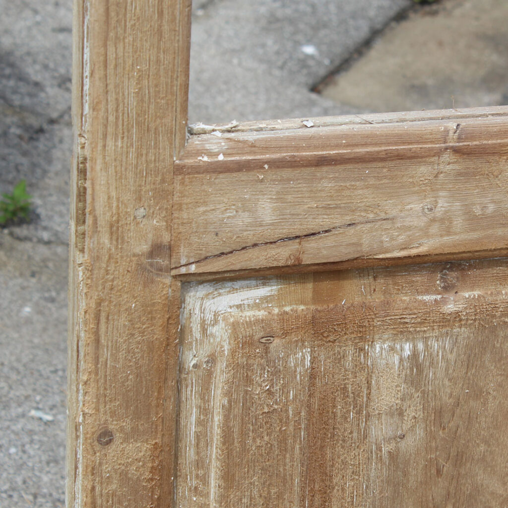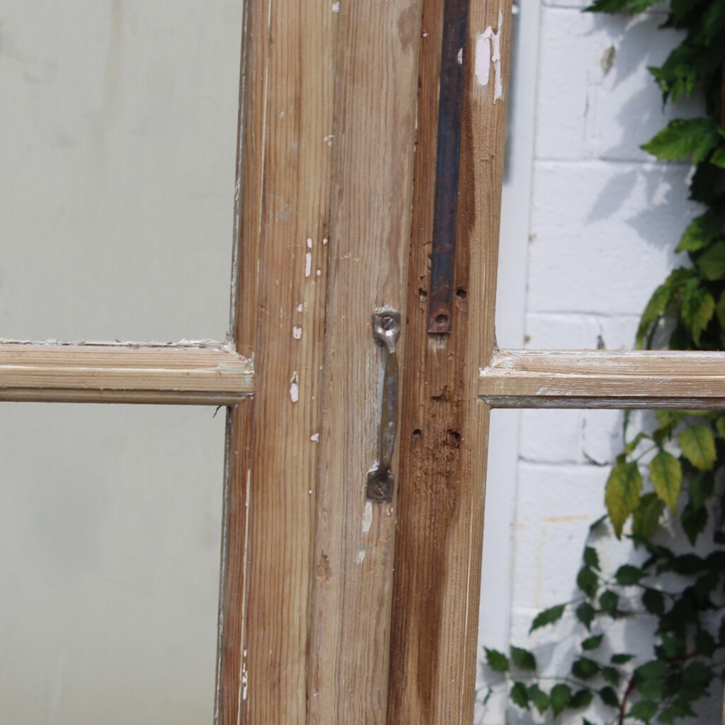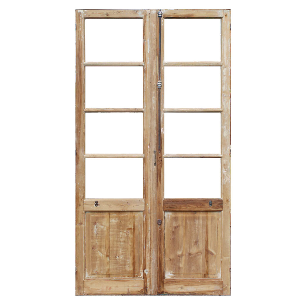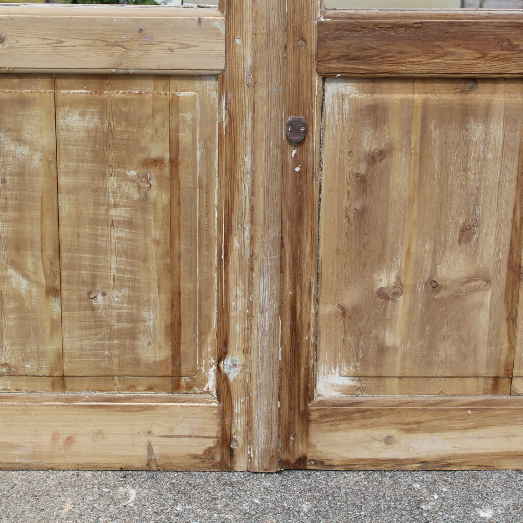 A beautiful pair of antique French double doors, dating from the turn of the century. Each door features 3/4 view divided-light windows perched above an inset wood panel below. These double doors are in good antique condition with a wonderful stripped wood finish. The doors retain some of their original non-functioning hardware, and have the dings and scratches typical of an old door including cracking in the panels; the doors are each missing their glass (as pictured). They measure 43” wide collectively, 83″ tall, and 1-3/4″ thick. These doors require a custom shipping quote; please contact us if you have any questions.