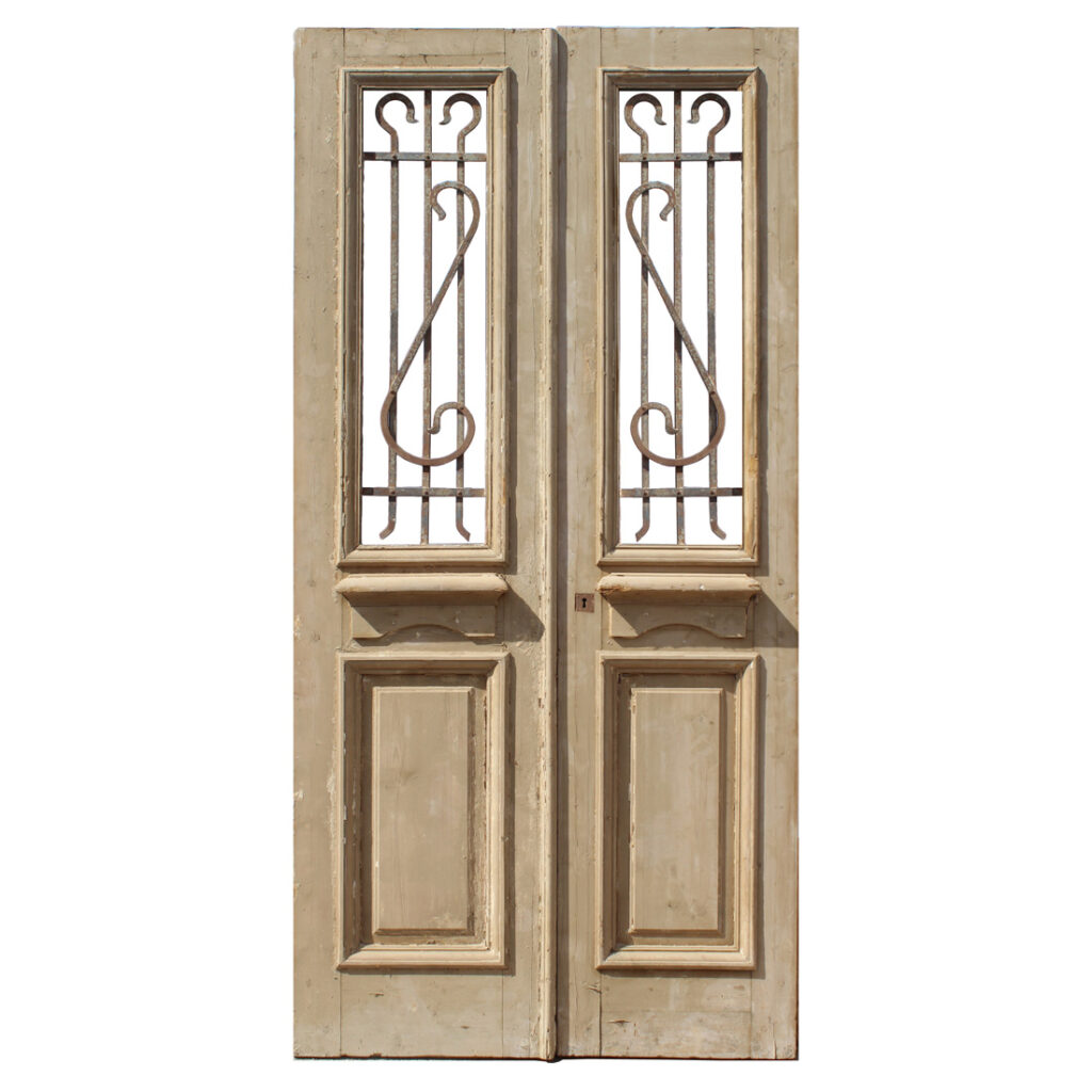 A fantastic pair of antique French Colonial doors, dating from the late 19th century. Each half glass door features a window ornamented with hand-forged and riveted ironwork atop heavy trimmed panels. A window is hinged on the interior side of each door, allowing it to be opened for ventilation. The doors retain some of their non-functional hardware, and have the various dings, scratches, chips, and holes typical of an old door including some cracking to the panels; both doors are missing their glass (as pictured). The doors measure approximately 44-1/4″ wide overall by 94-3/4” tall and 1-3/4″ thick. They require a custom shipping quote; please contact us if you have any questions.