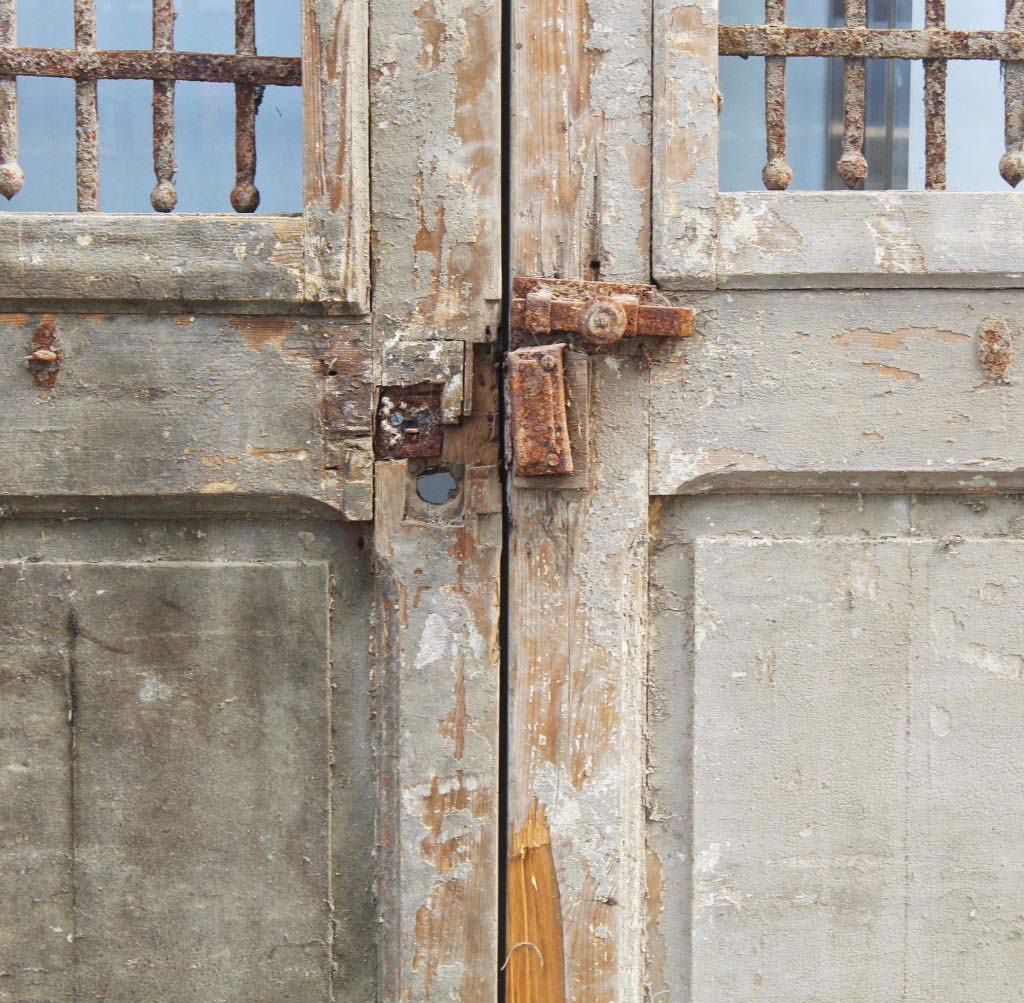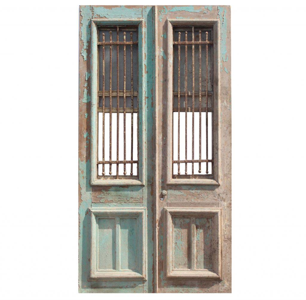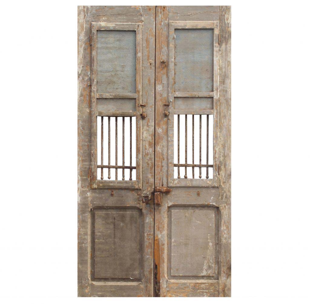 A beautiful pair of antique French Colonial doors, dating from the late 19th century. Each half glass door features a window ornamented with hand-forged and riveted ironwork atop heavy trimmed panels. The window is hinged on the interior side of the door, allowing it to be opened for ventilation. The doors have the various dings, scratches, chips, and holes typical of an old door, and are missing the glass panes (as pictured). The doors collectively measure 47-3/8″ wide, 90”tall and 1-7/8” thick. They require a custom shipping quote; please contact us if you have any questions.