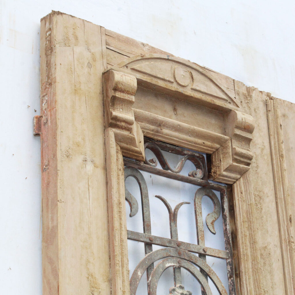 A beautiful pair of antique French Colonial doors, dating from the late 19th century. Each half view door features a window ornamented with hand-forged and riveted ironwork atop heavy trimmed panels. The doors retain some of their non-functional hardware, and have the various dings, scratches, chips, and holes typical of an old door including some cracking to the panels; both doors are missing their glass (as pictured). The doors measure approximately 42-5/8″ wide overall by 89-5/8” tall and 1-7/8″ thick. They require a custom shipping quote; please contact us if you have any questions.