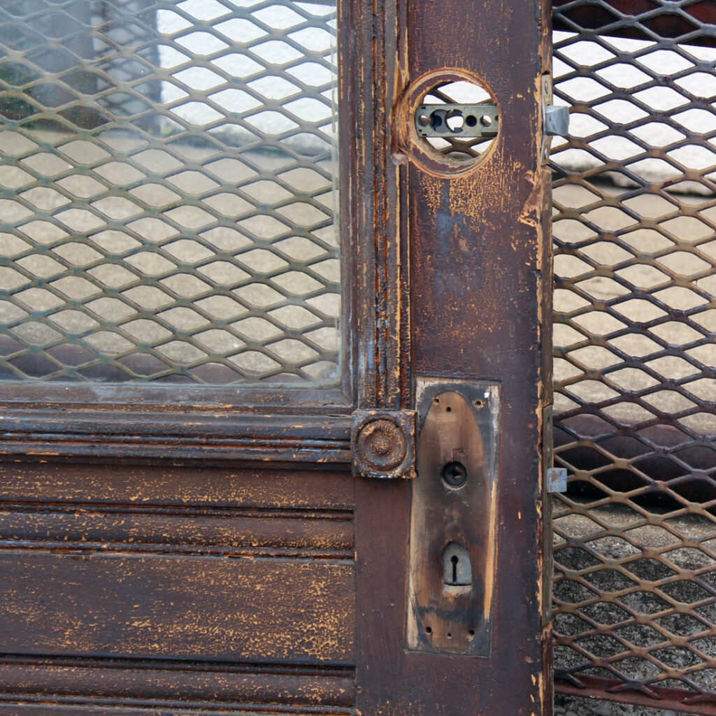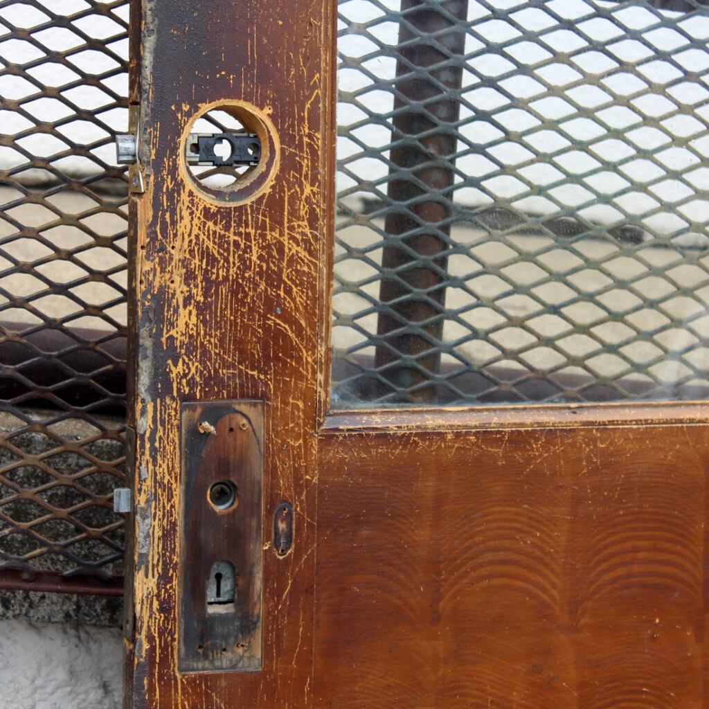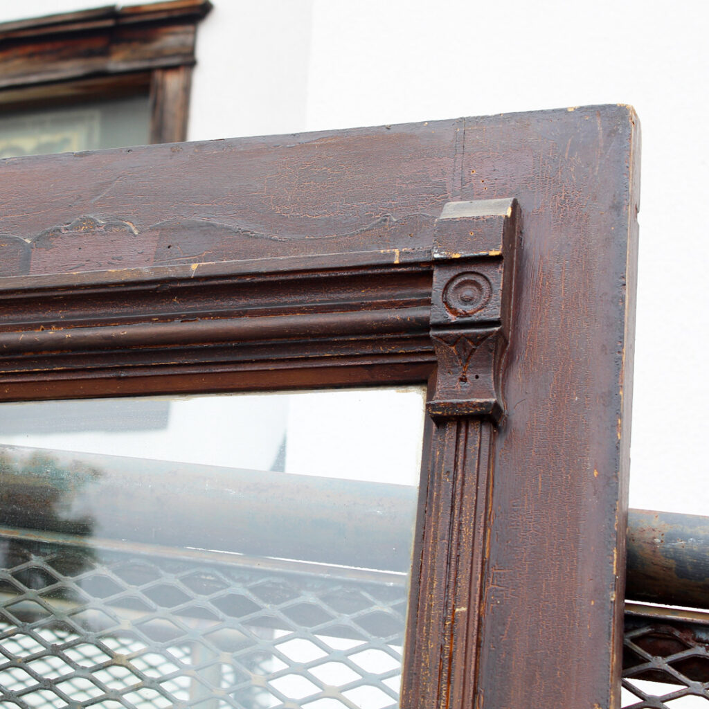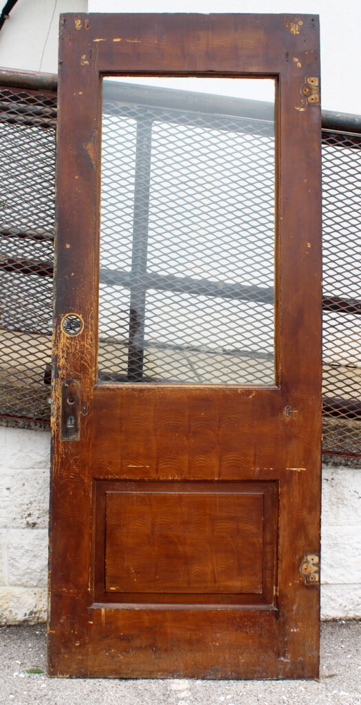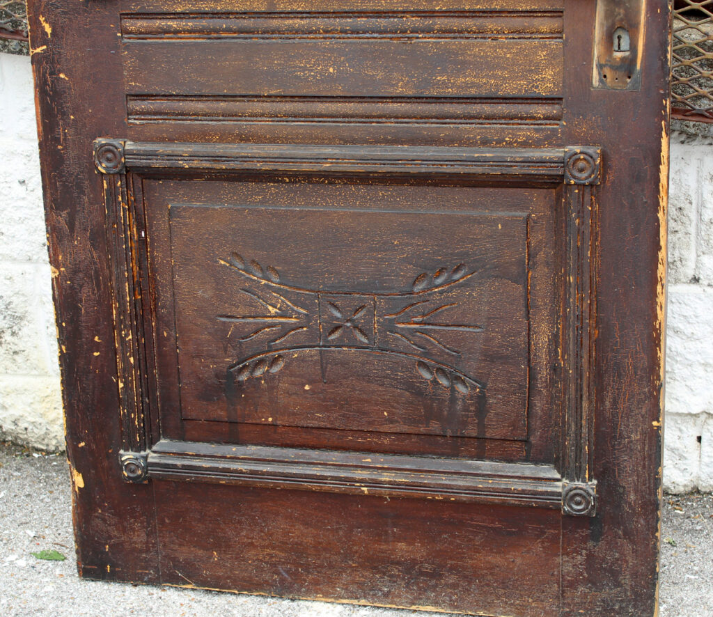 A gorgeous antique cottage door, dating from the late 1800’s and salvaged from a home in Lexington, KY. This old door features a half view window perched above decorative trim and a carved wood panel. It is in good antique condition with the expected chips and dings typical of an old door, as pictured. This reclaimed door measures 32″ wide, 79-1/2″ tall, and 1-3/8″ thick. It requires a custom shipping quote; please contact us if you have any questions.