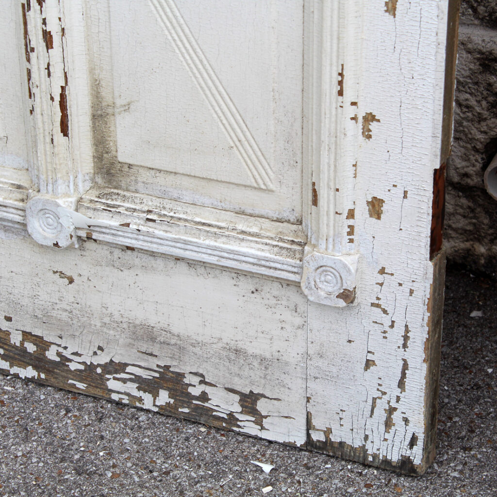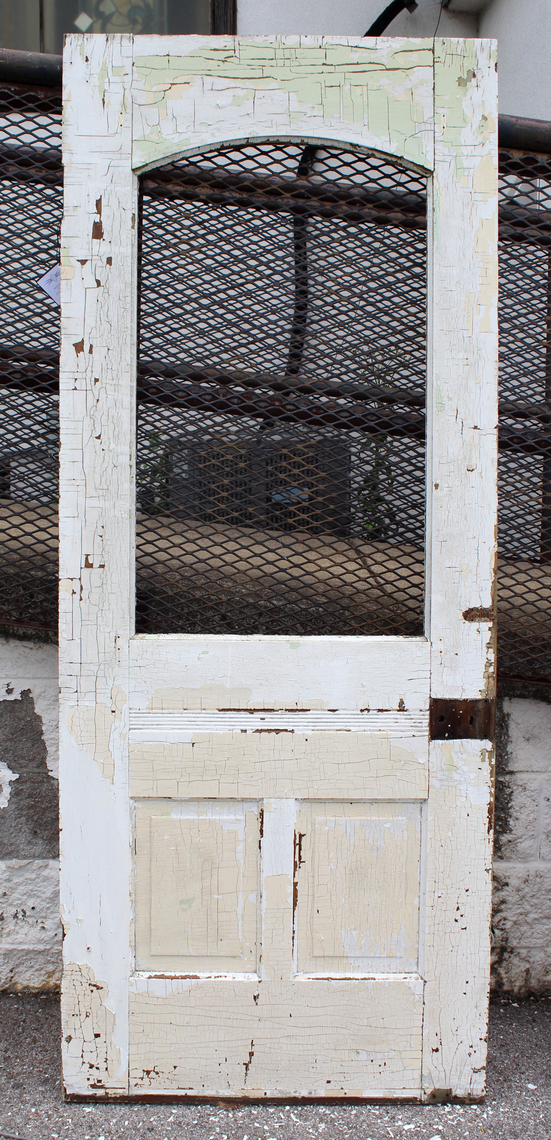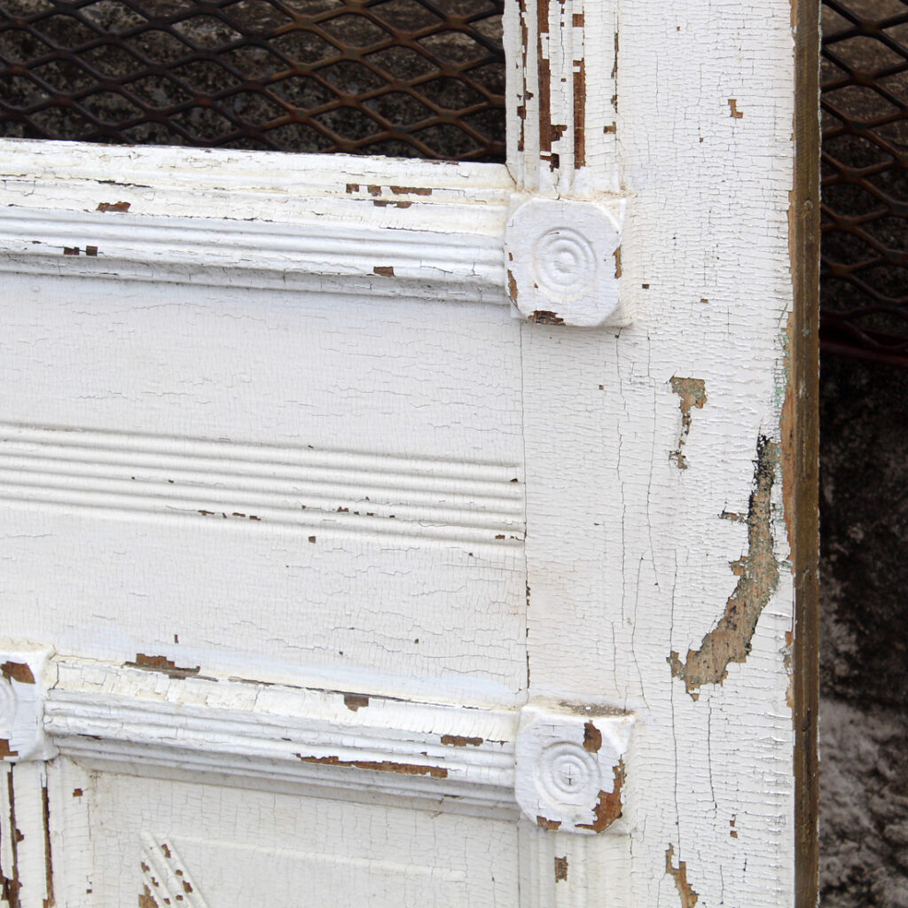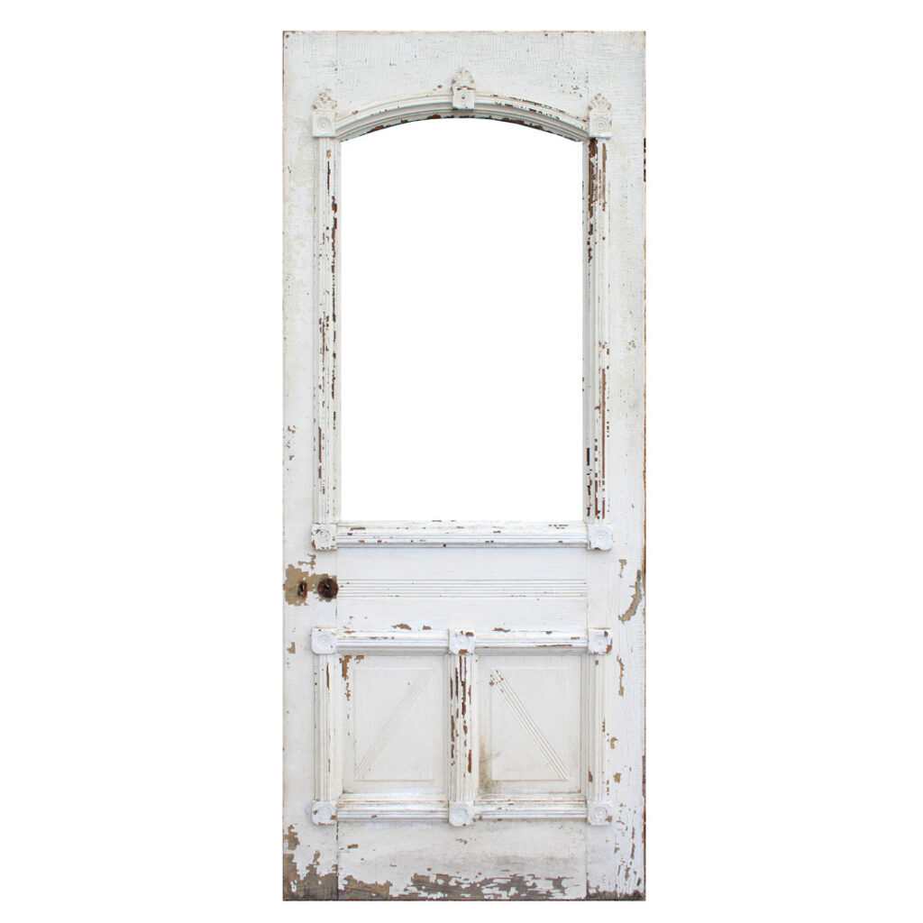 A beautiful antique Eastlake door, dating from the 1880s and salvaged from a home in Indiana. This old door features a half-view arched window, chippy paint, and playful raised trim. The door is in good antique condition with the expected chips, dings, and wear typical of an old door; the glass is missing (as pictured). It measures approx. 32″ wide, 79-1/2″ tall, and 1-3/8″ thick. This door requires a custom shipping quote; please contact us if you have any questions. Coordinating doors can be found under product codes NED2680-RW & NED2669-RW.