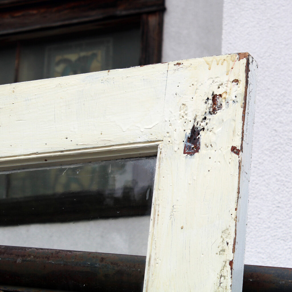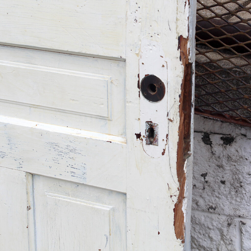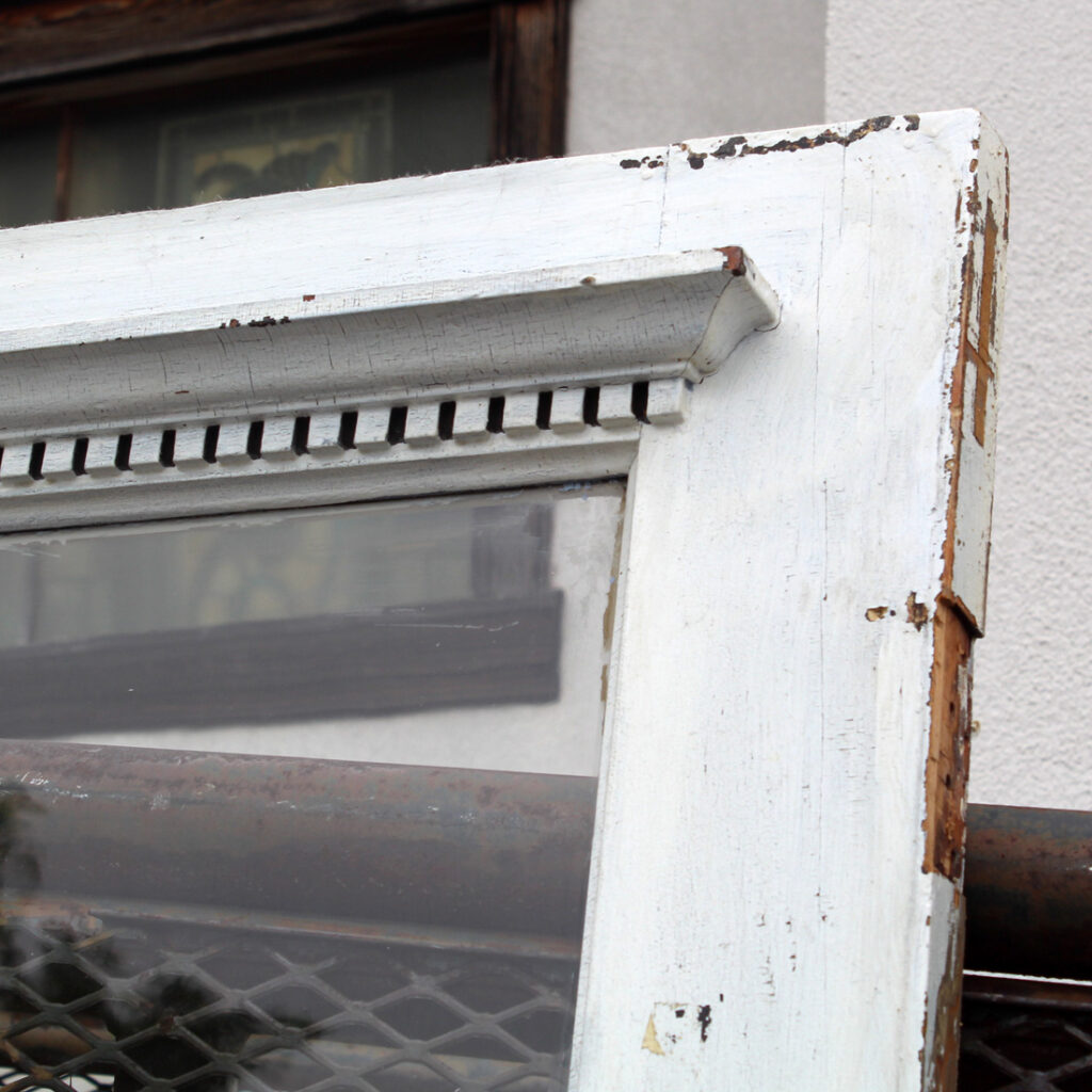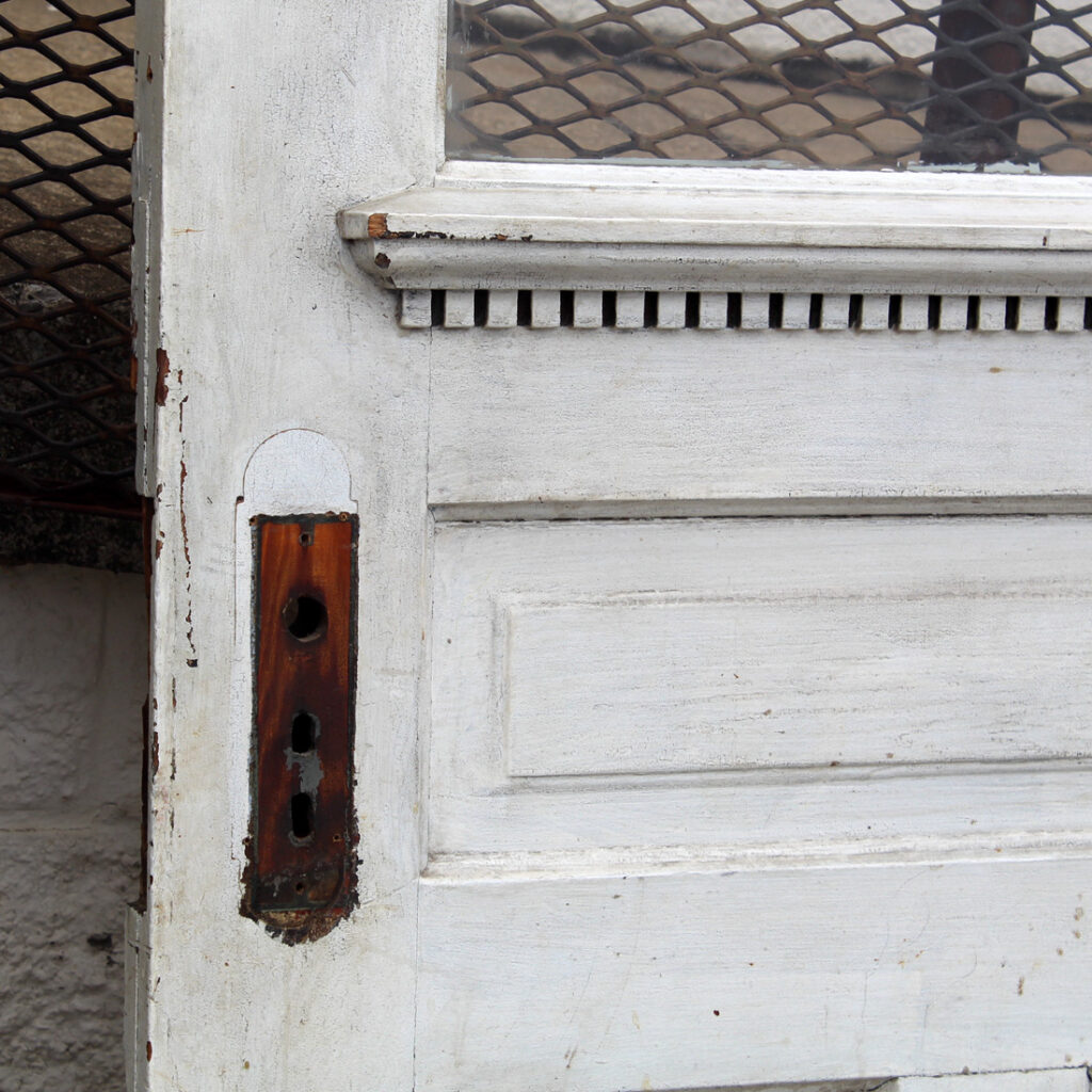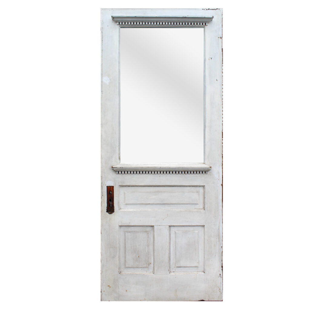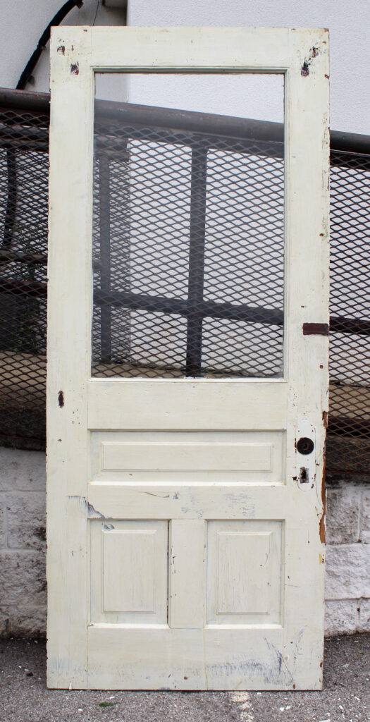 An wonderful antique cottage door, dating from the late 1800’s and salvaged from a home in Louisville, KY. This old door features a half view window surrounded by decorative trim, and perched over a raised wood panel below. It is in good antique condition with the expected chips and dings typical of an old door, as pictured. This reclaimed door measures 33-7/8″ wide, 80-5/8″ tall, and 1-5/8″ thick. It requires a custom shipping quote; please contact us if you have any questions.