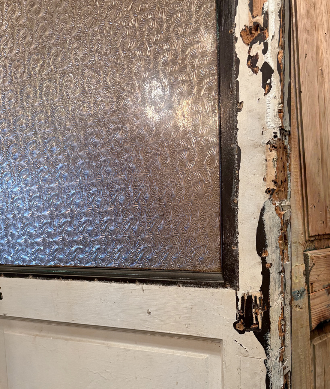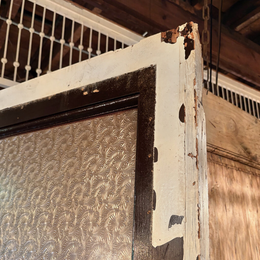 A splendid antique door with a textured glass window, dating from the early 1900s. The door features a half view privacy glass window perched above three raised wood panels below. The door has a chippy painted finish with the expected wear including chips, scratches, and hardware holes (as pictured.) The reclaimed door measures 29-3/4” wide, 89-3/8” tall, and 1-3/4” thick. This door requires a custom shipping quote, please contact us if you’re interested.