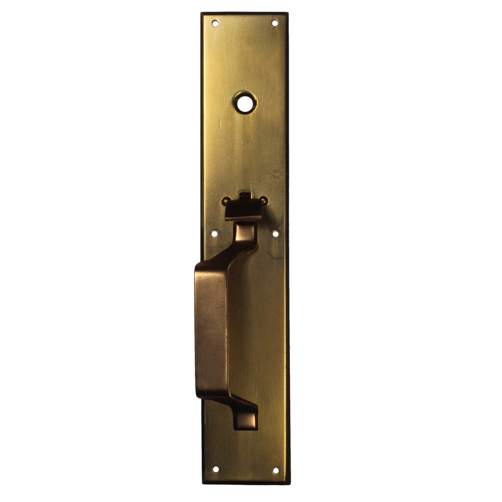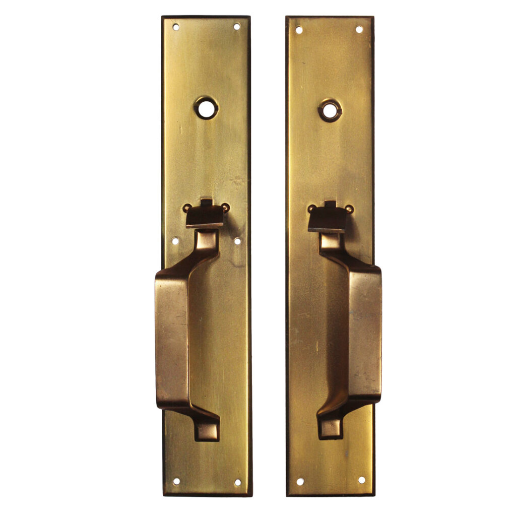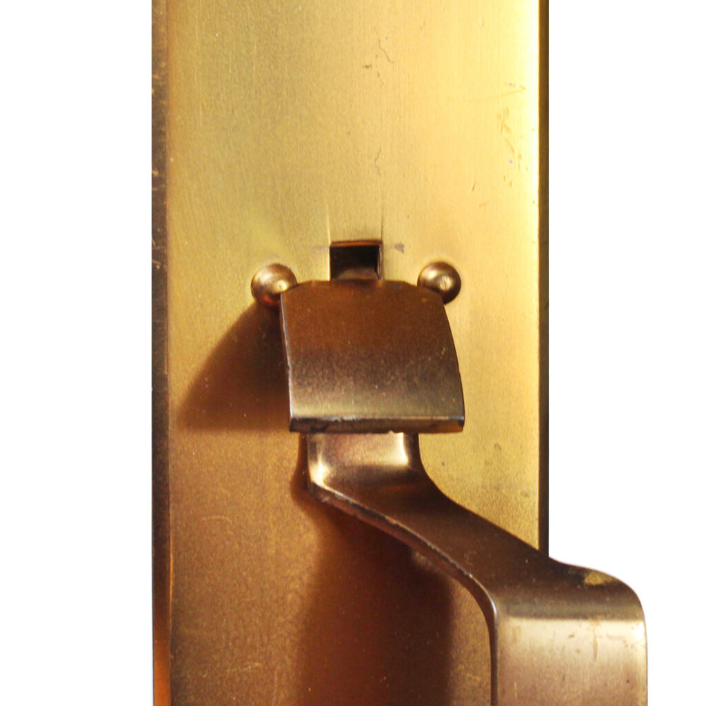 Matching antique exterior brass door pulls, dating from the early 1900’s. Originally salvaged out of Tennessee, each door handle features a sleek back plate with a beveled border and a smooth handle. They are in very good antique condition (as pictured), and each measure 2-3/8″ wide, 12-7/8″ tall, and has a 1-1/4″ projection. THE PRICE LISTED IS FOR EACH HANDLE.