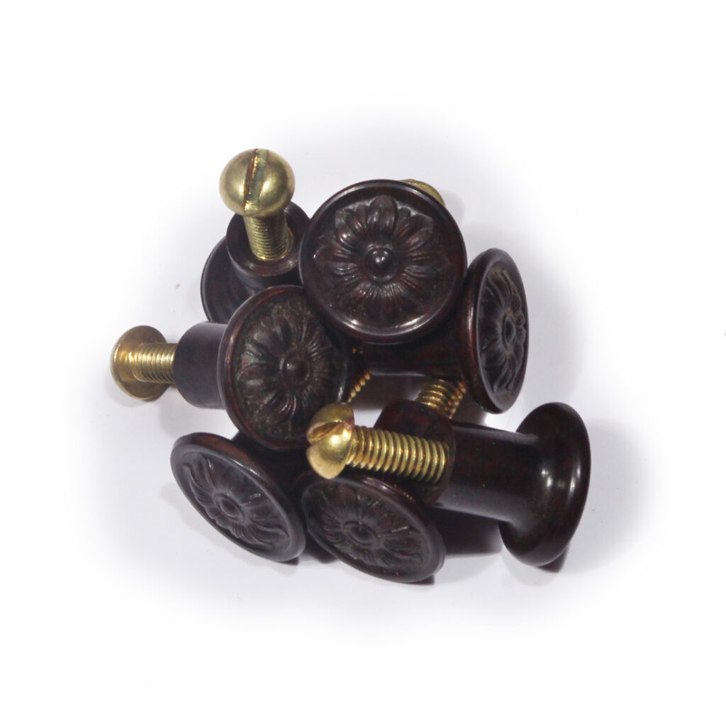 Wonderful petite antique bakelite cabinetry pulls, each featuring a beautiful foliate design. These drawer pulls are in excellent condition, and each measure 5/8″ in diameter and projects 5/8. THE PRICE LISTED IS FOR EACH PULL. If ordering multiple items, please contact us for an accurate shipping quote.