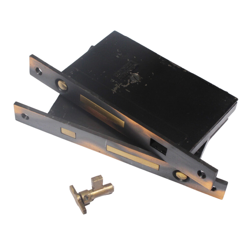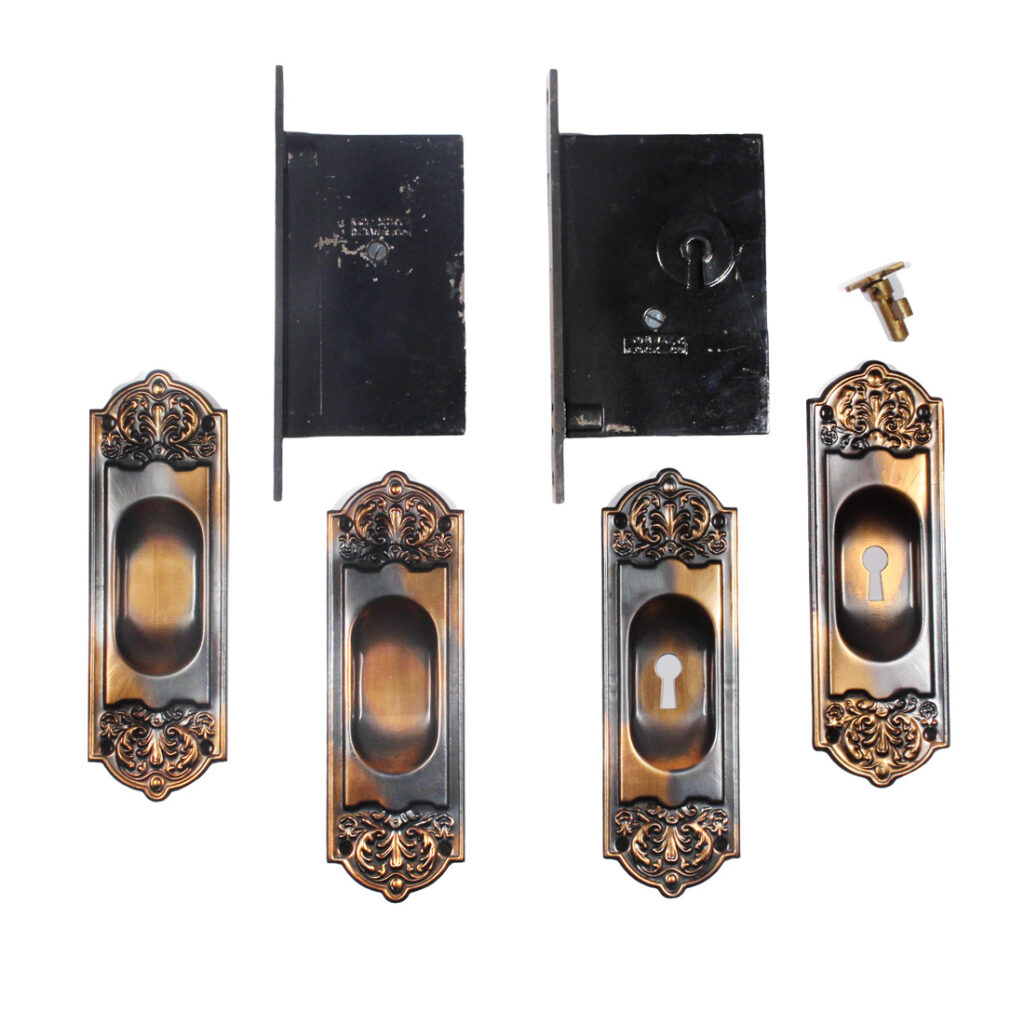 An incredible “New Old Stock” antique pocket door hardware set in Norwalk’s “Turin” pattern, designed for a double door set. The set is in excellent antique condition with a beautiful copper flash over steel finish. The includes four decorative pocket door plates, two pocket door locks, and one skeleton key. The plates measure 2-1/2″ wide by 7-1/2″ tall; the larger lock has a 2-1/2″ backset, and its faceplate is 7/8″ wide and 7-1/2″ tall, and the box portion of the lock is 3-5/8” wide by 5-1/4” tall; the smaller mortise lock box portion of the lock is 3-1/8” wide by 5-1/4” tall.