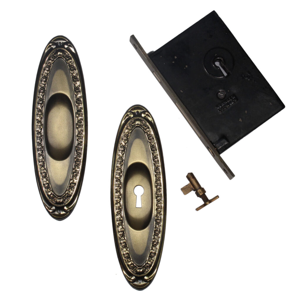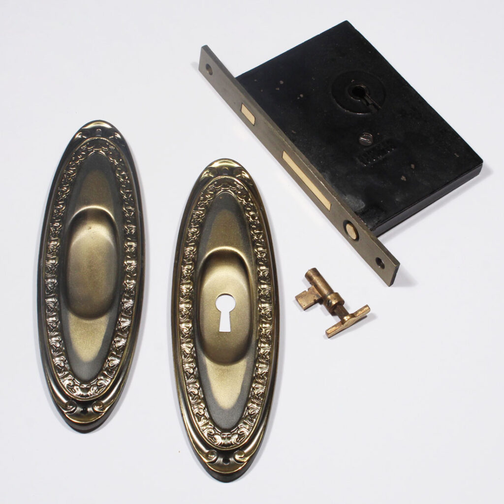 Matching sets of “New Old Stock” antique brass pocket door hardware set in Norwalk’s “Nautes” pattern, dating from 1900 and designed for a single door. Each set includes two pocket door plates, one pocket door lock, and one skeleton key. The plates measure 2-3/8″ wide by 8″ tall; the lock has a 2-1/2″ backset, and its faceplate is 7/8″ wide and 7-1/2″ tall, and the box portion of the lock is 3-5/8” wide by 5-1/4” tall. THE PRICE LISTED IS FOR EACH SET.