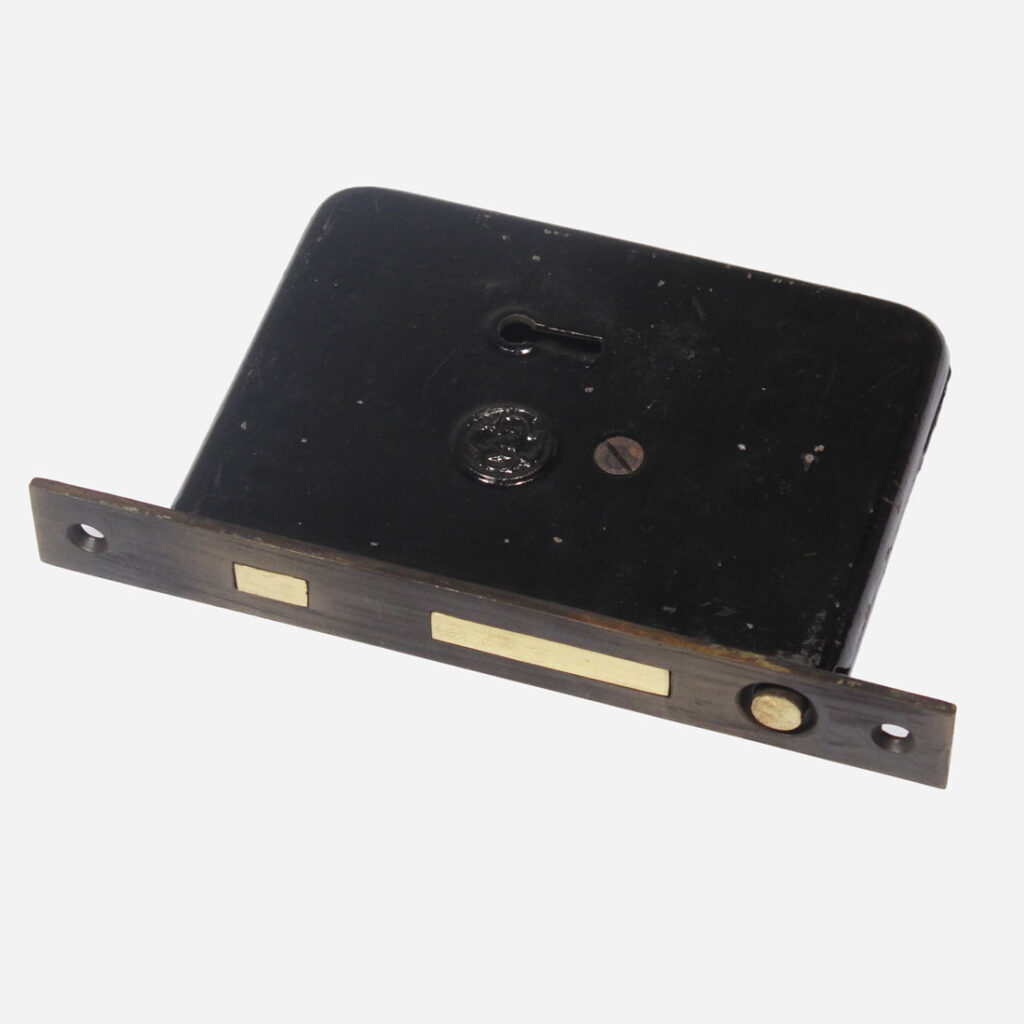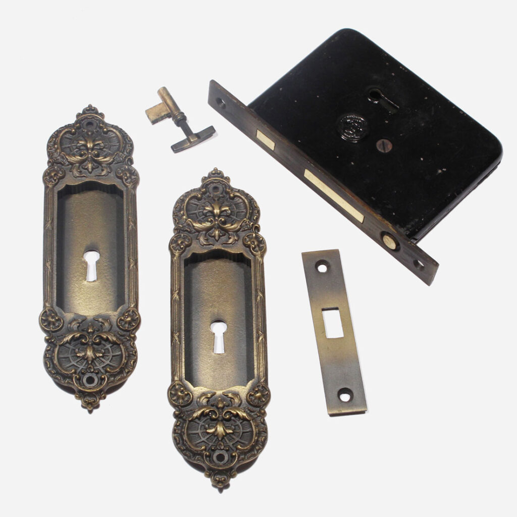 A stunning antique cast brass “New Old Stock” pocket door hardware set in Yale’s “Gordian” pattern, dating from 1900 and designed for a single door. Each set includes two pocket door plates, one pocket door lock, one receiving plate, and one skeleton key. The plates measure 2-1/4″ wide by 7-7/8″ tall; the lock has a 2-13/16″ backset, and its faceplate is 15/16″ wide and 7-1/8″ tall, and the box portion of the lock is 4” wide by 5-3/8” tall.