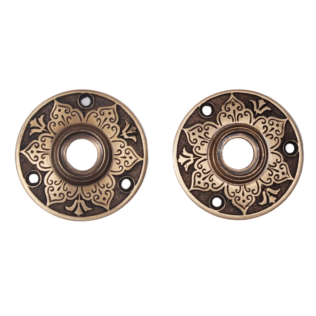 A gorgeous antique cast bronze door hardware set in Corbin’s “Leaf Pattern” design. Patented in 1881, this door hardware features an elegant foliate design, and has a gorgeous two-tone bronze finish. The door knobs measure 2-1/2″ in diameter and 2-1/4″ deep; the round escutcheons are 2-1/4″ in diameter. The set includes a pair of doorknobs with the connecting rod and set screws, and a pair of round escutcheons (enough hardware for one door).