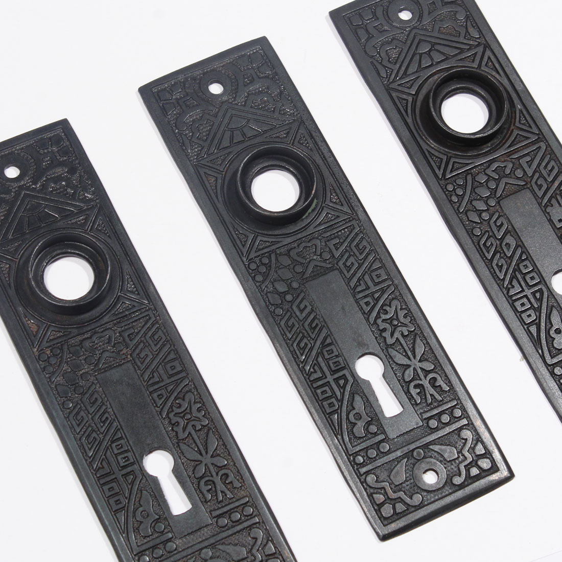 Lovely antique cast iron “Ceylon” door plates by P.F. Corbin. Patented in 1895 and produced until 1905, these door plates feature an unusual asymmetrical design with stylized foliates and geometric details. The plates are 1-5/8″ wide by 5-1/2″ tall. THE PRICE LISTED IS FOR EACH PLATE. If you are ordering multiple items, please contact us for an accurate shipping quote.