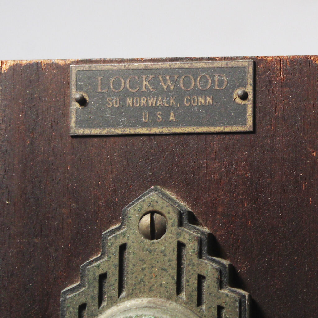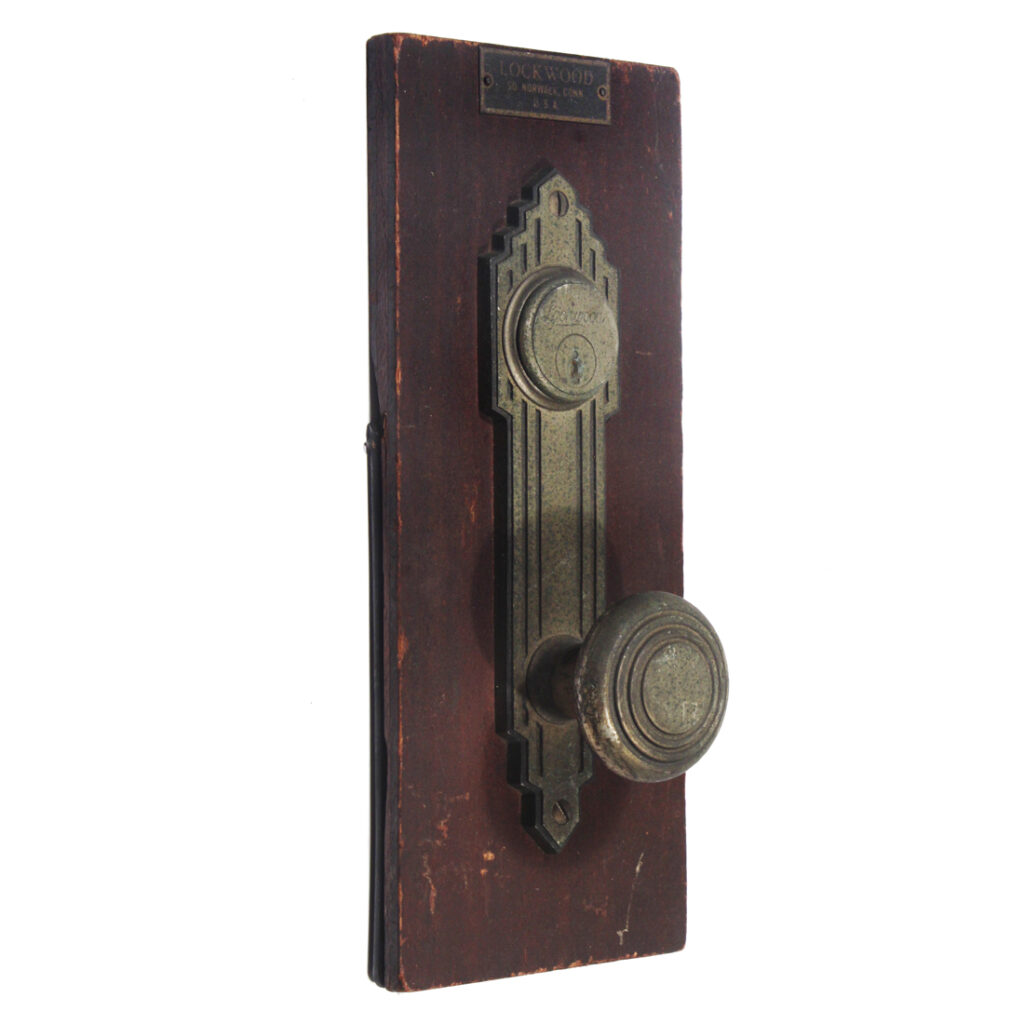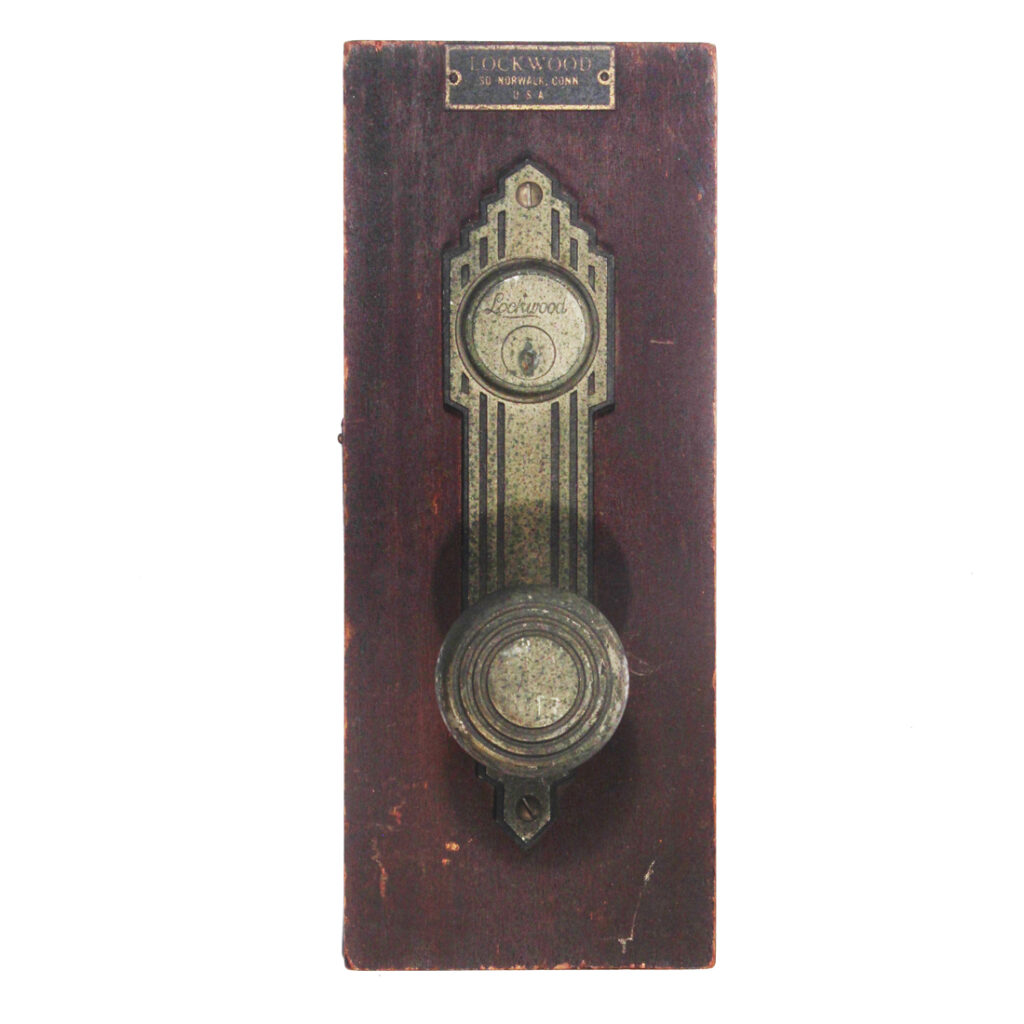 Salesman samples were often made by manufacturers to show potential buyers the design, functionality, and quality of their products. The sample is mounted on a wooden backing, typical of salesmen’s presentation boards. The wood is dark and polished, providing a rich contrast to the finish of the hardware. The mounting board serves to showcase the item, making it easy to see how the hardware would look when installed.