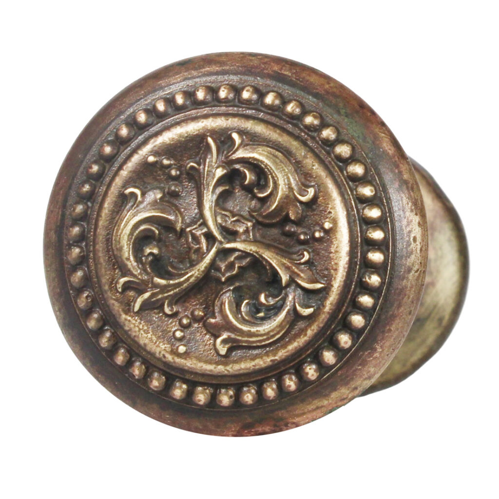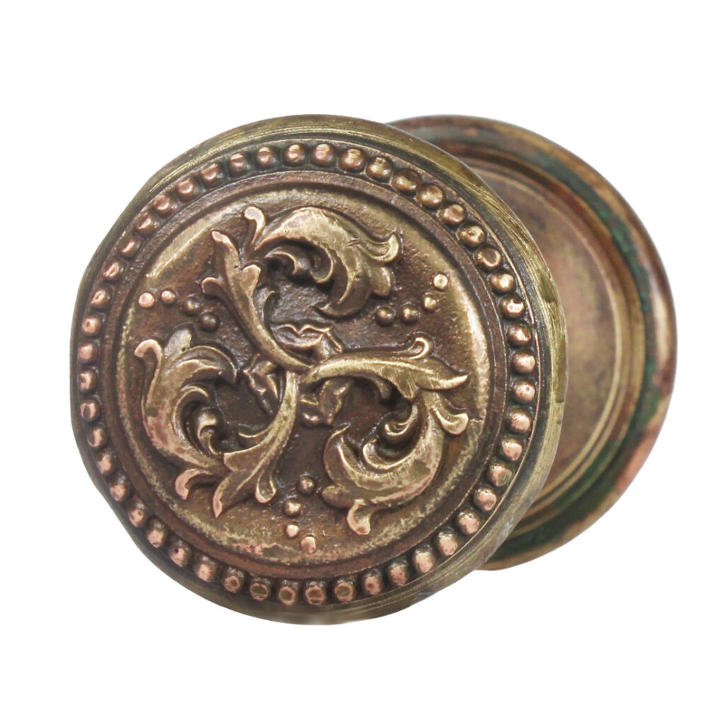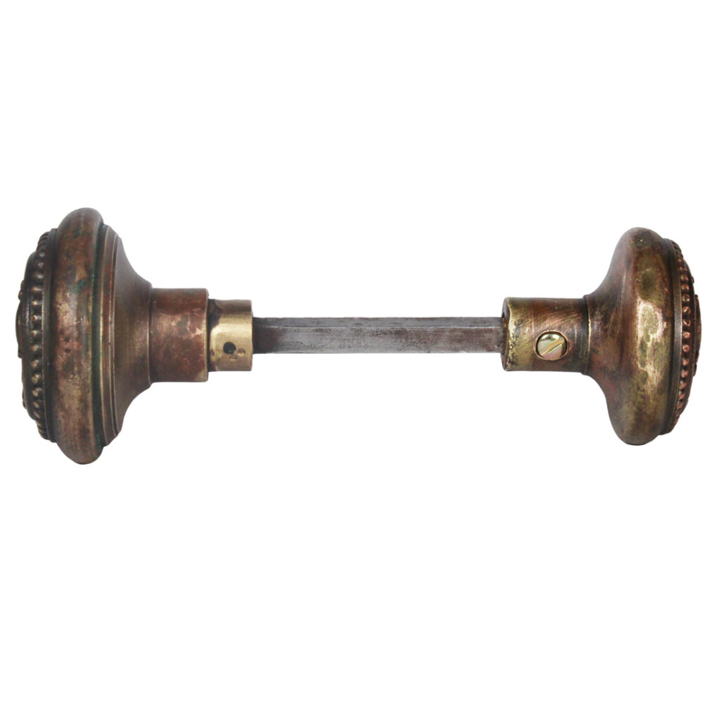 An incredible antique bronze exterior doorknob set by Russell & Erwin in their “Harrington” pattern, circa 1899. These doorknobs feature a three-fold design of volutes with a beaded border. The doorknobs have a wonderful aged bronze finish, and are in very good antique condition; They include the connecting spindle and set screws. The larger knob measures 2-1/2″ in diameter and is 2-1/8″ deep; the smaller interior knob measures 2-1/8″ wide by 1-3/4″ deep.