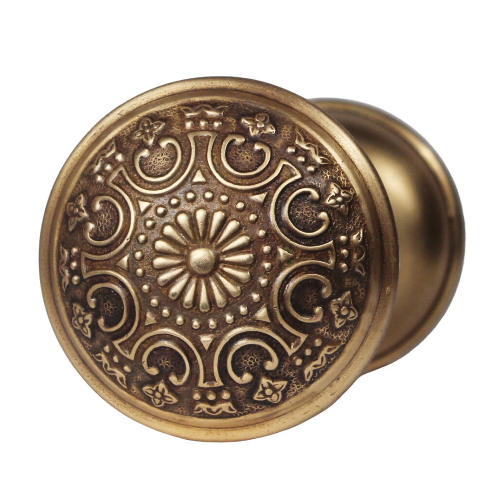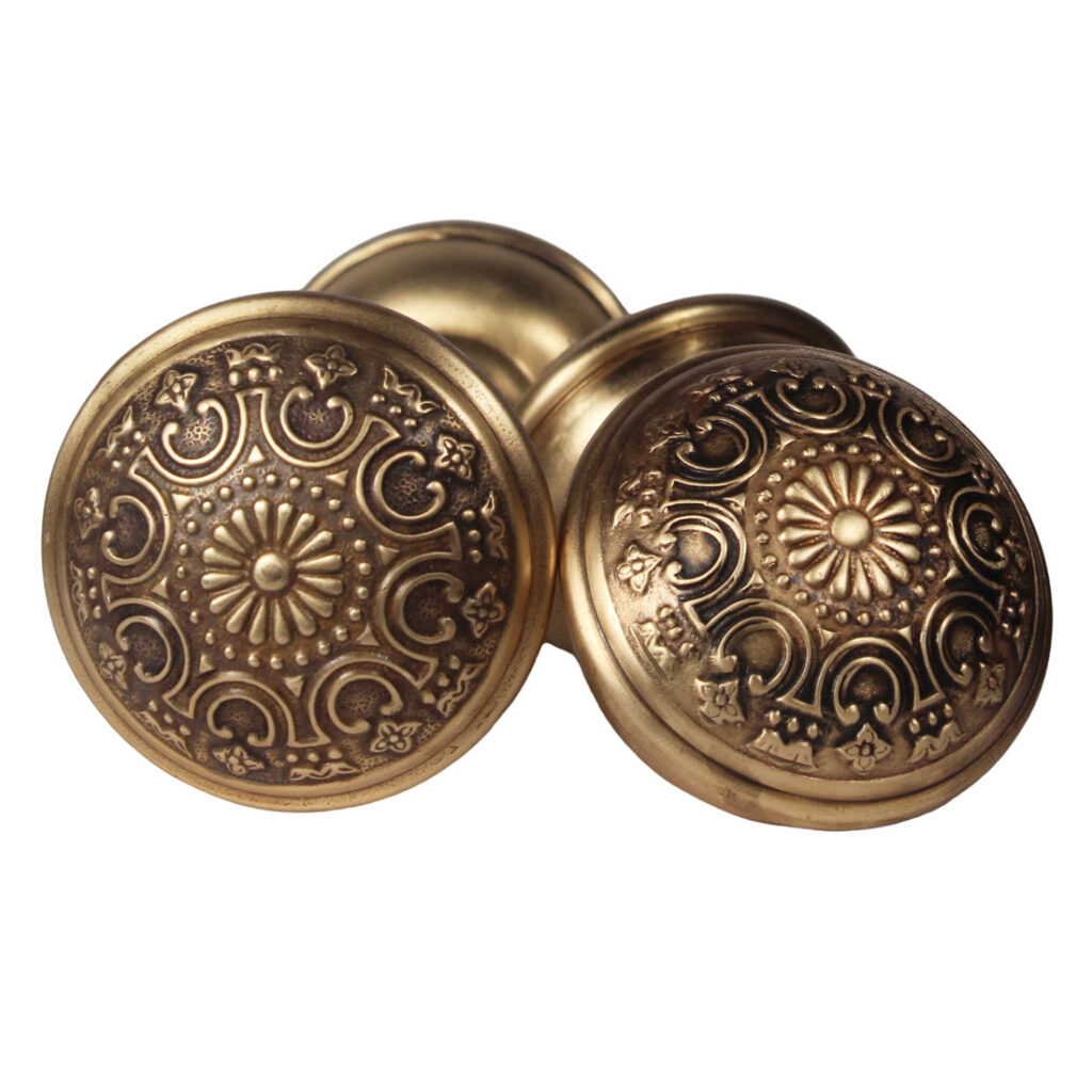 Fabulous matching antique cast bronze door knob sets by Yale & Towne, in their “Etrurian” pattern. Dating c. 1899, each beautiful knob set features a beautiful 8-fold design, and are each in good antique condition with a beautiful aged patina (as pictured). THE PRICE LISTED IS FOR EACH KNOB SET. A set includes two knobs with the connecting spindle, and set screws (enough hardware for one door.) Each knob measures 2-3/8” in diameter by 2” deep. If ordering multiple items, please contact us for an accurate shipping quote.