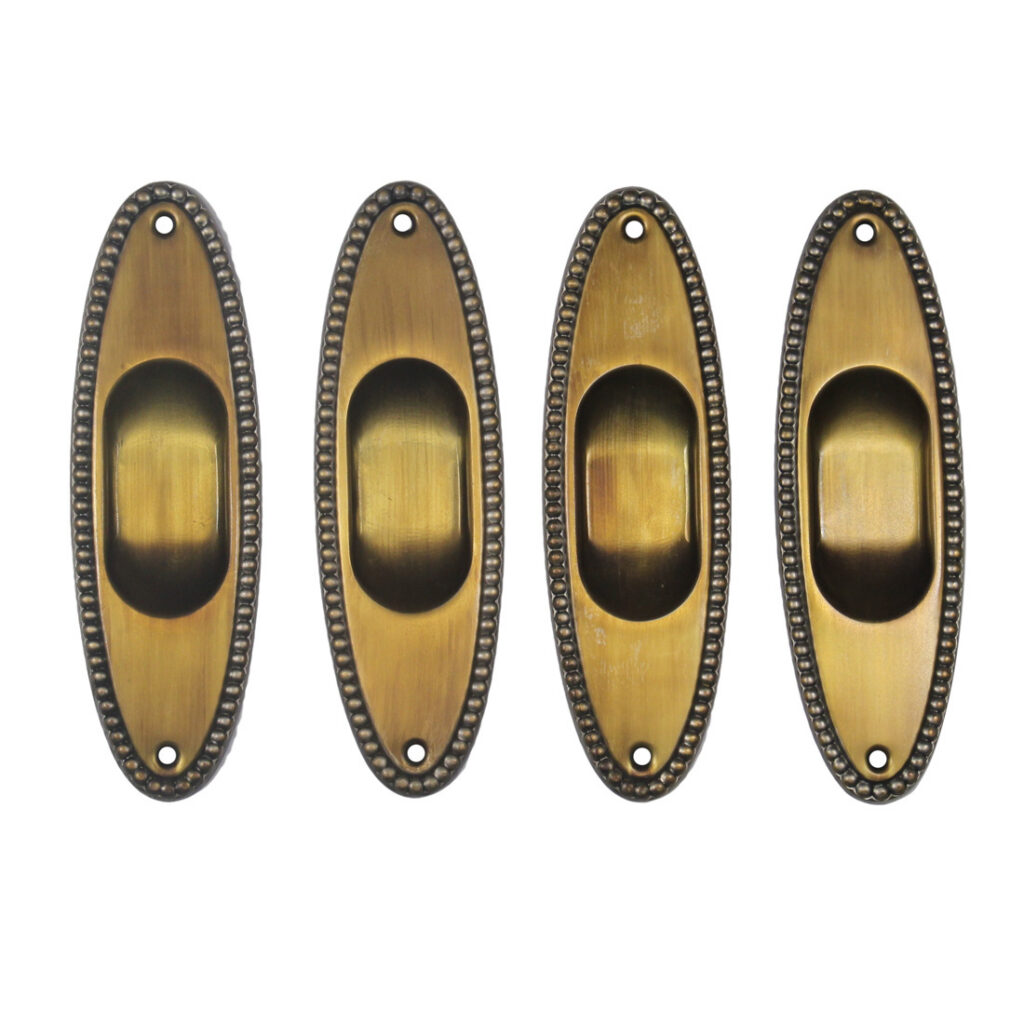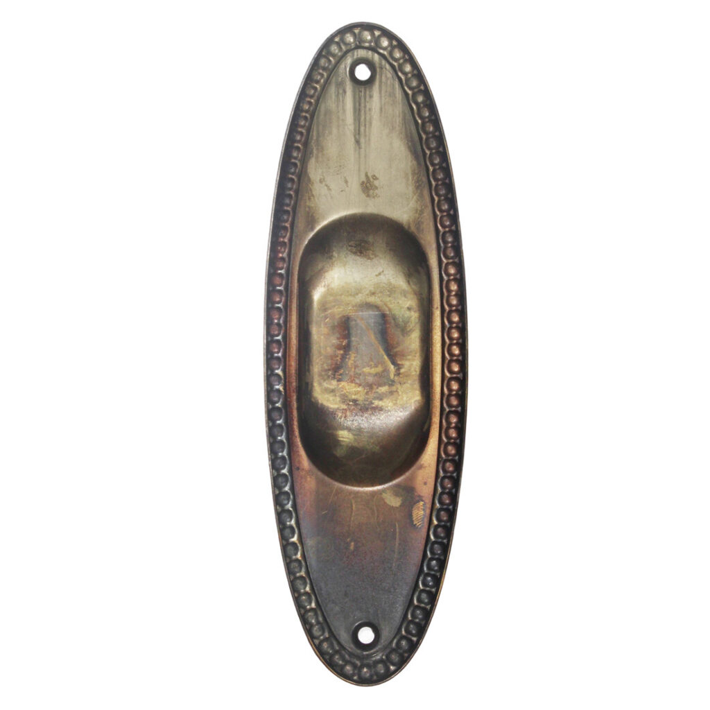 Antique pocket door plates in the “Revere” pattern by Norwalk, dating from the early 1900’s. These oval pocket door plates feature a fabulous aged finish, and are suitable for any pocket door, sliding door, or barn door on a track. Each plate measures 2-1/4″ wide by 7-3/8″ tall. THE PRICE LISTED IS FOR EACH PLATE. If ordering multiple items, please contact us for an accurate shipping quote.